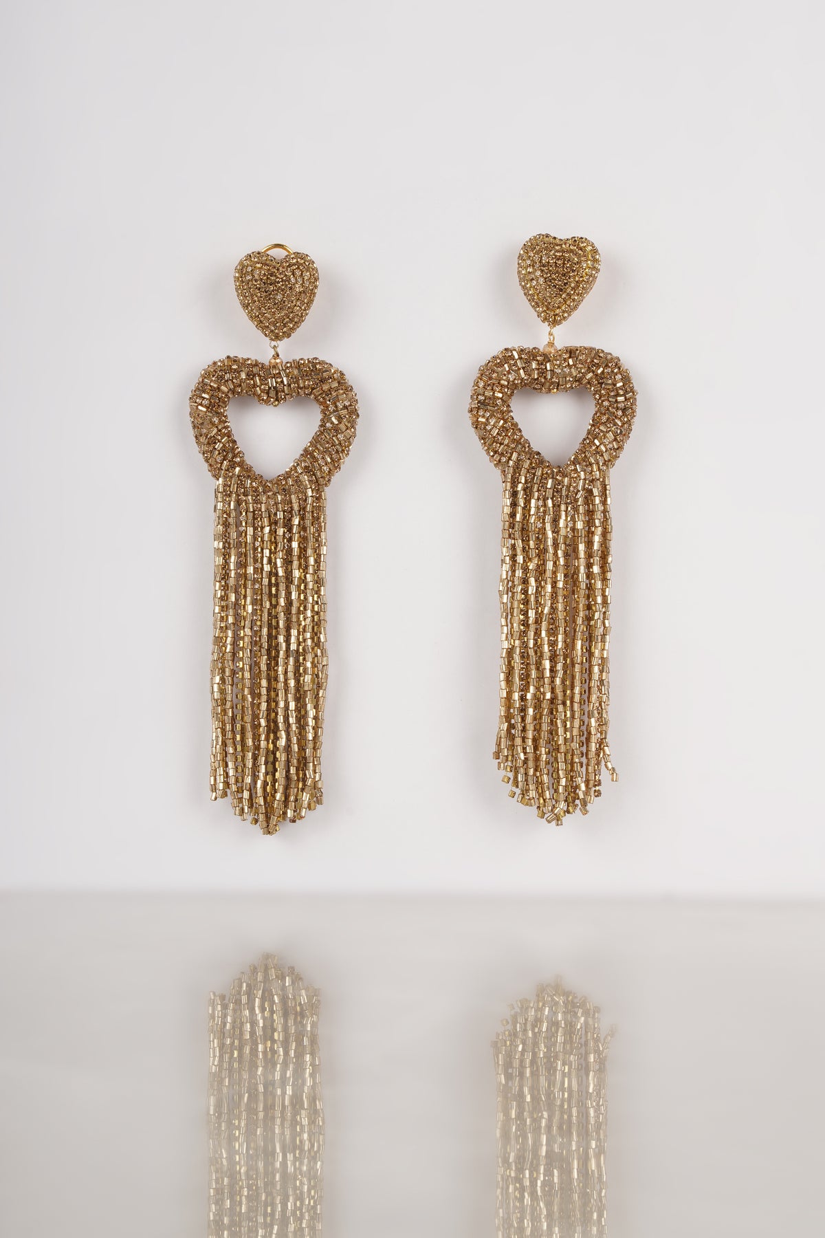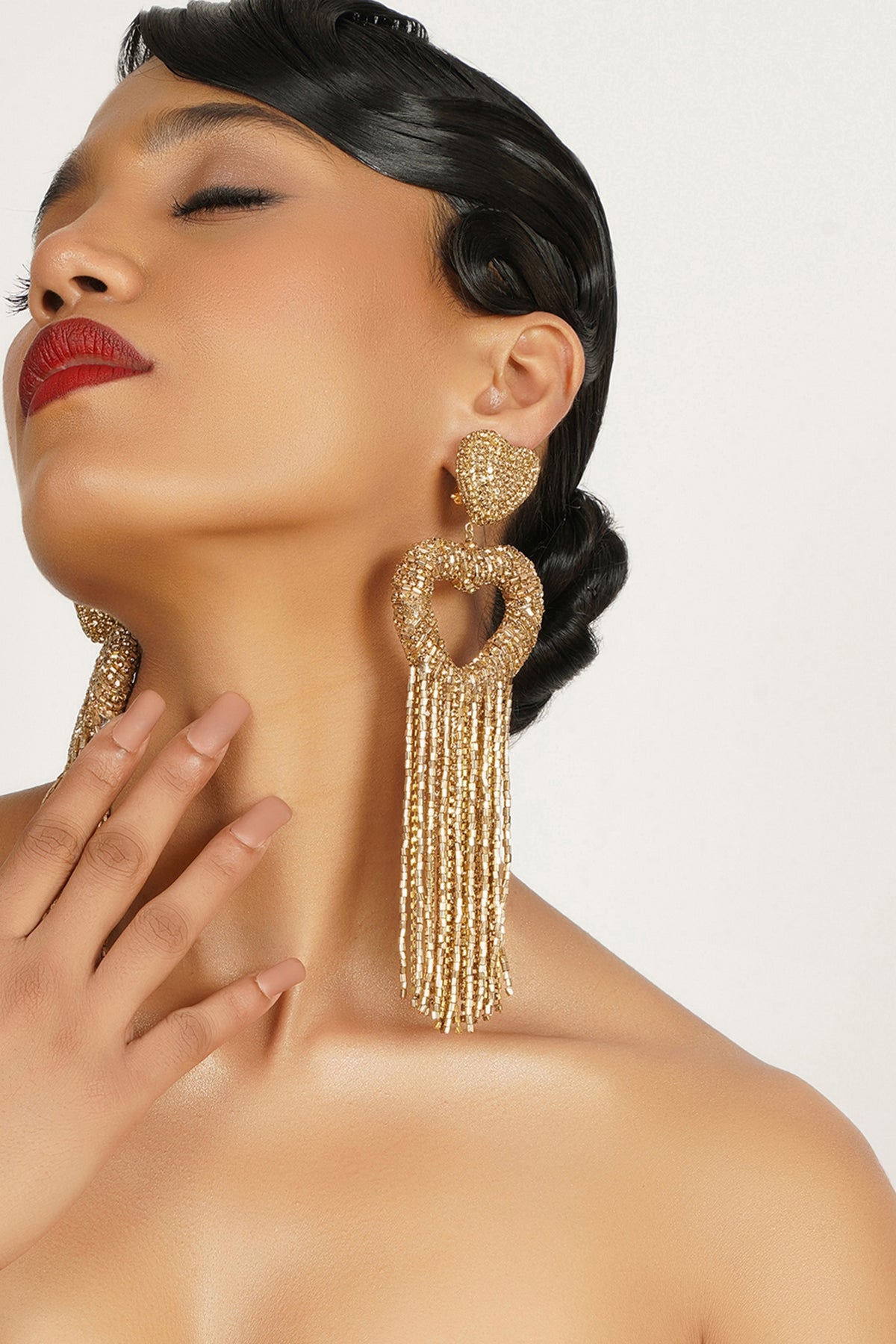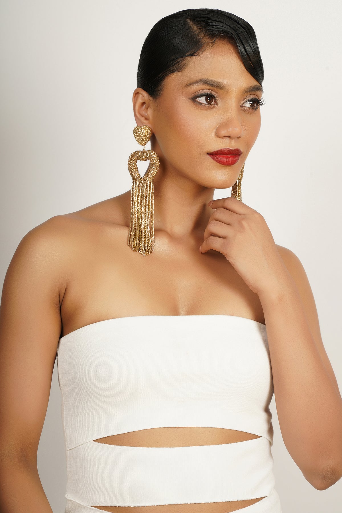 Embrace romance with our "Golden love sparklers" heart-shaped dangler earrings, a symbol of timeless elegance and affection. Crafted with exquisite crystal stones and dipped in a luxurious gold hue, these earrings add a touch of glamour and sophistication to any ensemble. The heart-shaped design captures the essence of love and passion, making them an ideal accessory for special occasions and heartfelt moments. These earrings seamlessly blend the sparkle of crystals with the warmth of gold, creating a statement piece that effortlessly enhances your style. Elevate your look and celebrate love with these versatile and chic earrings, perfect for weddings, anniversaries, or romantic evenings. Shop now and experience the epitome of elegance.Ā