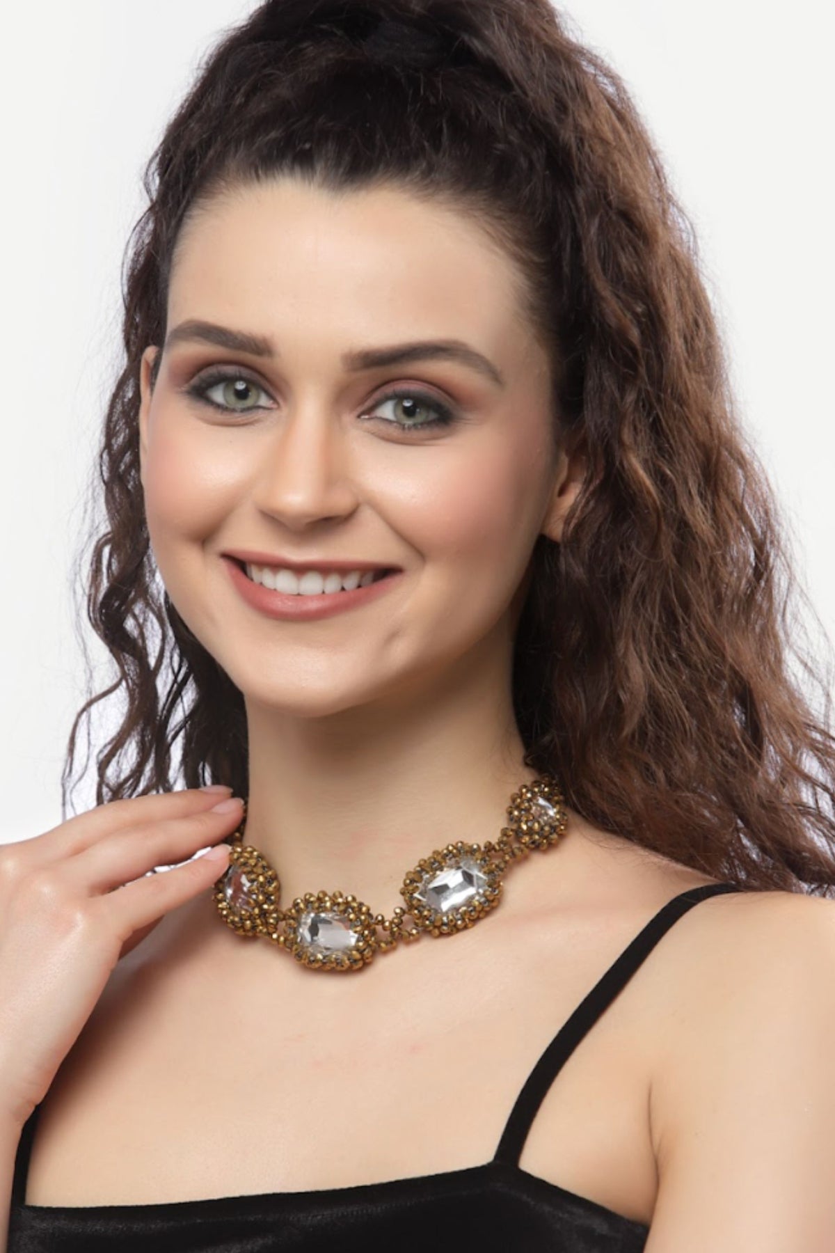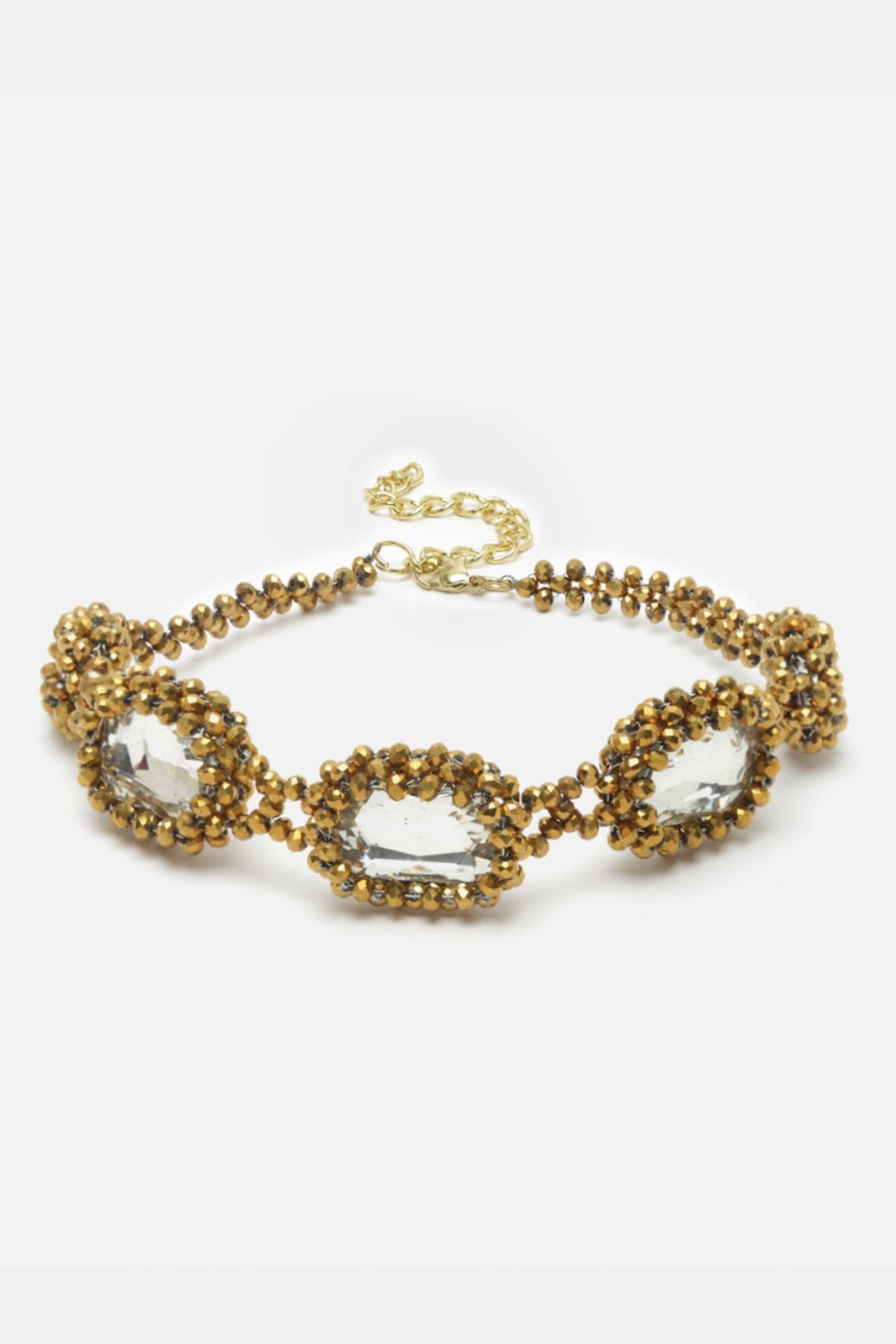Gold Link Chain Necklace with Faceted beads and crystal stones in the center