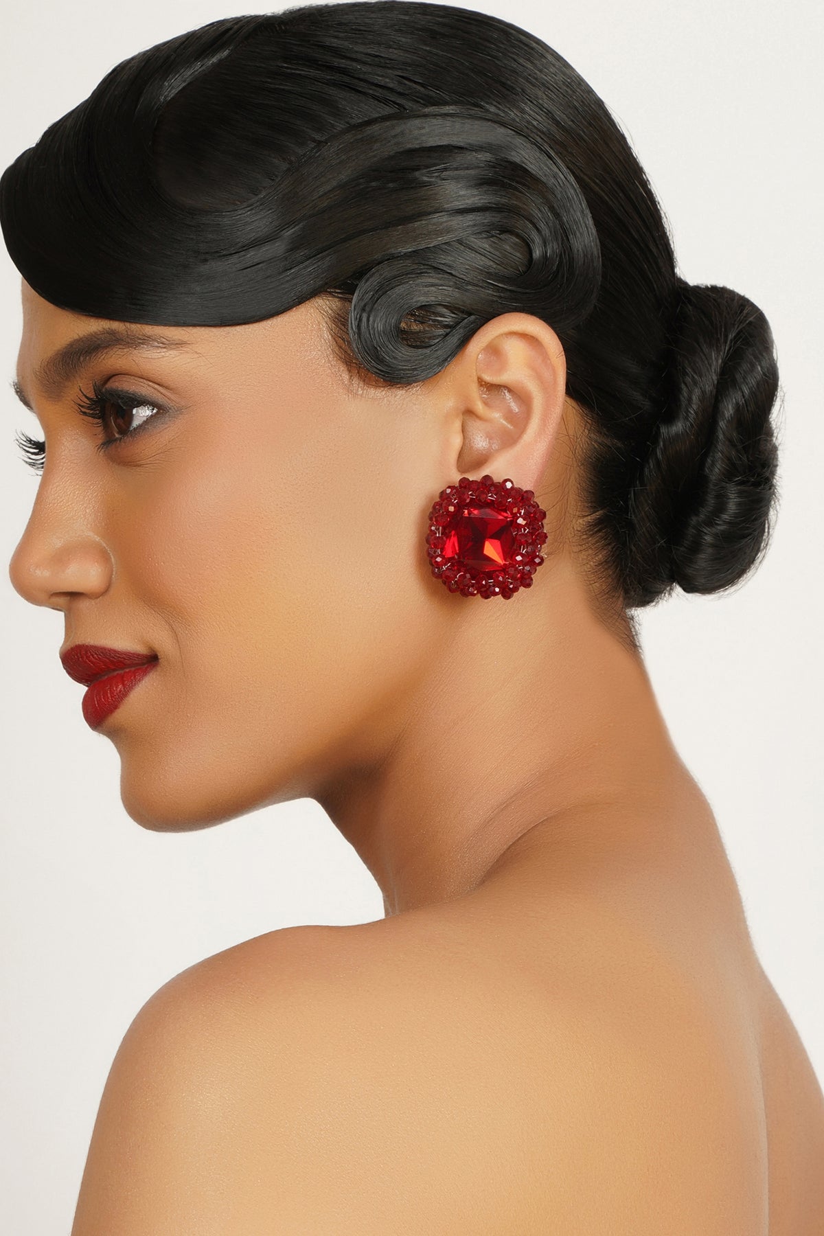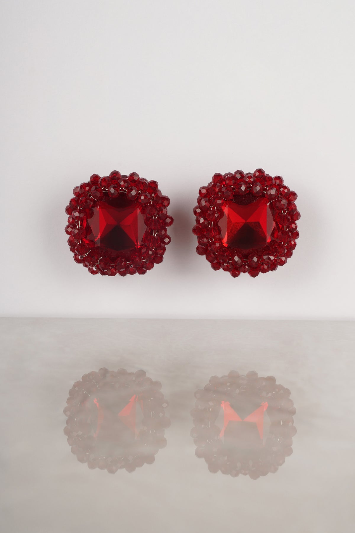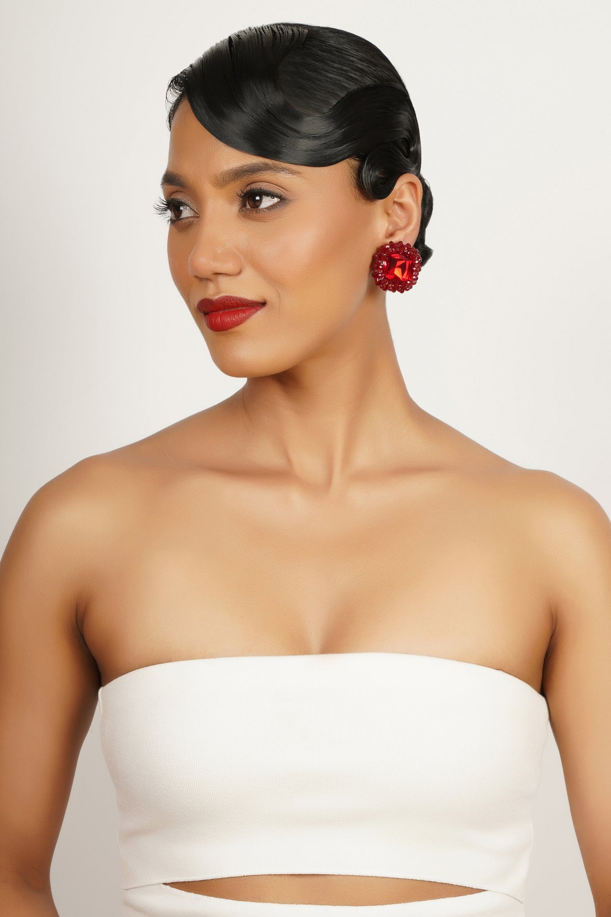 Introducing our "Ruby studs," a symbol of timeless elegance and sophistication. Crafted in a captivating diamond shape and adorned with radiant red crystal stones, these studs add a pop of vibrant color to any outfit. Elevate your style effortlessly, whether it's for formal occasions or adding glamour to your daily look. The rich red hue and intricate crystal craftsmanship make these studs a statement piece for any event. Ideal for making a bold statement, these earrings are perfect for enhancing your allure and confidence.Ā