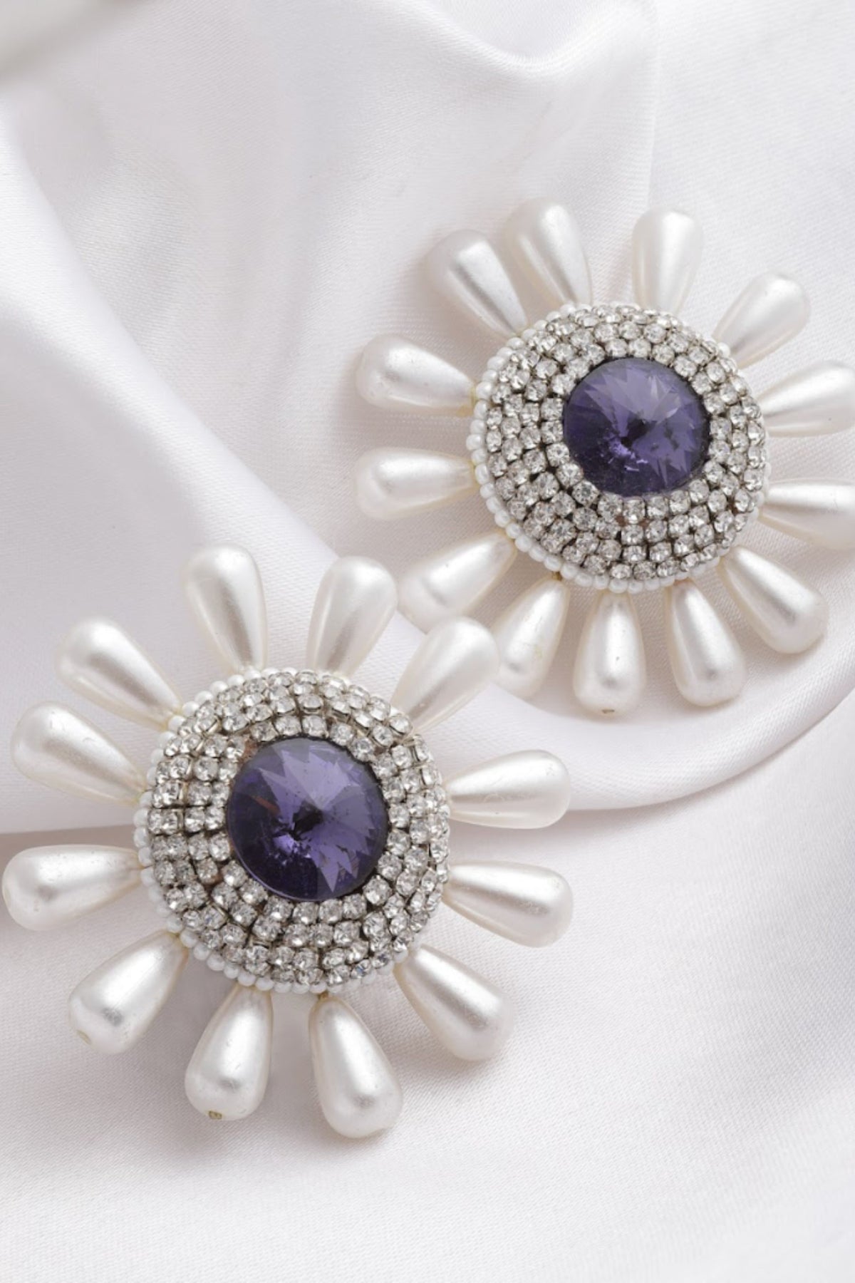 Sunshine earrings with pearls, encrusted crystals and amethyst crystal in the middle