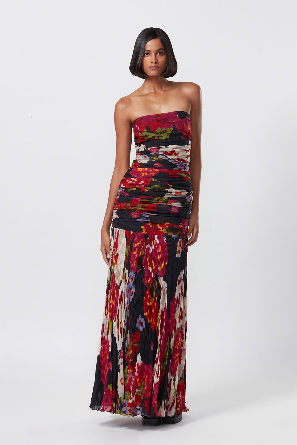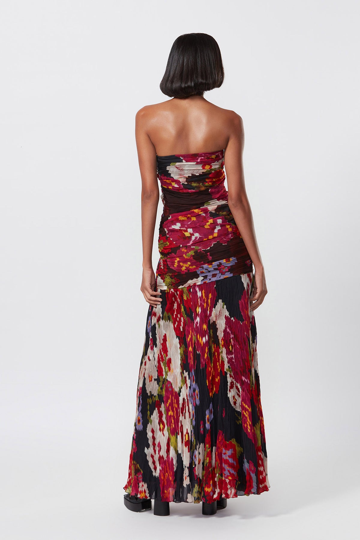 Abstract floral print hand micro pleated strapless gown