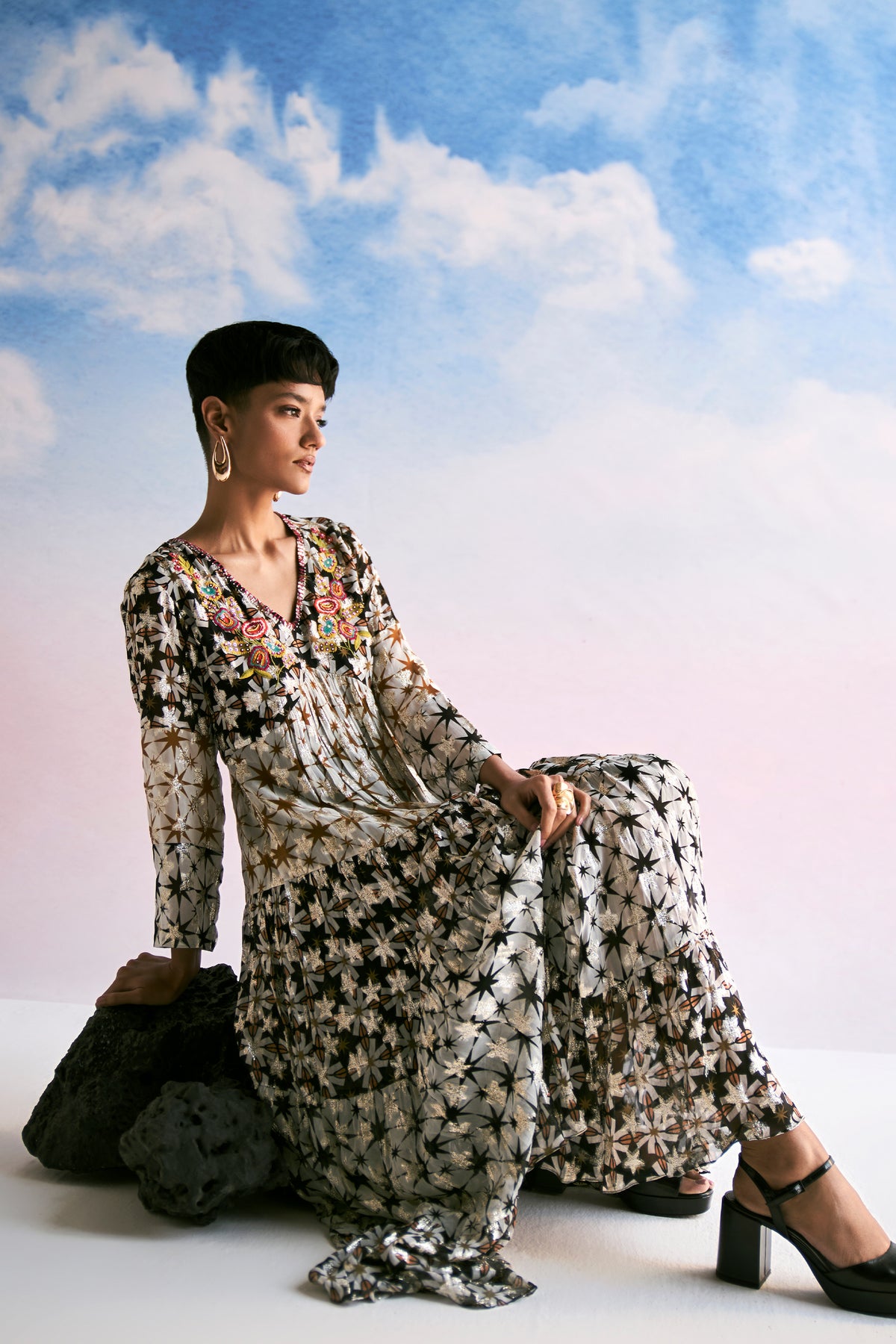 Tiered lurex kaftan with embroidered beaded yolk