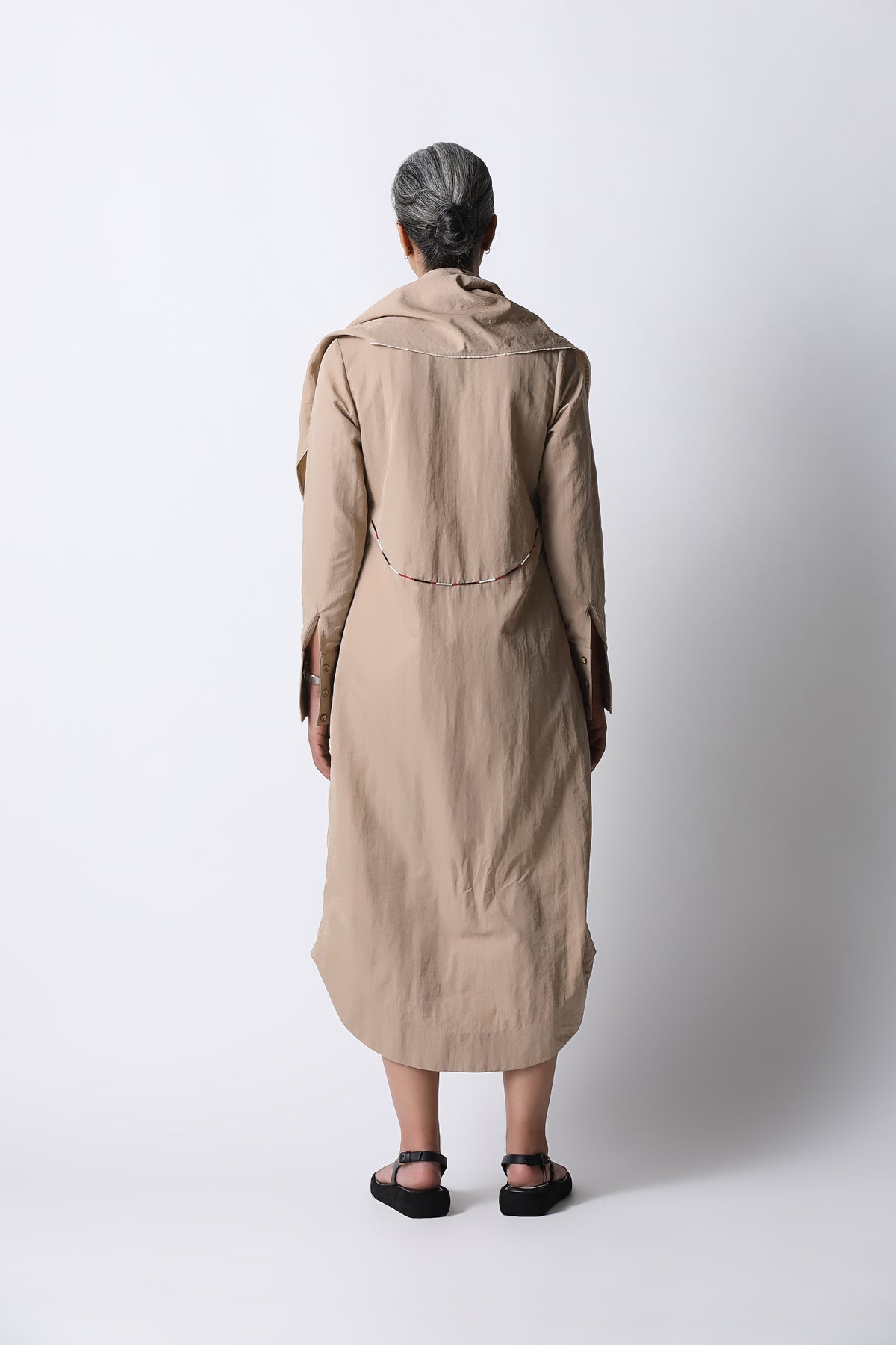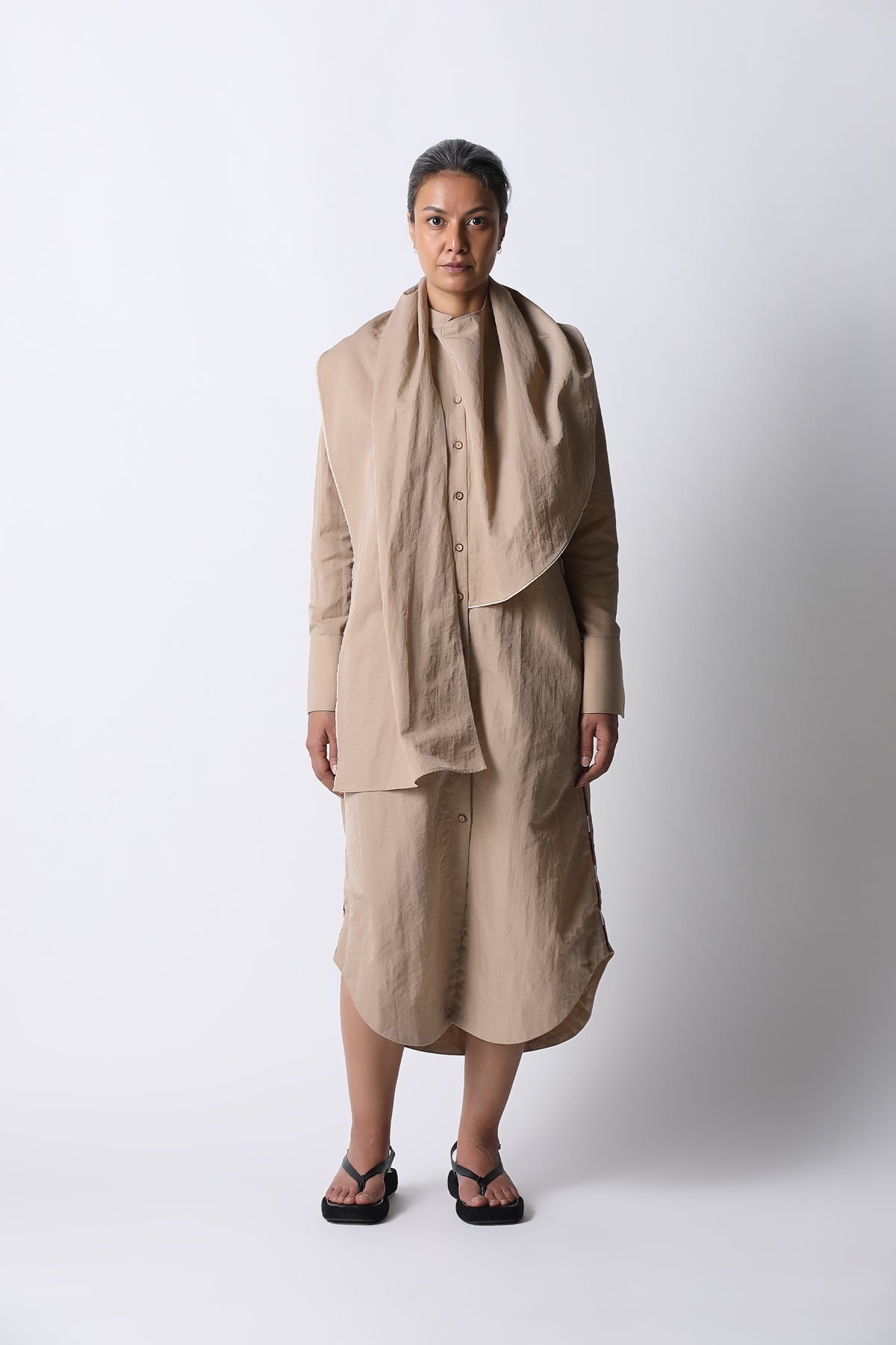 The scarf dress is a relaxed fit shirt dress with the front panel extending into a scarf that drapes around your neck. It is mid calf length and has full sleeves. The dress is enhaced with curved seams and delicate hand embroidered beads along them. Wear it as is or you can also slip it on over pants or jeans