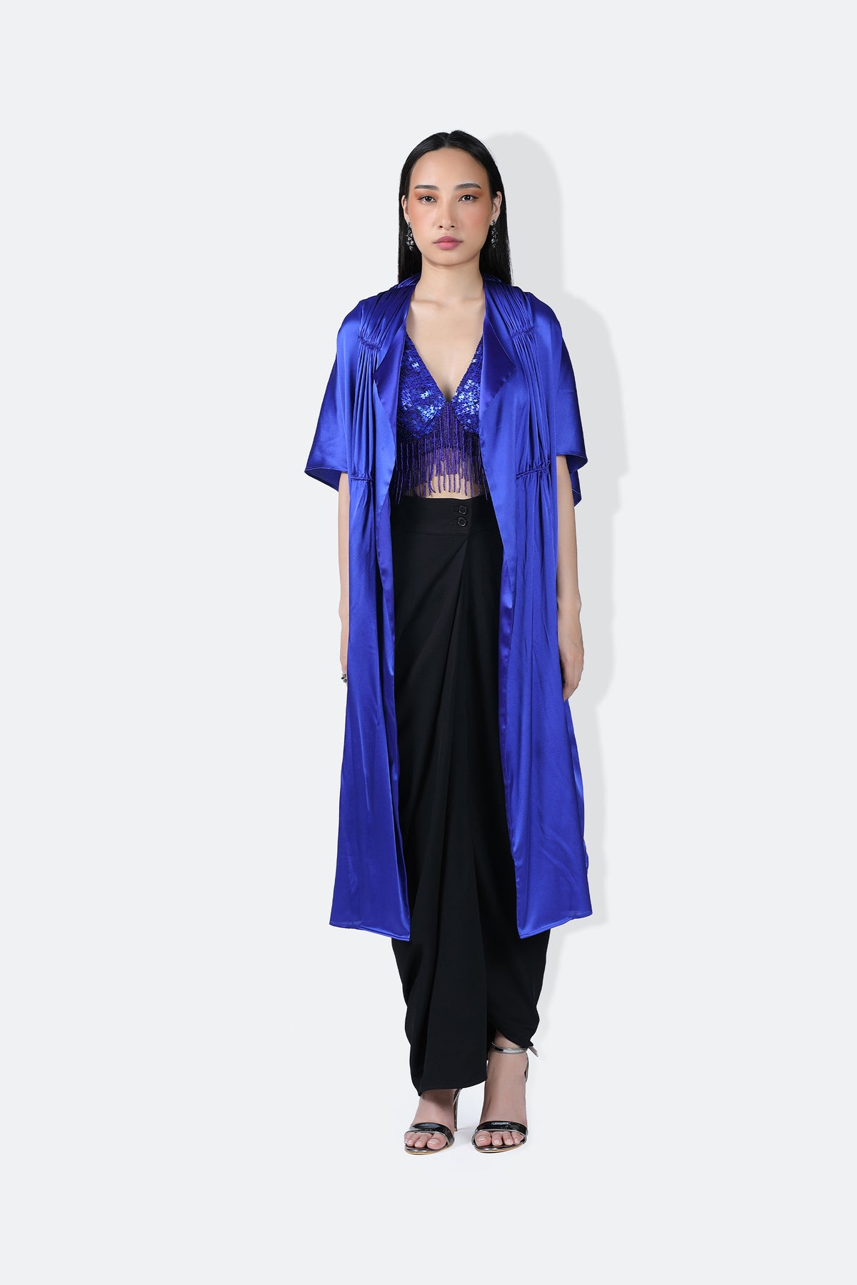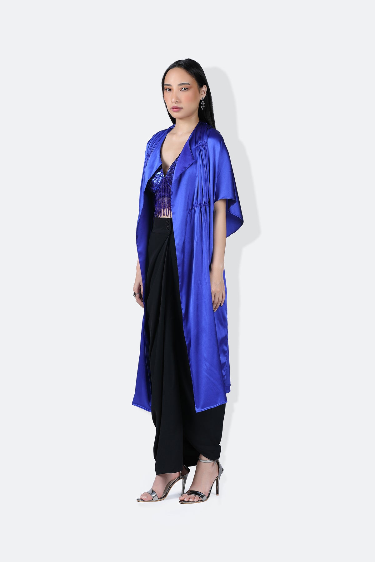 Our alexa cape handcrafted statement cape detailed with gathers on the front and back . Detailed with a notch lapel which makes it sit comfortably over your body. Wear it over your saris or your draped skirt for that extra bling and drama