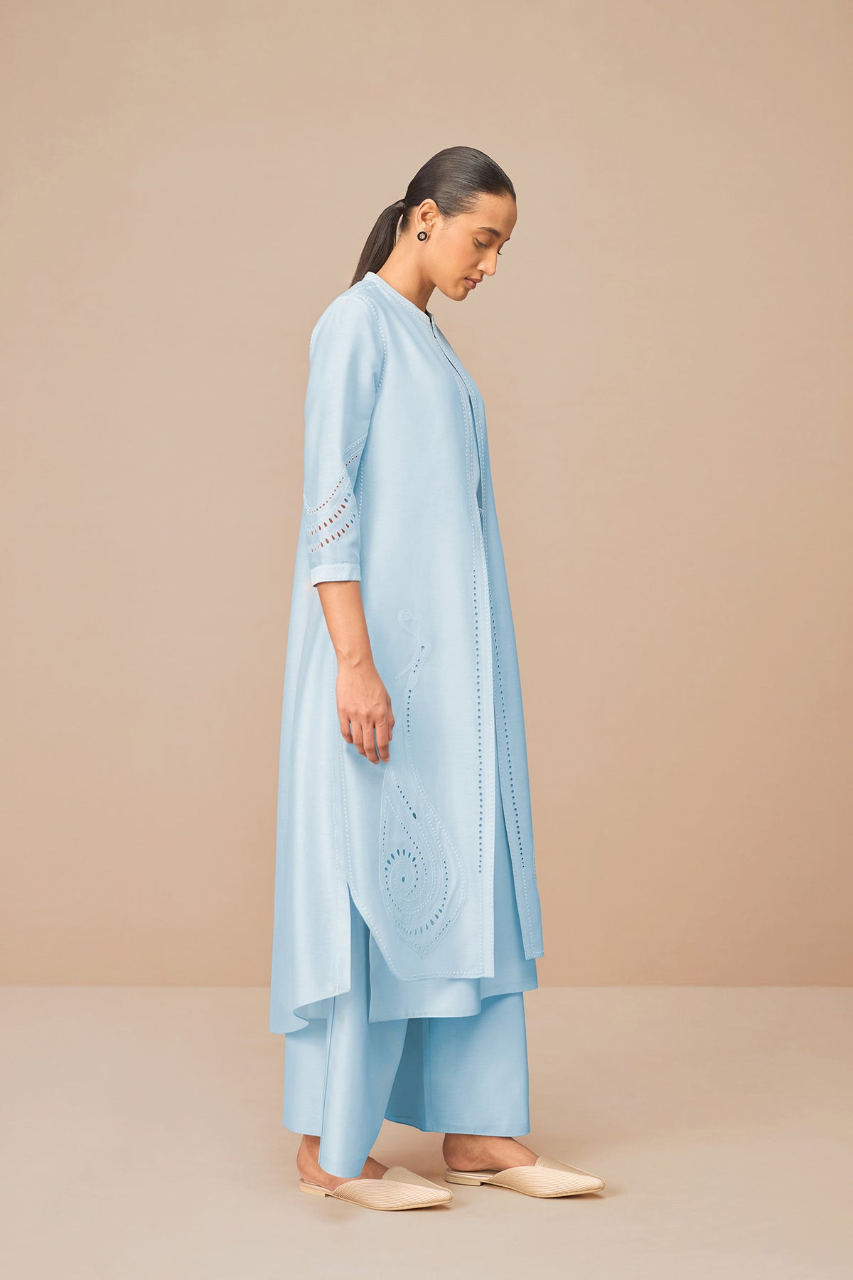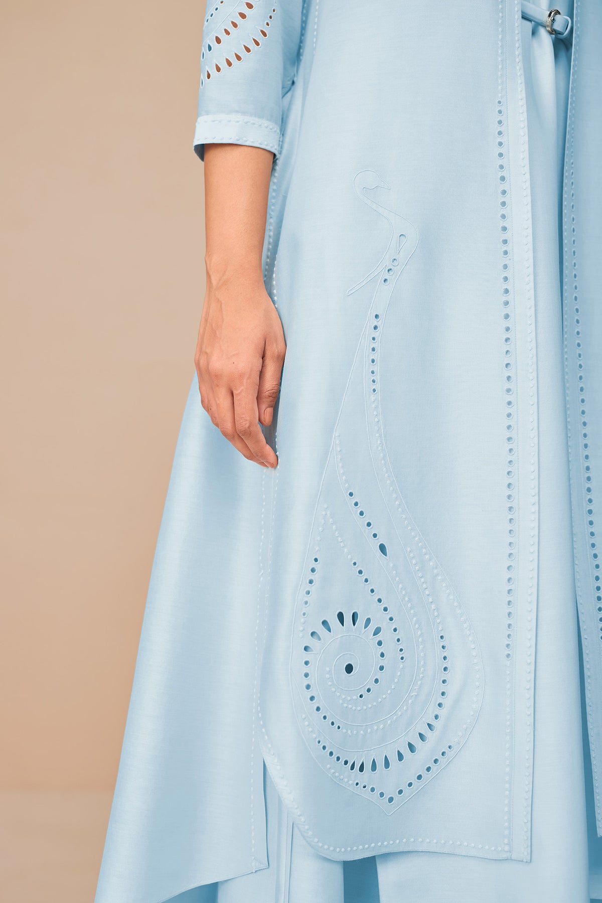 The gentle shimmer of ice blue chanderi (cotton silk) offset by precise dori embroidery makes anais an expression of ampm’s modern indian vision. The jacket set consists of four pieces – a breathable, slightly sheer jacket with embroidered peacock motifs and intricate cut-work detailing. An inner tunic and palazzo pants in the same fabric and a thin faux leather belt in ice blue to cinch it all together.