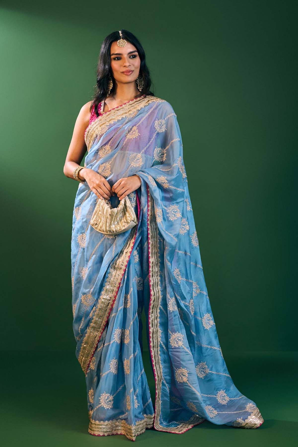 Mulmul Kesa Organza Steel Blue Saree indian designer wear online shopping melange singapore