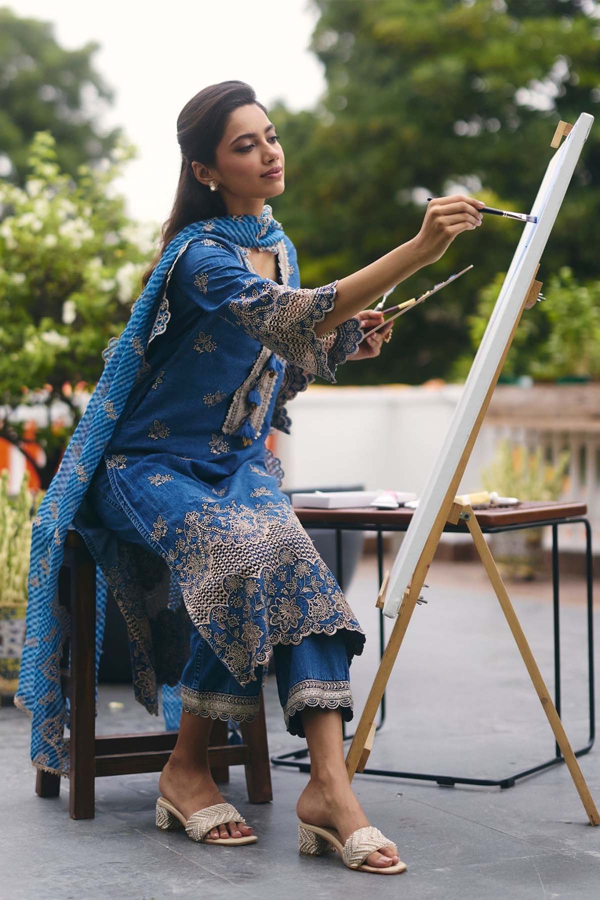 A unique twist on festive wear; this kurta set in denim cotton fabric features intricate embroidery and comes with matching pants. Styled with a striped organza dupatta, it blends tradition with a contemporary edge. In every size, the top and bottom lengths are an additional half inch.