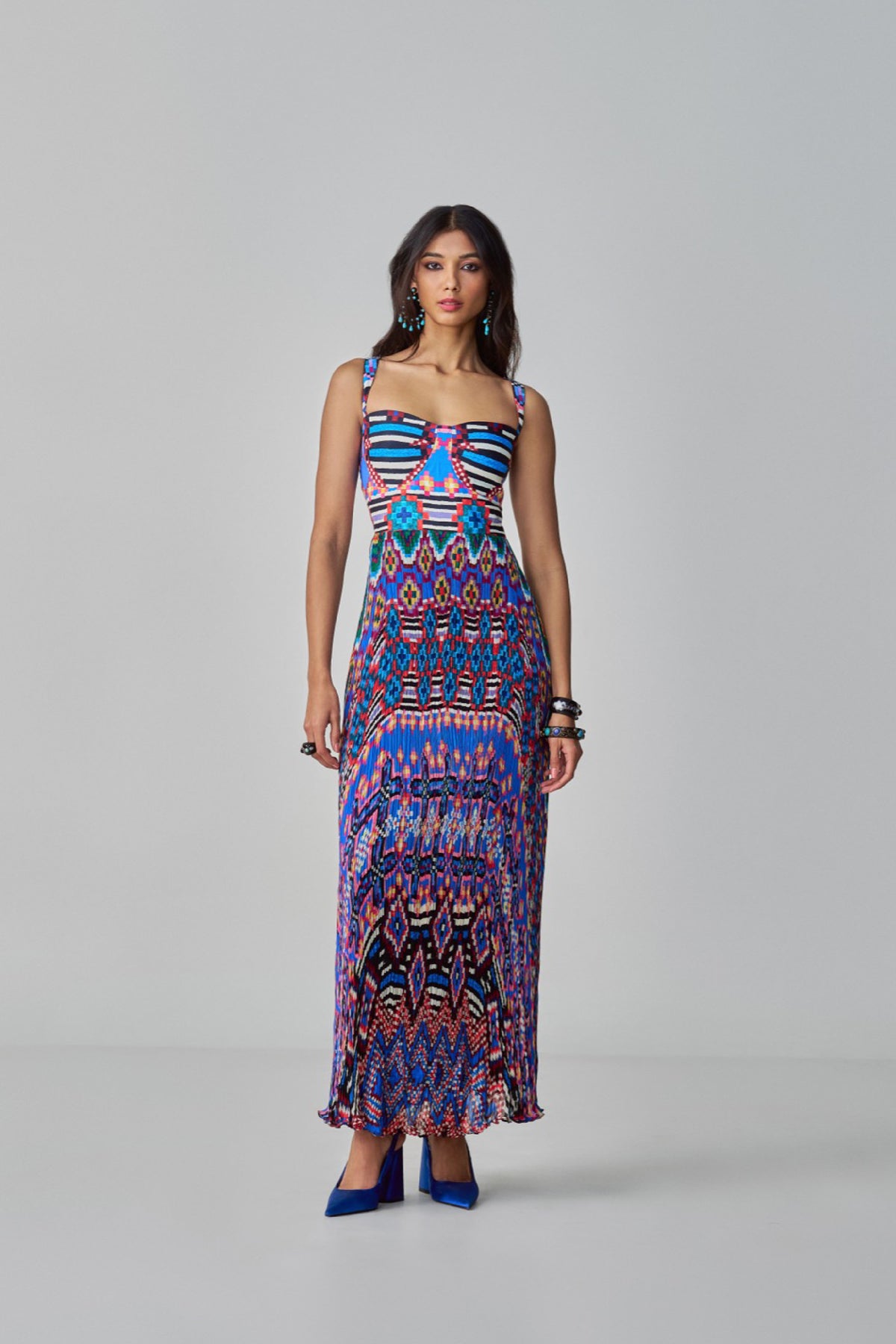 Ikat inspired print , part hand micro pleat maxi dress with satin bustier