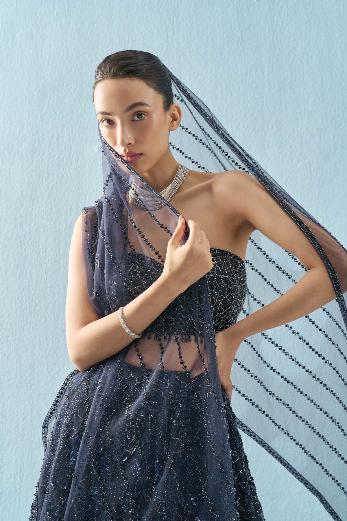 Navy blue tulle lehenga set with a strapless blouse and tulle dupatta. The embroidery details used in this set have sequin, beads, cutdana, abla and velvet applique detailing
