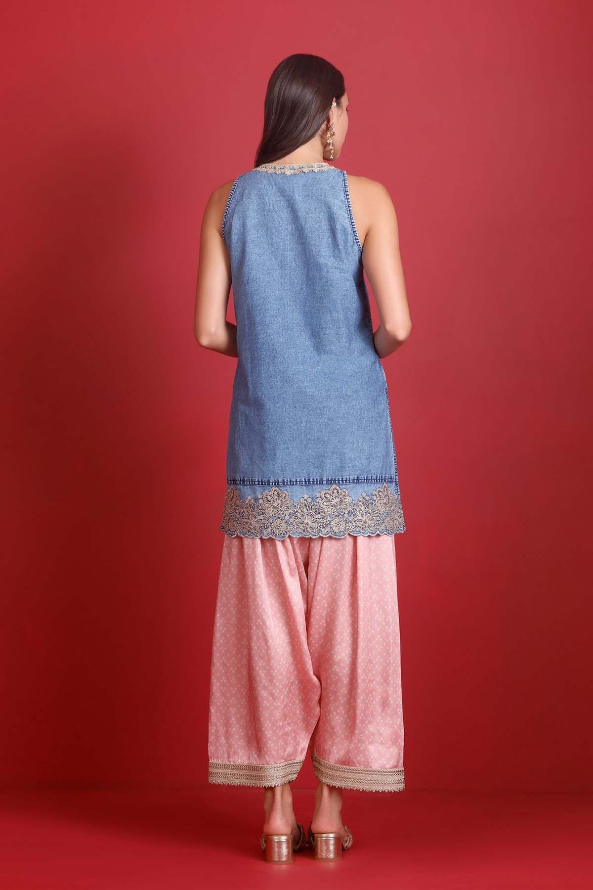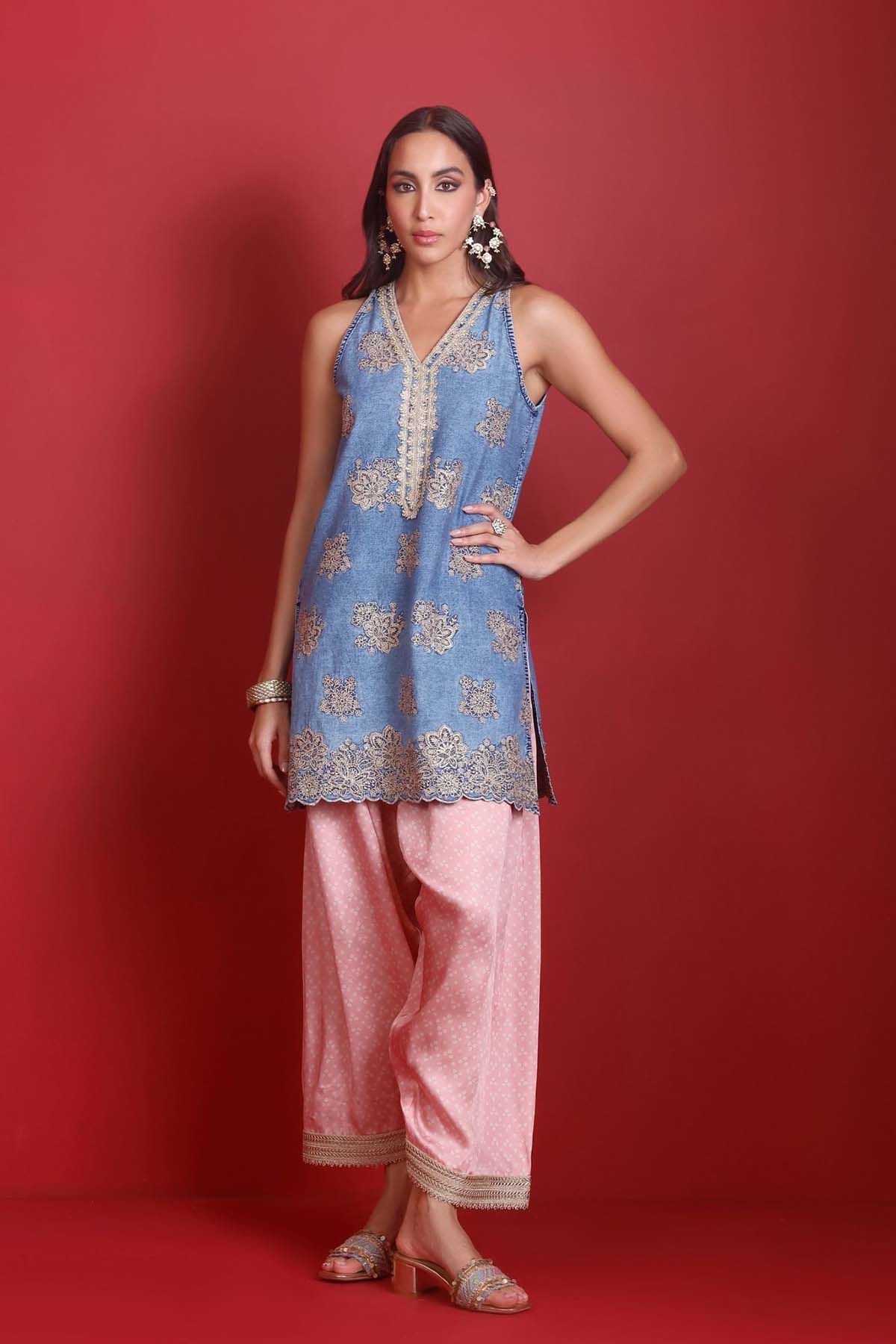 A denim cotton kurta paired with pink printed cupro salwar pants. A playful mix of textures for a festive-ready look.
