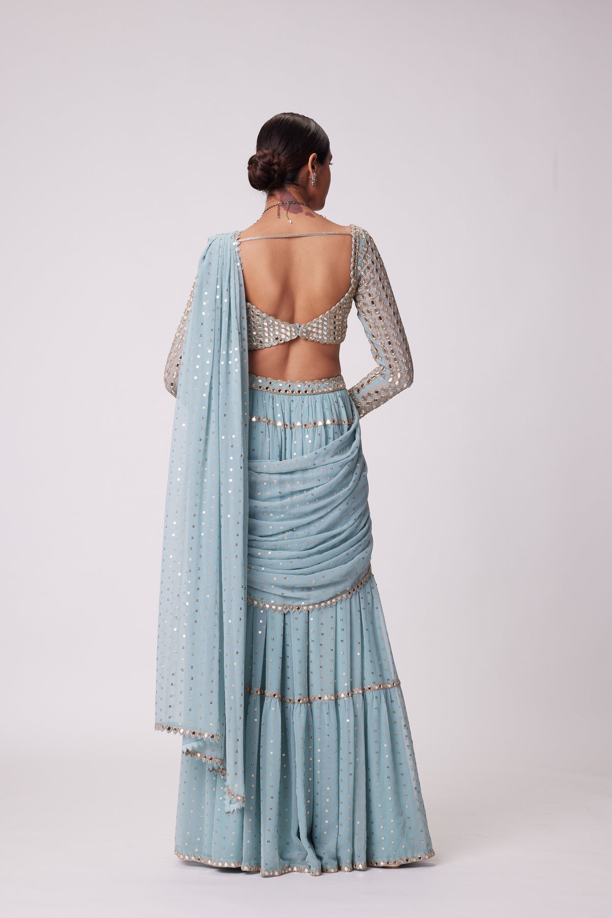 Powder blue multitier hand embroidered saree clubbed with real hand-cut mirror embroidered full sleeve blouse