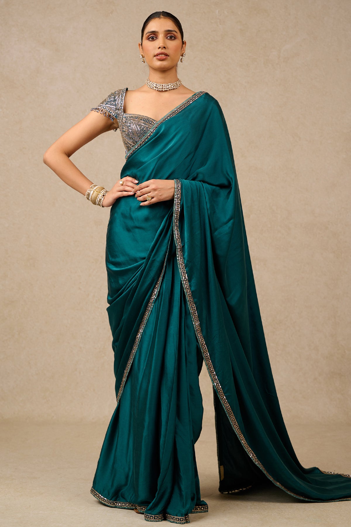 Our silk-satin saree features an embroidered border and is accentuated with crystal tassels. It comes with an embroidered blouse highlighted with crystal tessellations.