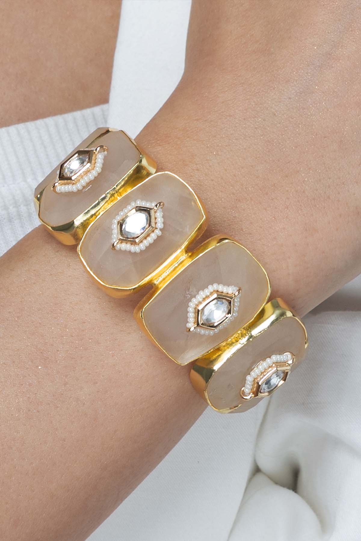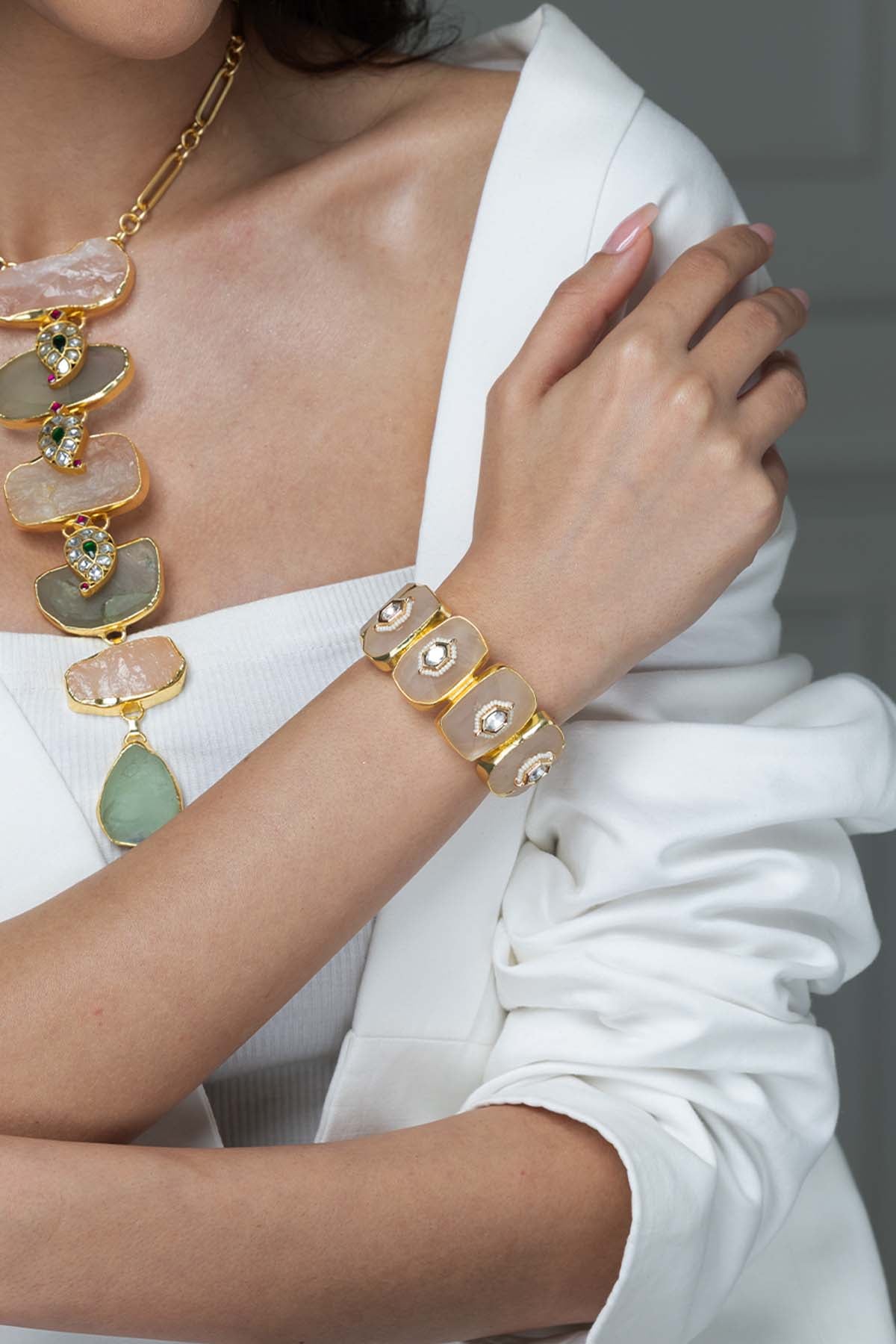 Shopjbr brings you with magnificent bracelet that features large blush-pink segments. Each segment is subtly accented with a small, clear stone and white detailing, creating a bold, contemporary look.