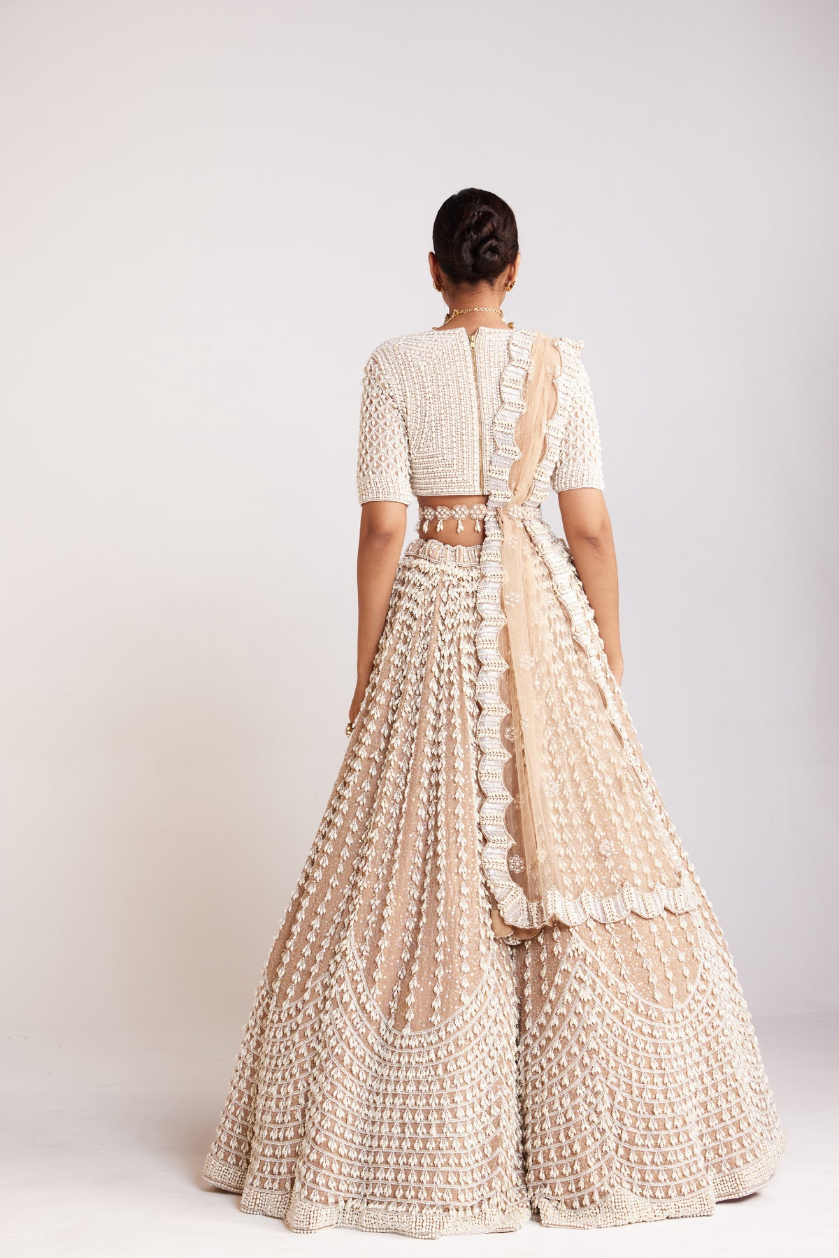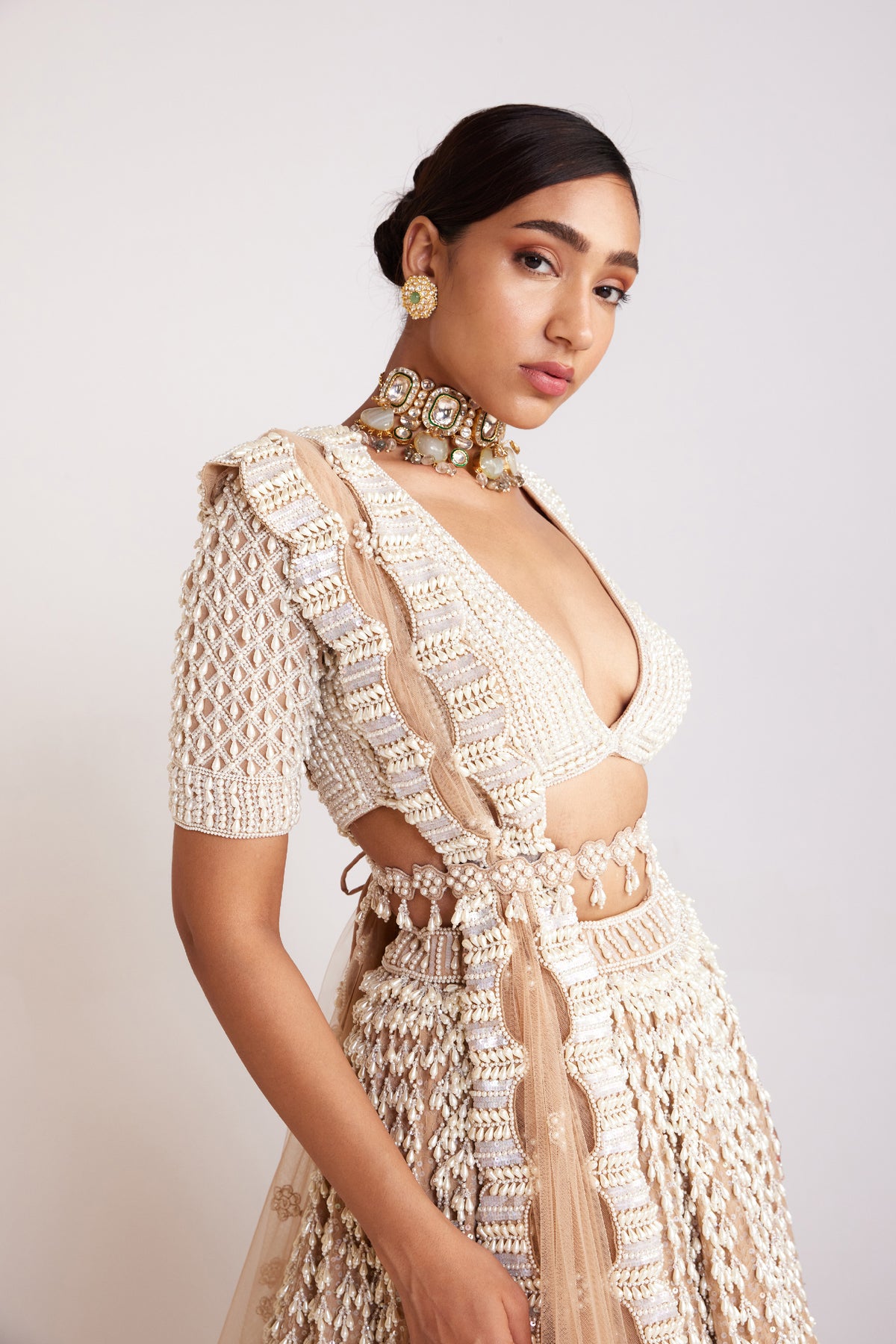 Beige Chandelier Pearl Lehenga Paired With Heavily Pearl Embellished V Neck Blouse With Elbow Sleeve
