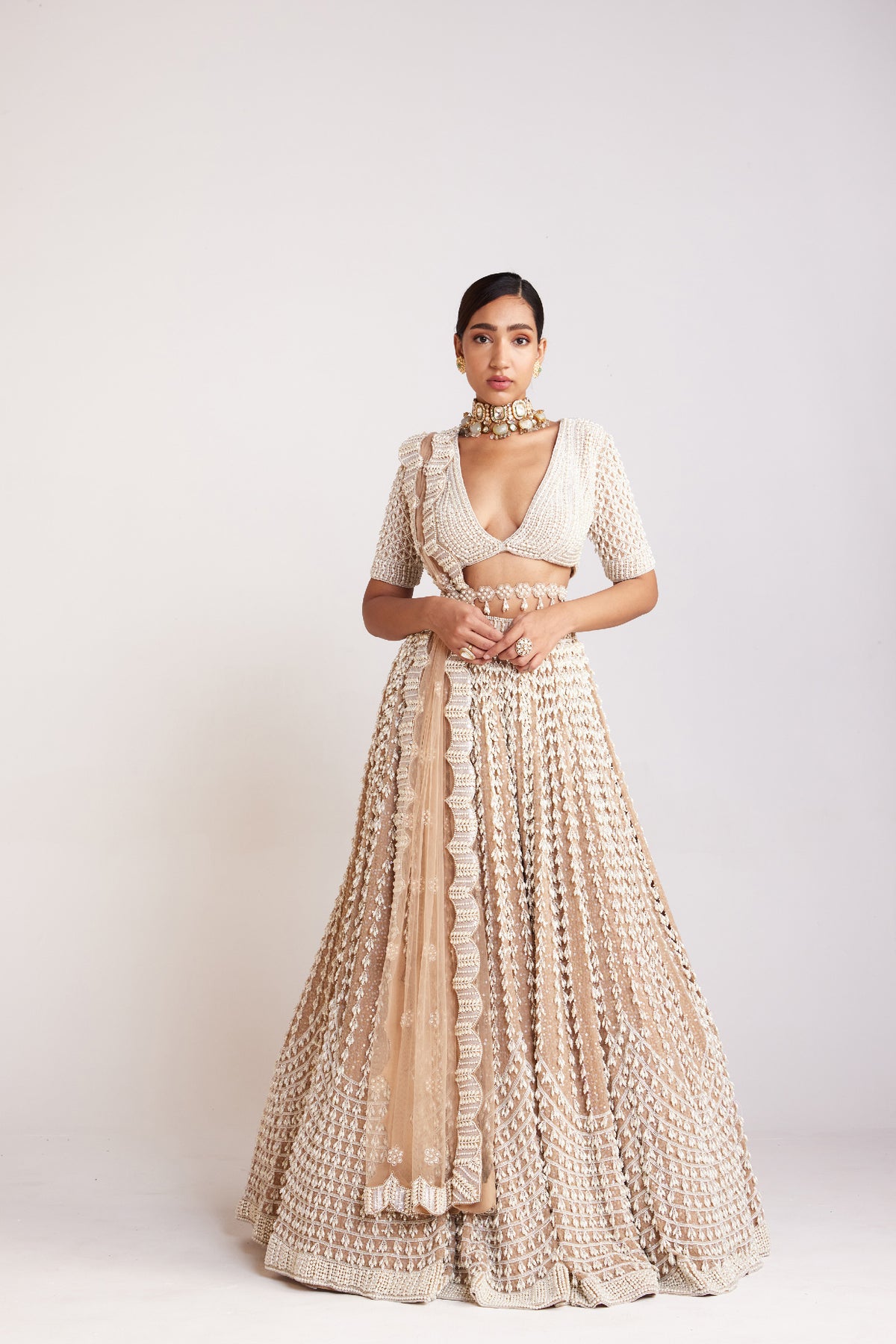 Beige chandelier pearl lehenga paired with heavily pearl embellished v neck blouse with elbow sleeve