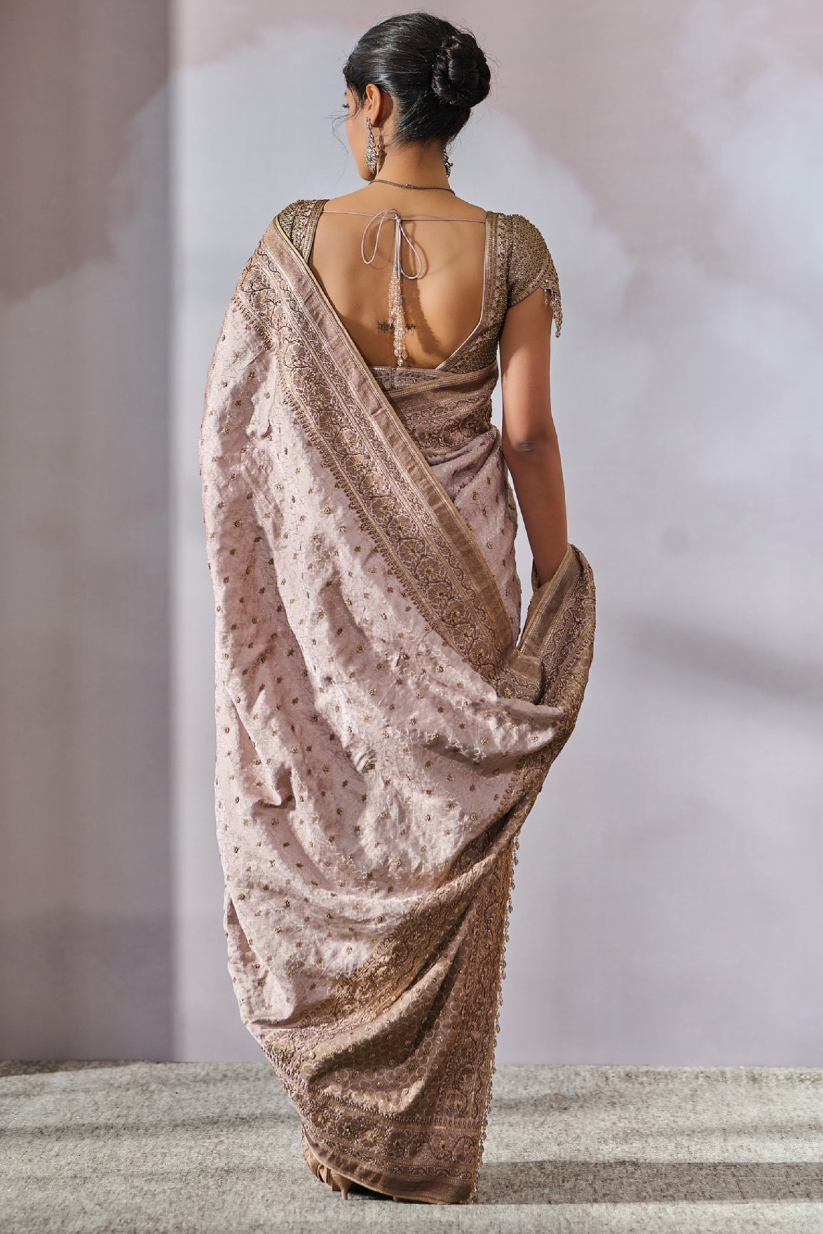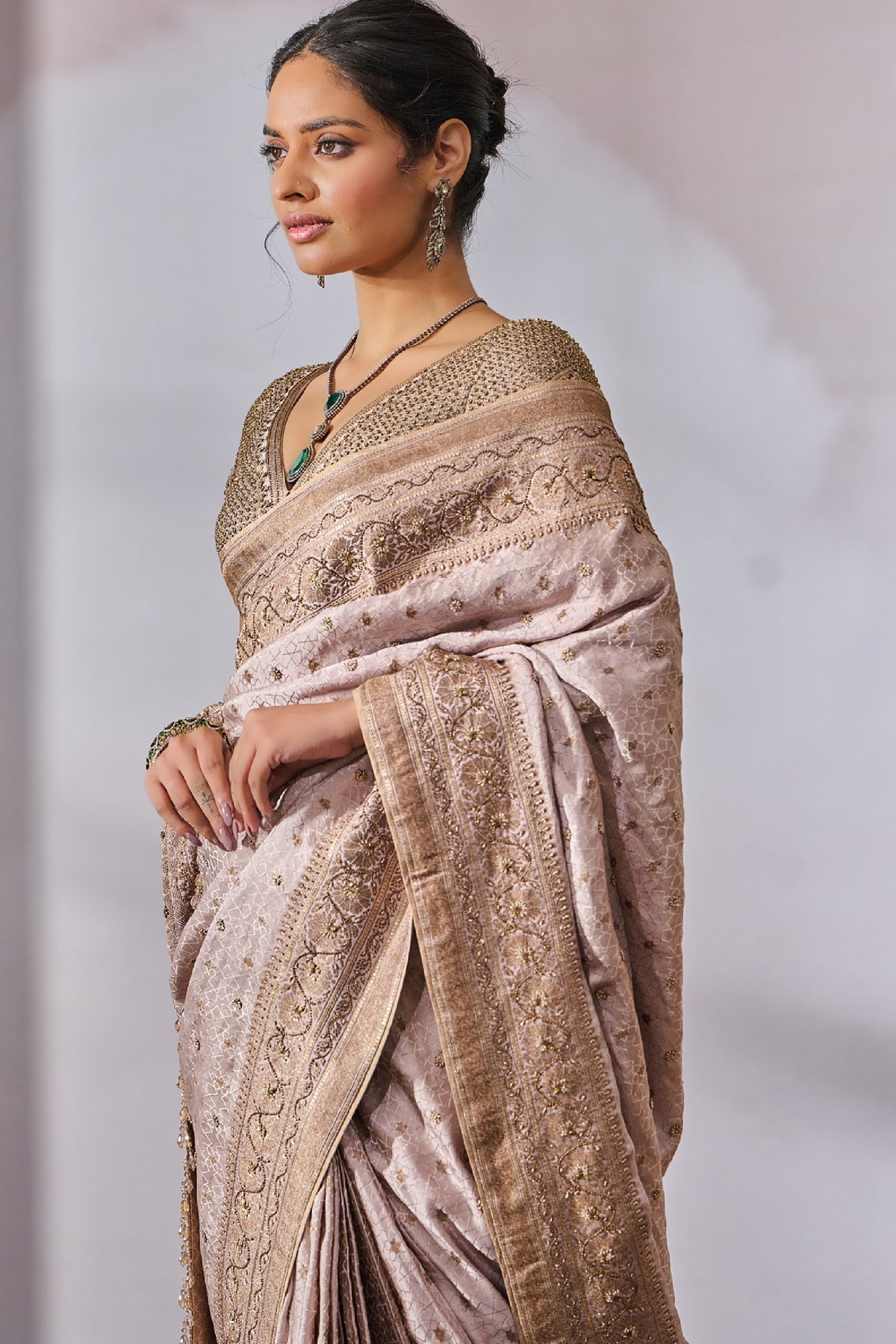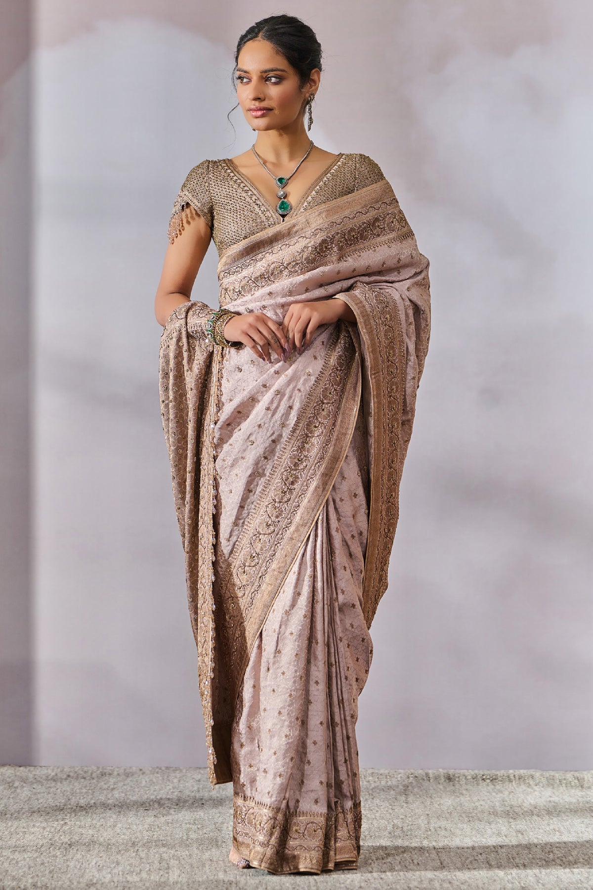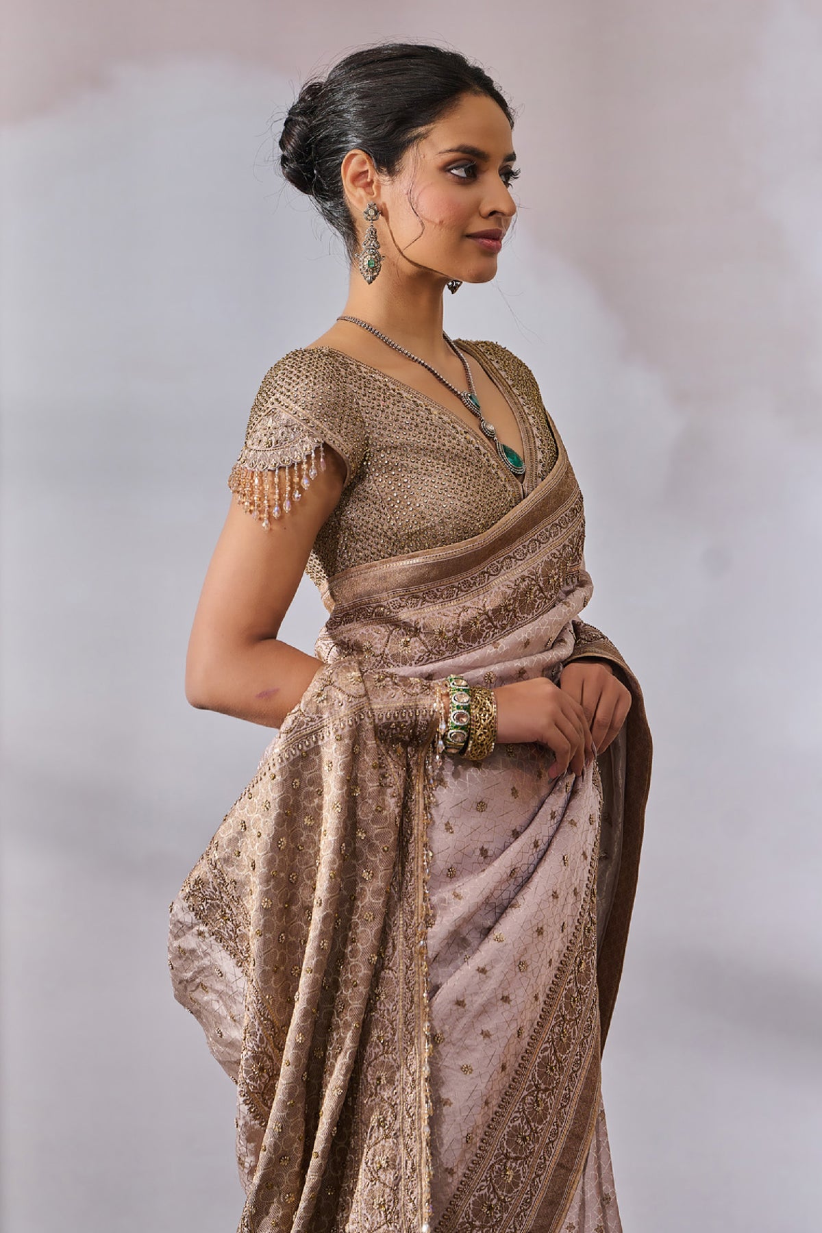 Intricately embroidered brocade saree is paired with a complementing blouse.