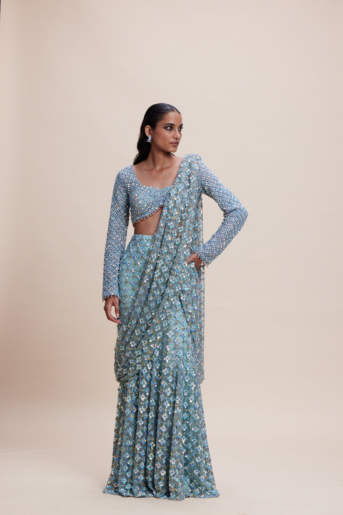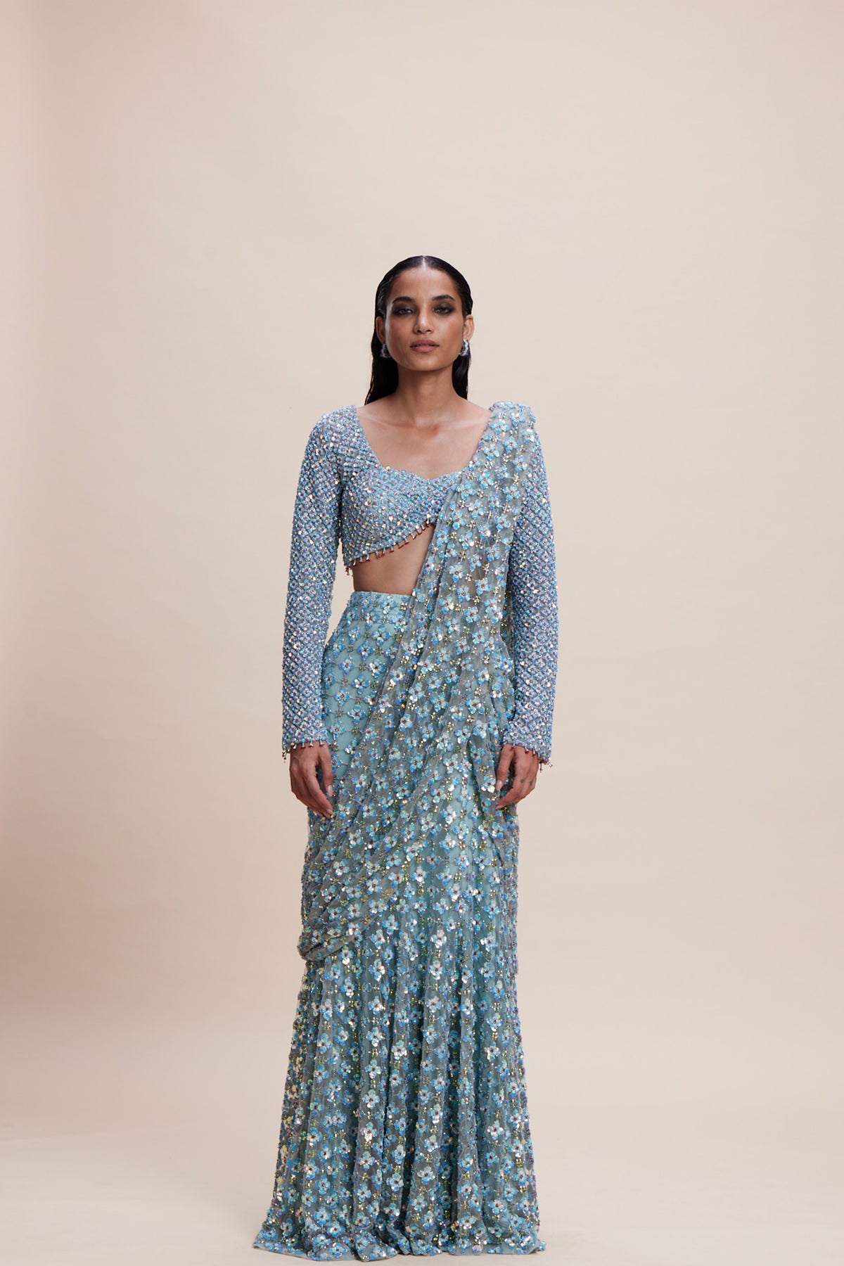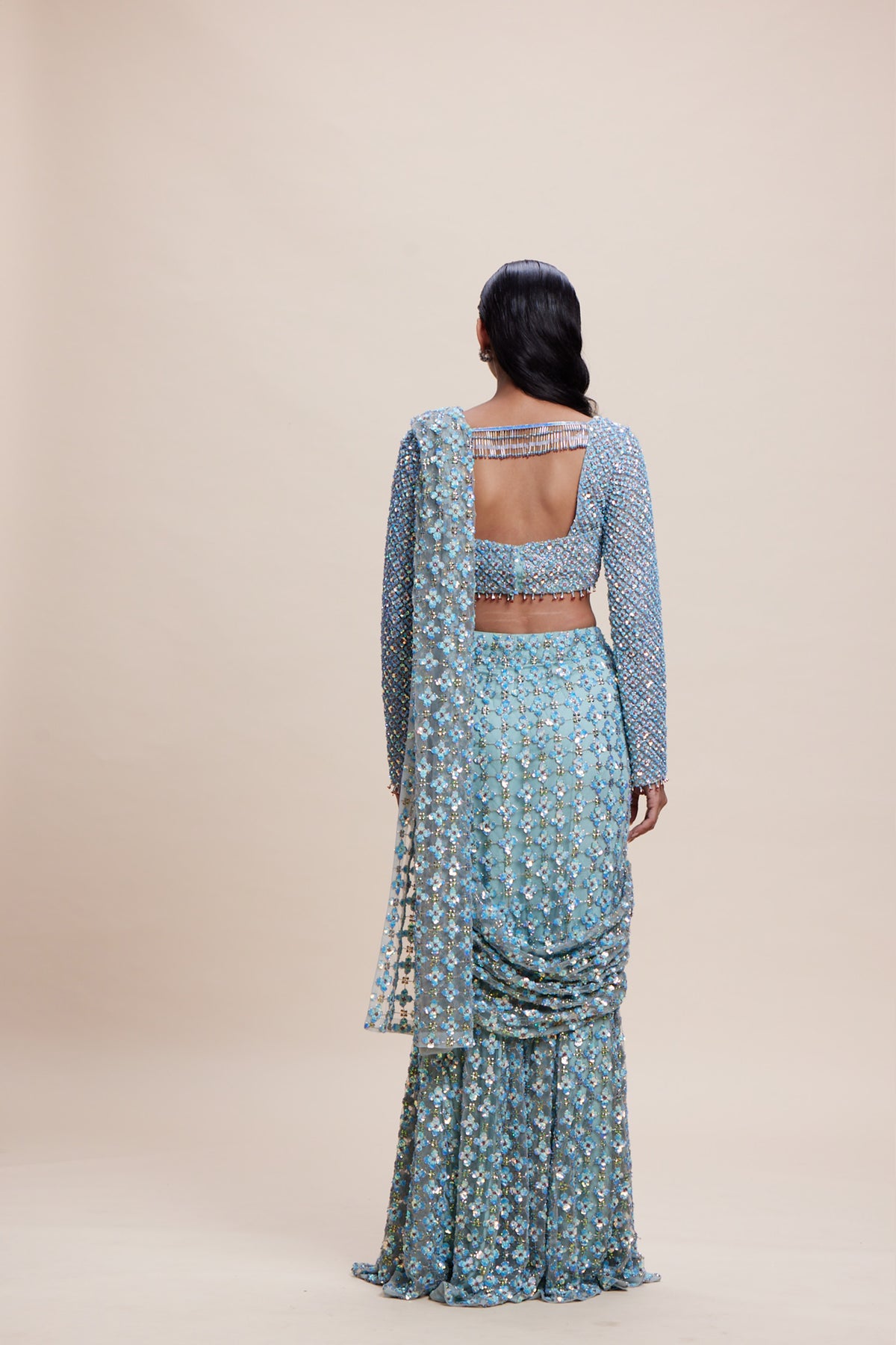 Our powder blue saree, with its chequered floral motif, perfectly highlights your feminine grace. The delicate details on the blouse and the saree’s intricate design elevate it to a stunning level, ensuring it’s a piece you’ll love to wear.