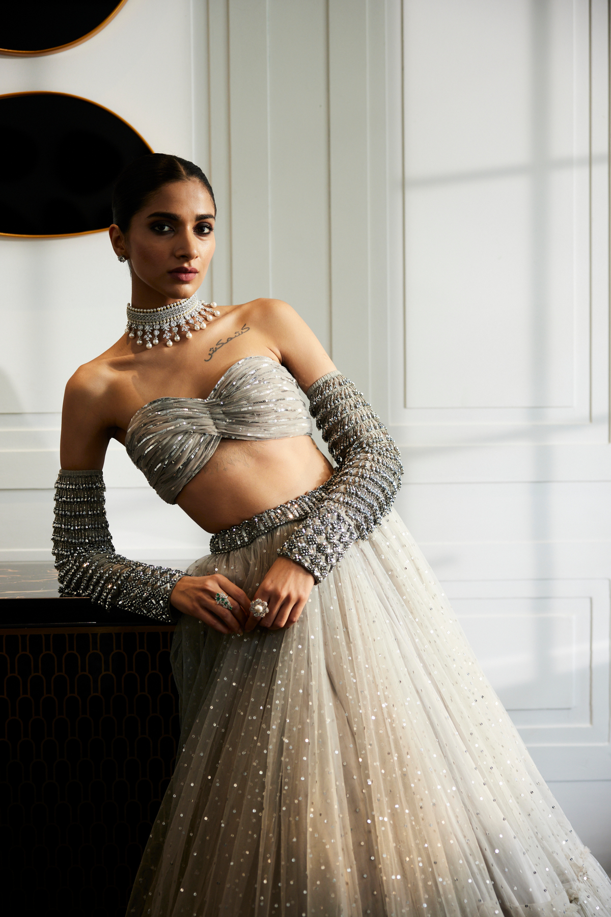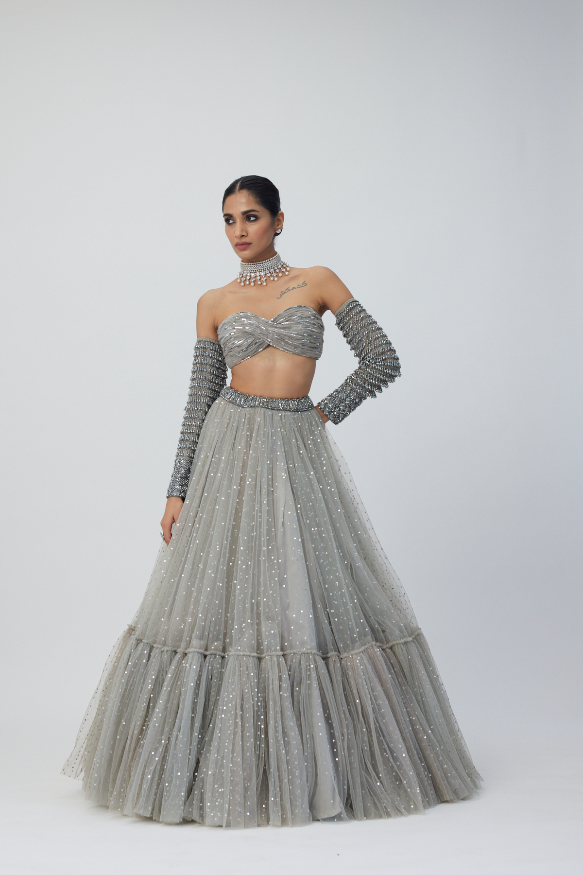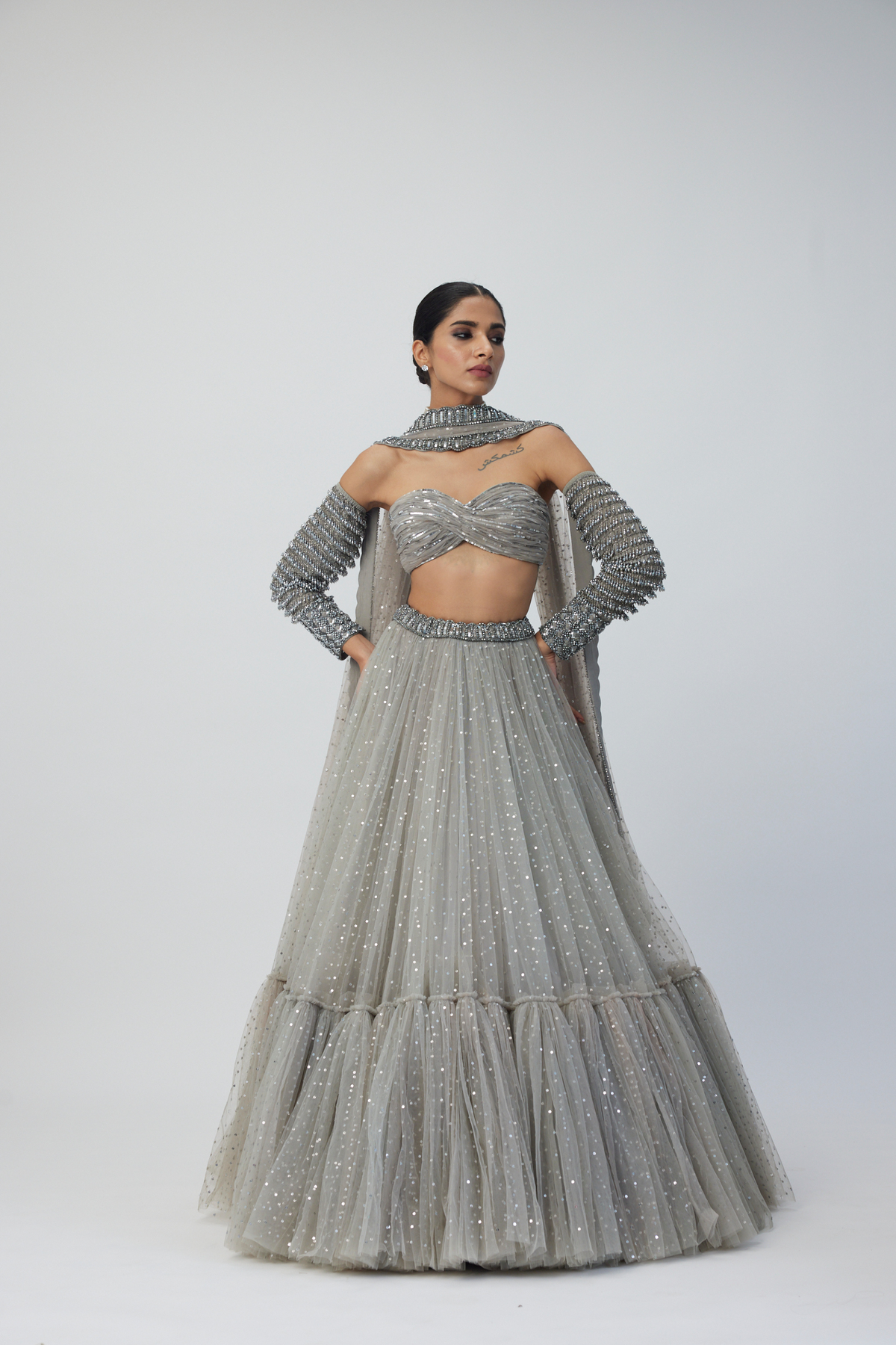 Intricately hand embroidered Tulle Lehenga And Dupatta featuring sequins and crystal embroidery clubbed With jewelled blouse with crystal embellishments.