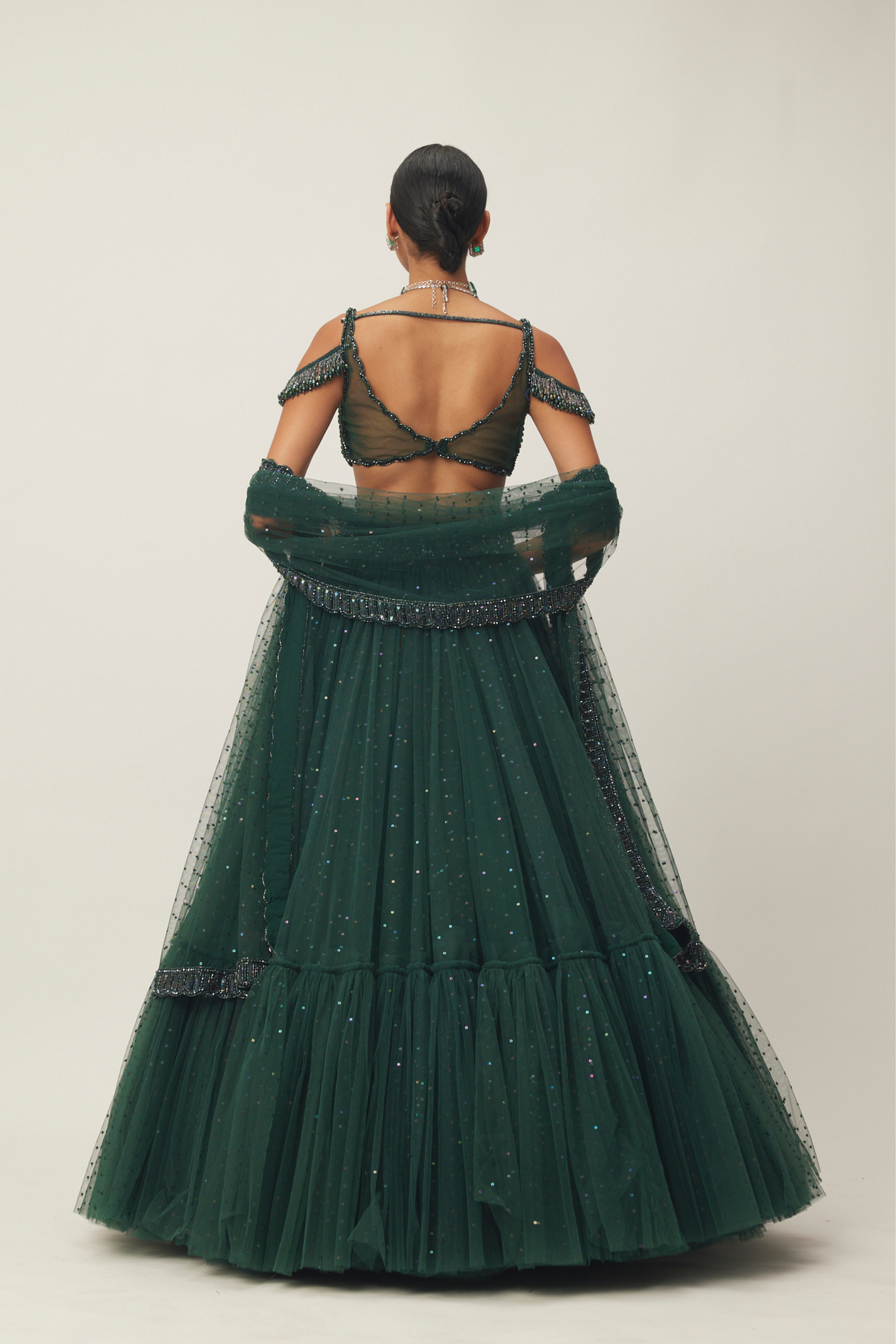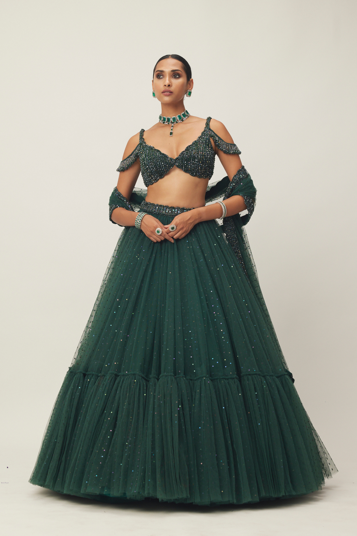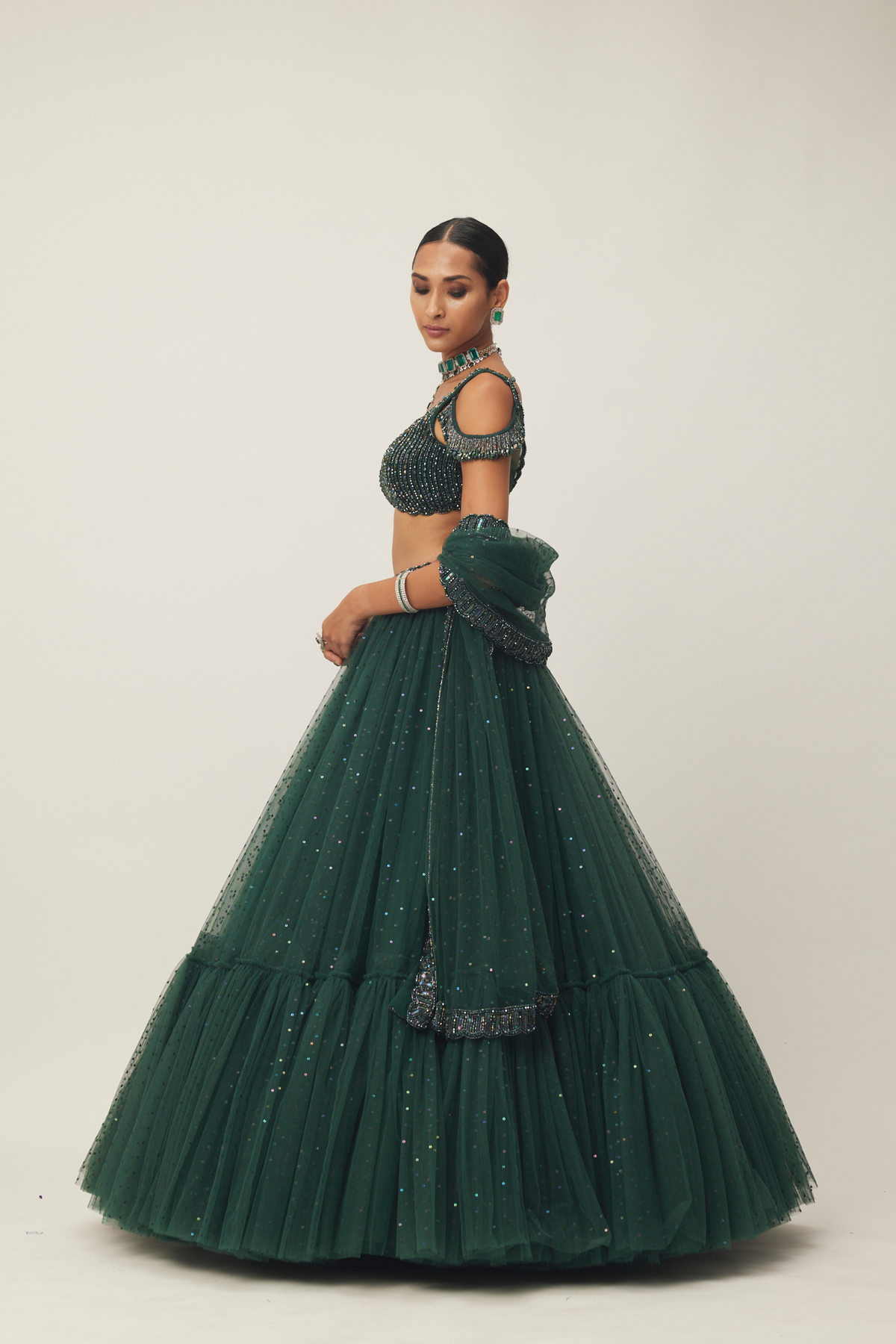 Intricately hand embroidered tulle Lehenga And Dupatta featuring sequins and crystal embroidery clubbed With jewelled blouse with crystal embellishments.