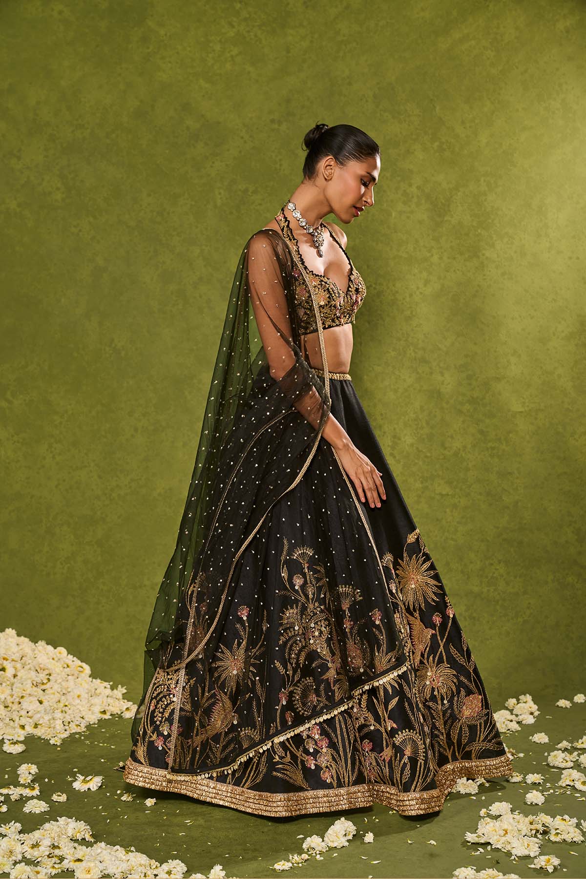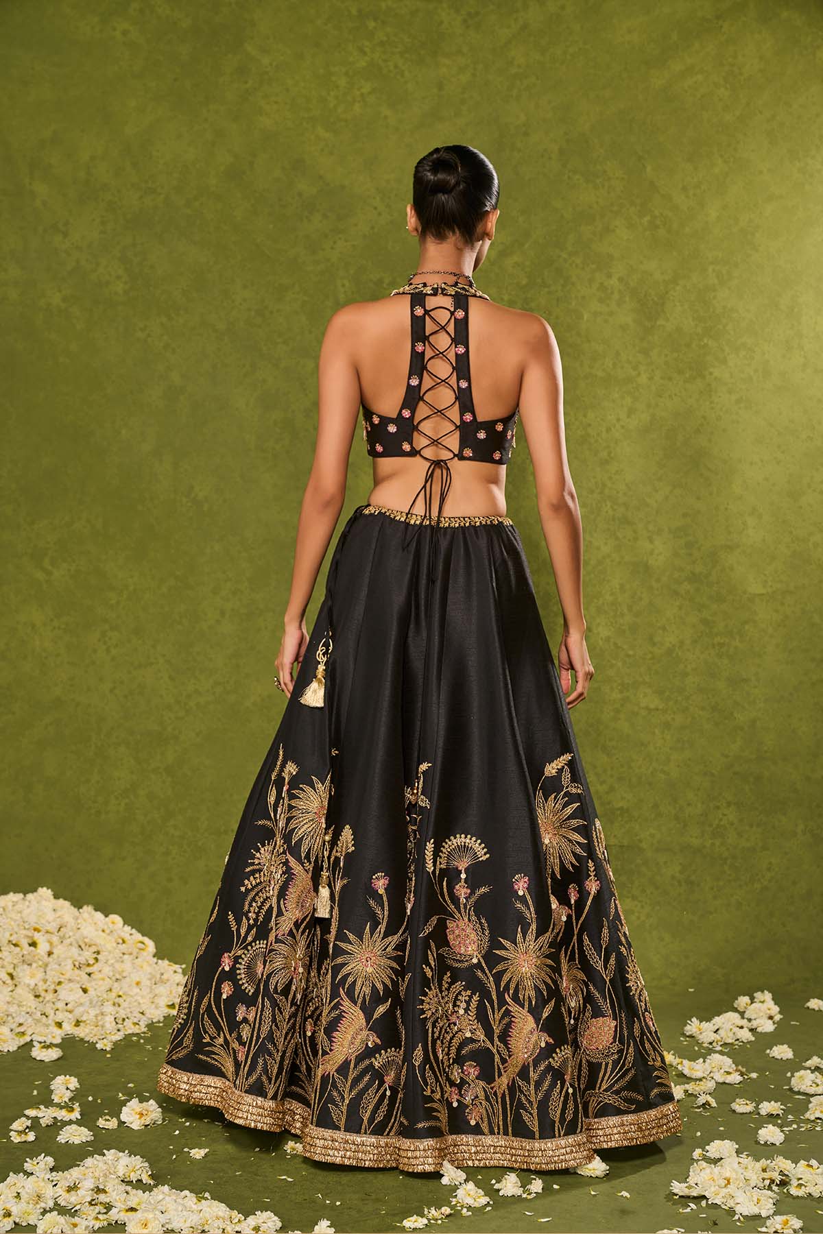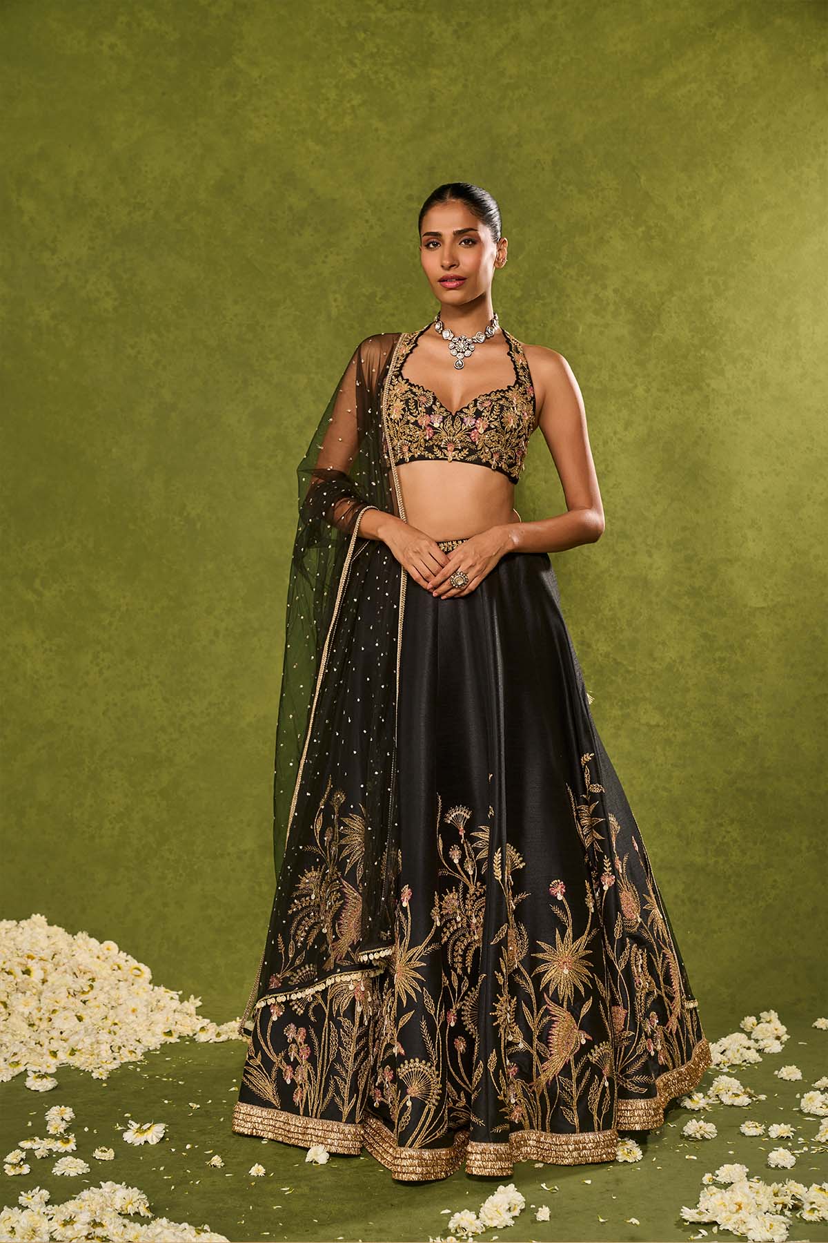 Black dupion silk lehenga brought to life with forest-inspired motifs, intricately embroidered in zari, sequence, resham, metallic coins and pearls with a zari frill  hem paired with an embellished halter blouse and a matching tulle dupatta