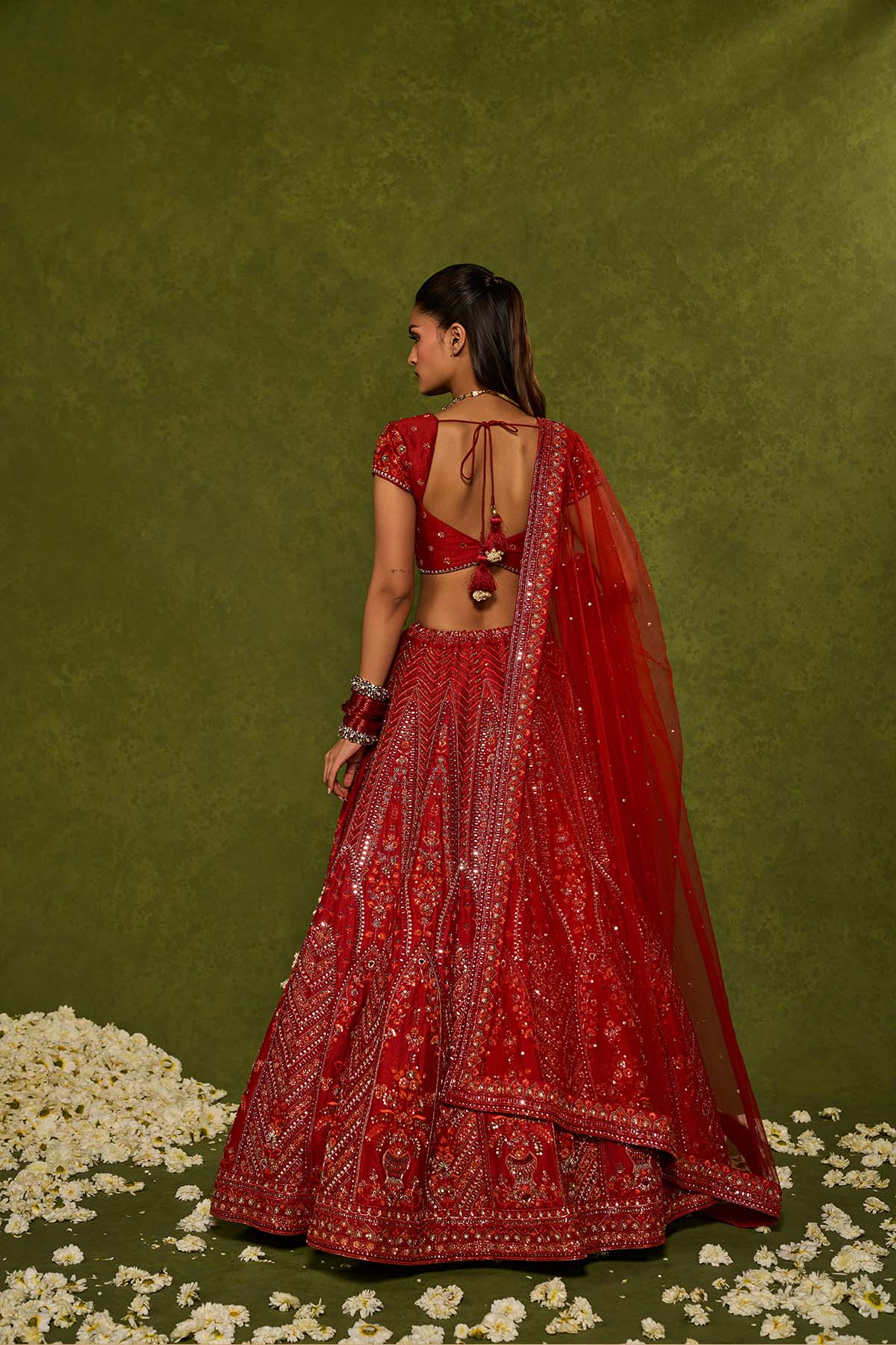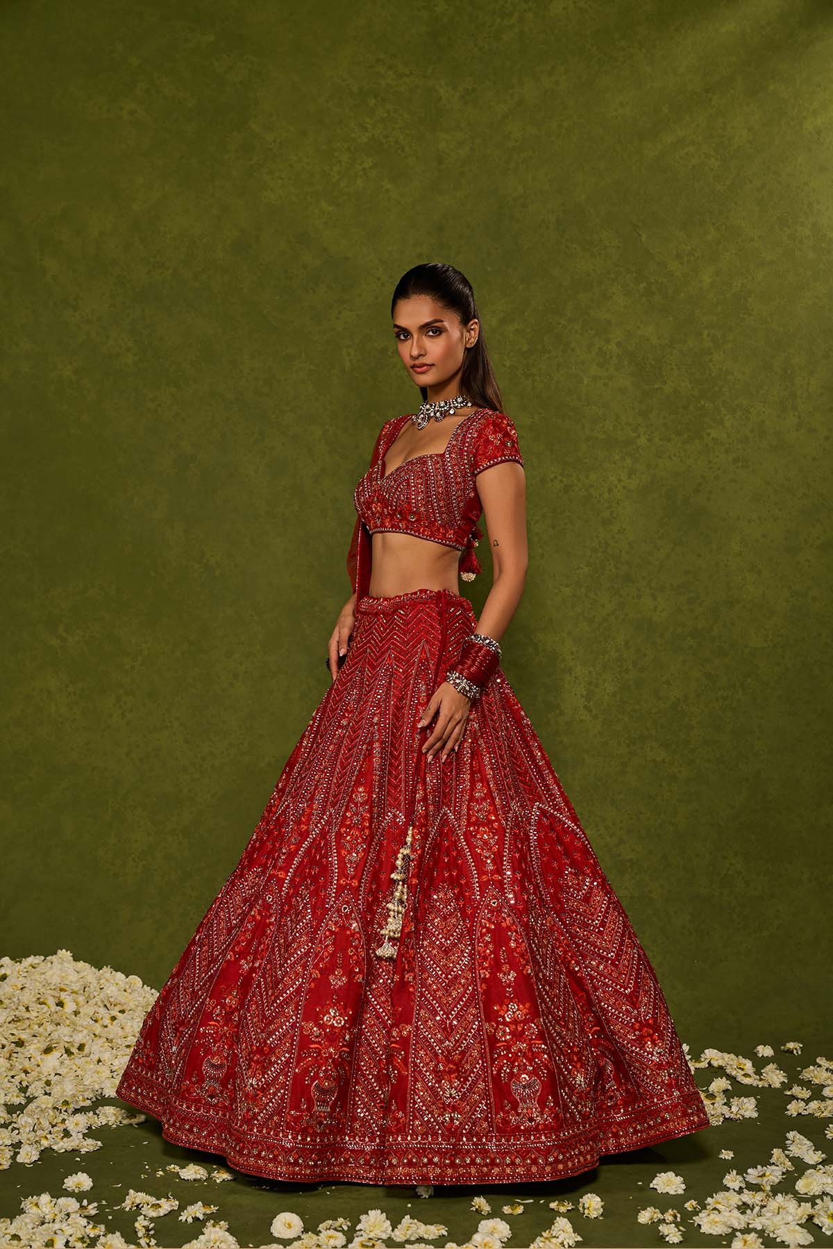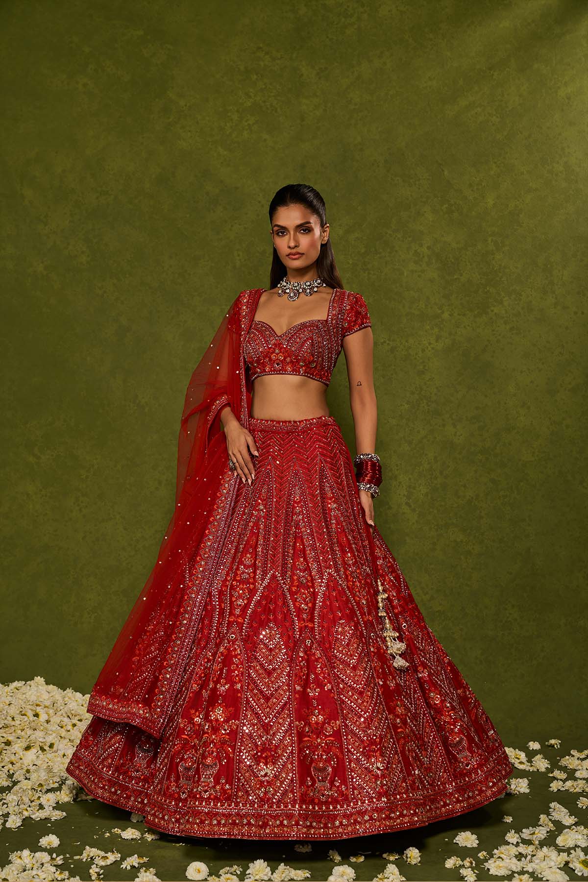 Red raw silk floral embroidered lehenga with thread ,sequence , zardozi and glassbeads detailing paired with a sweetheart neck cap sleeve heavily embroidered blouse and matching tulle dupatta with embellished