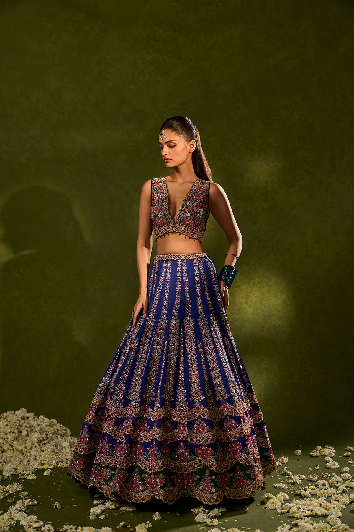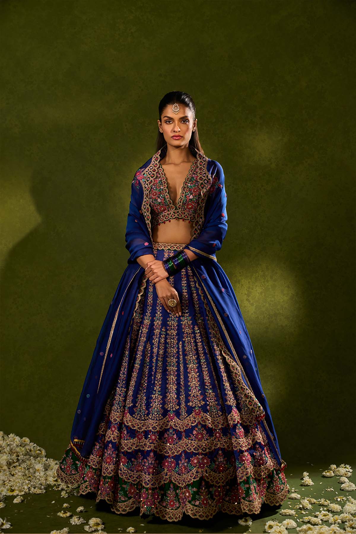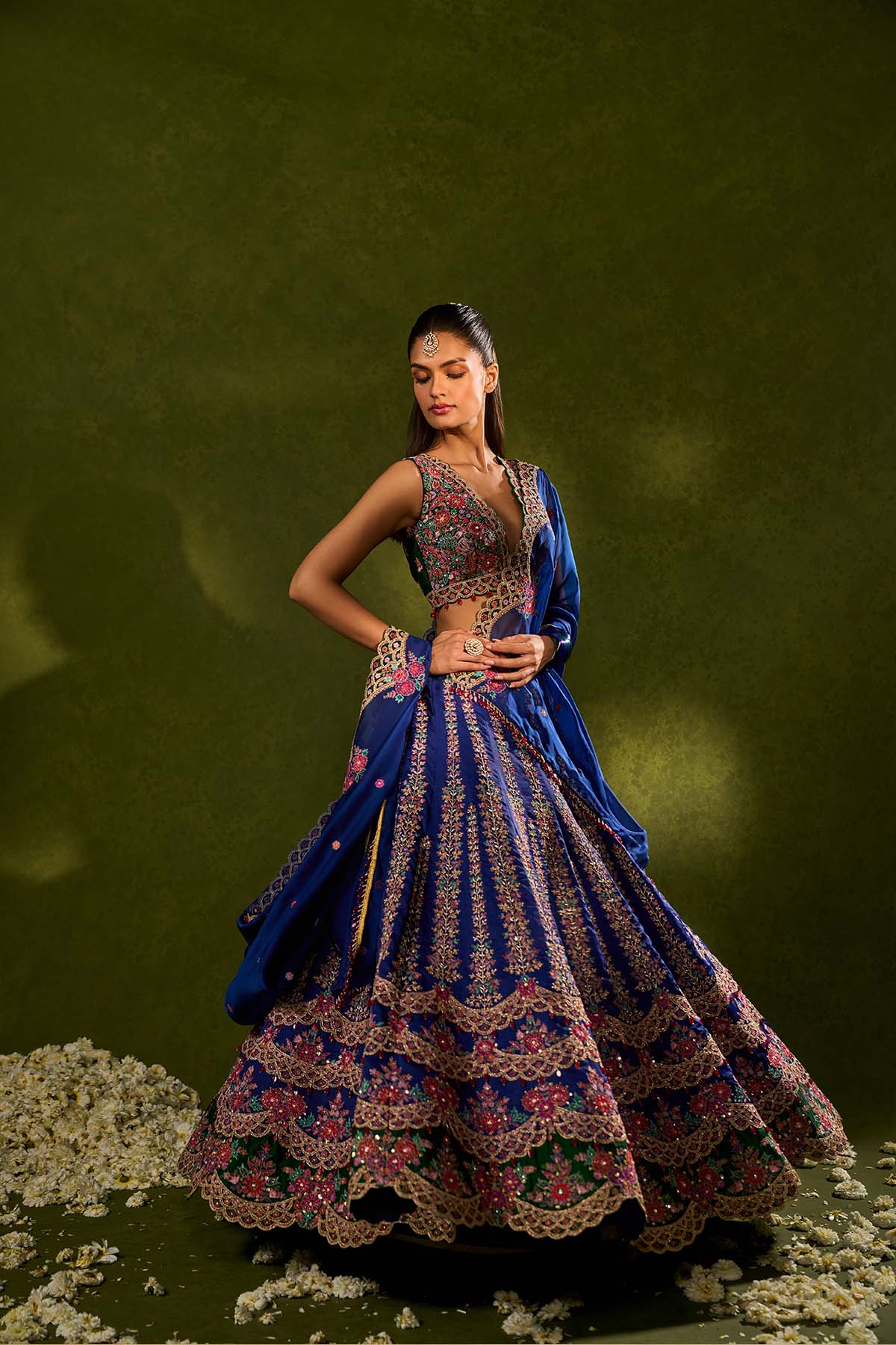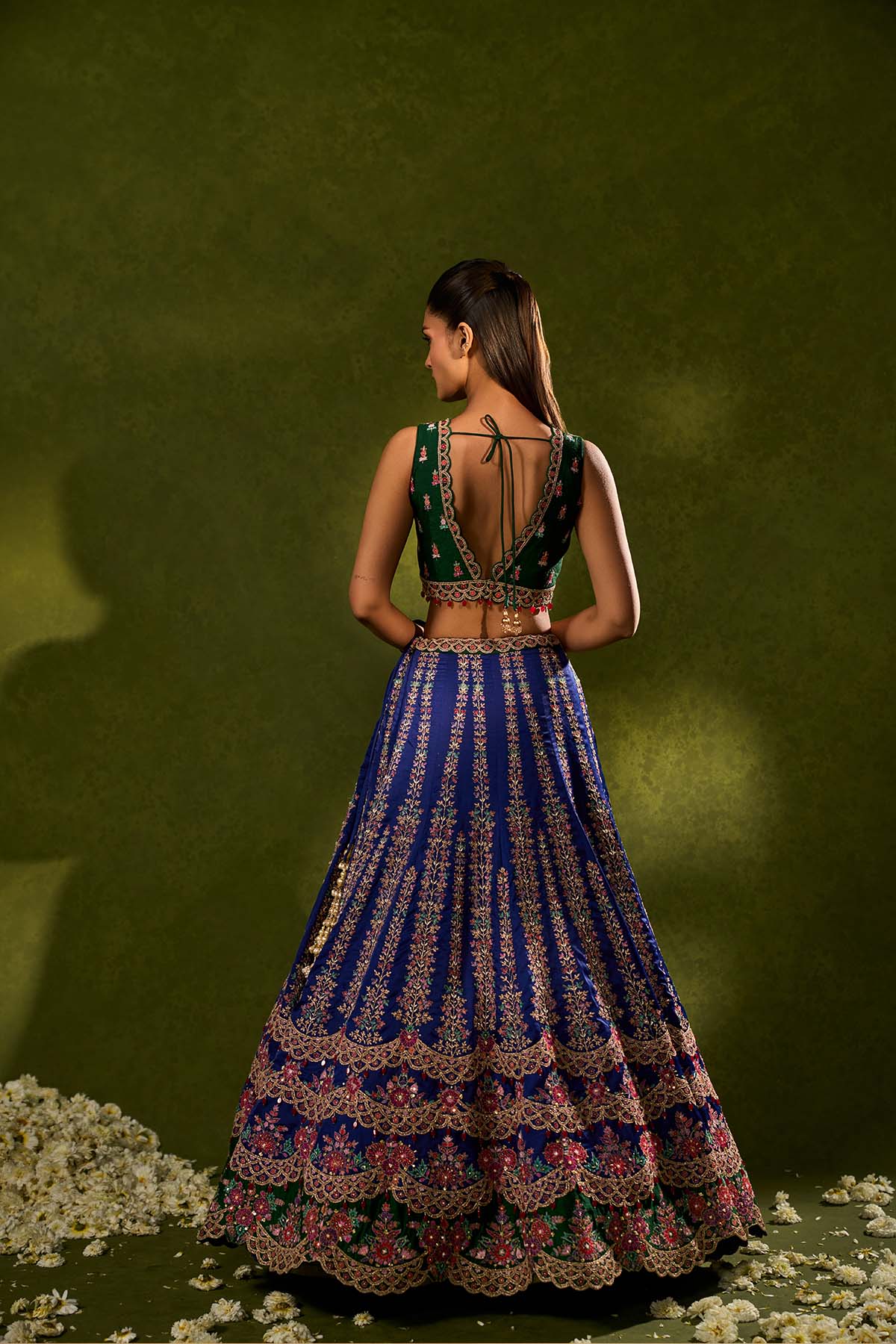 Blue and green soft silk lehenga exquisitely embellished with vibrant resham, zari, pearls, and sequence work, in a graceful scallop pattern paired with a green, intricately embroidered plunging-neck blouse and a sheer blue organza dupatta adorned with delicate embroidered green appliqué