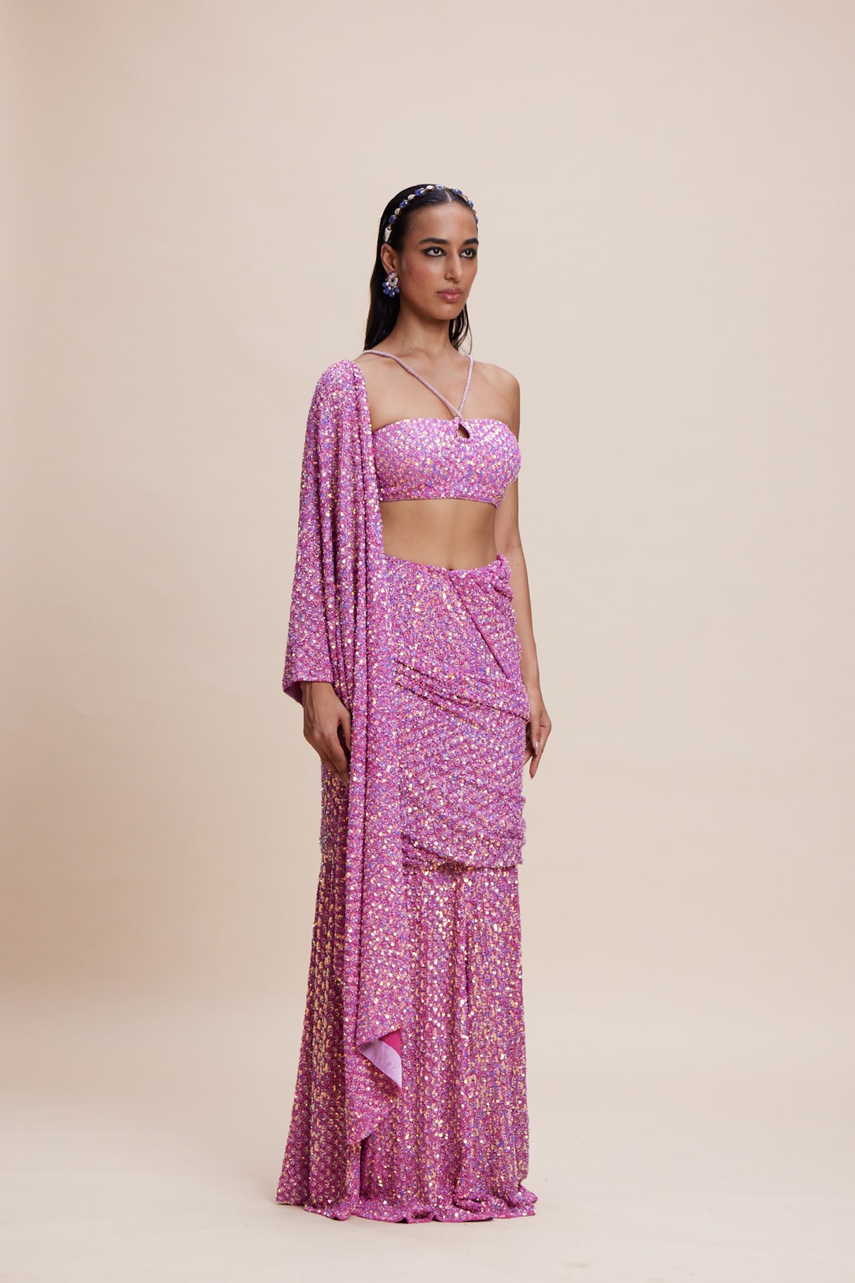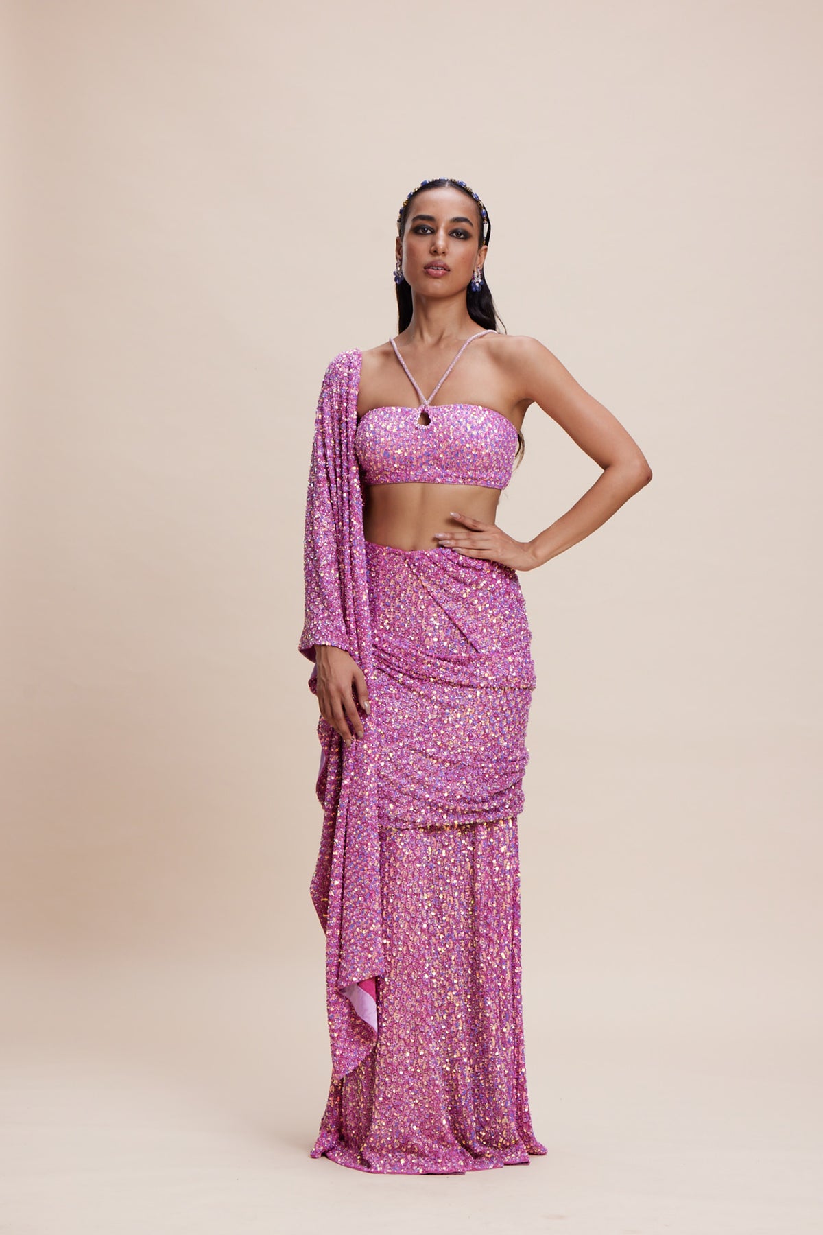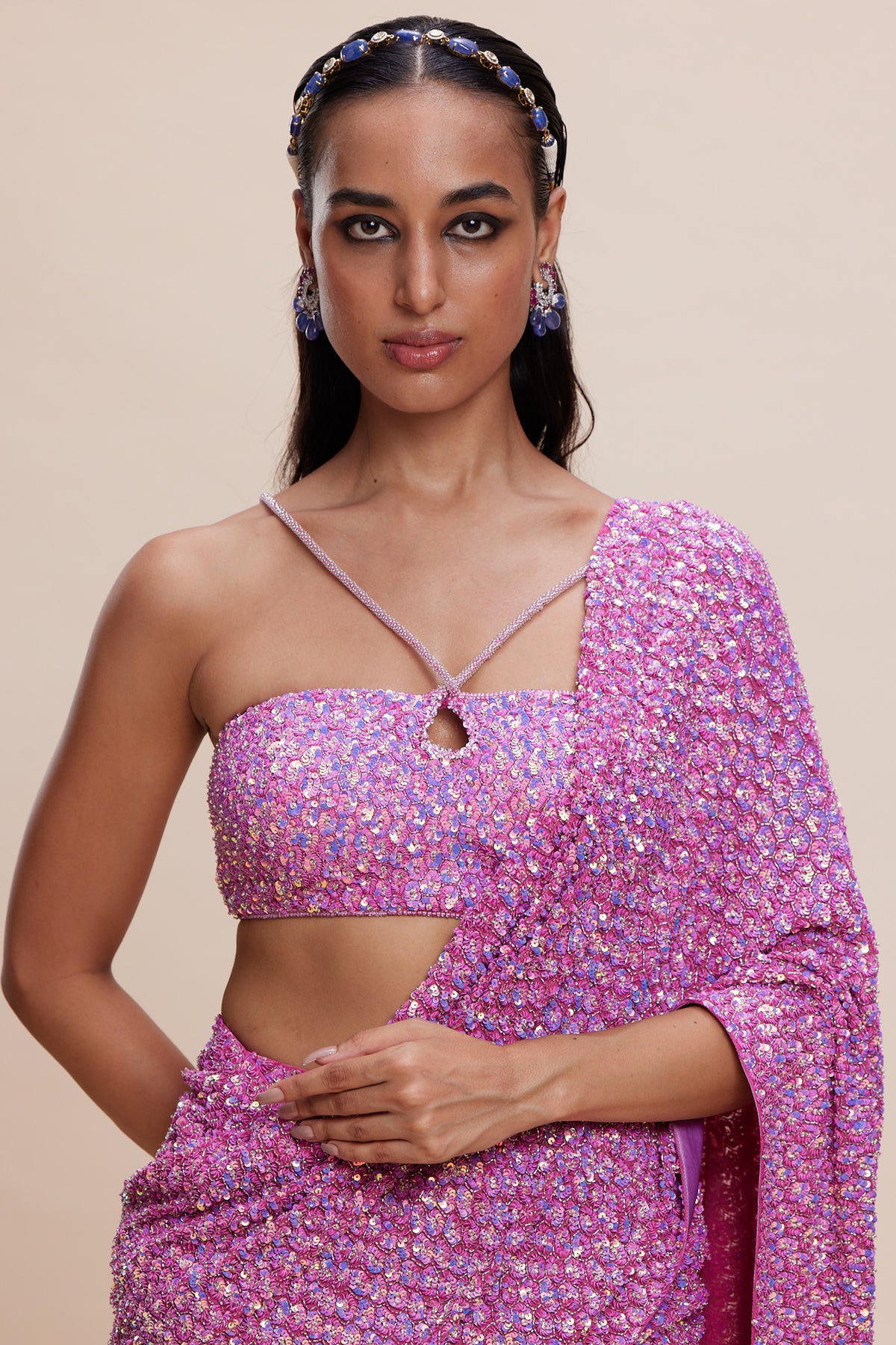 Turn heads in kangana trehan’s pink saree skirt adorned with shimmering sequins. Blending timeless tradition with a barbiecore twist, this sparkling ensemble and chic blouse ensure you dazzle and captivate at any event.