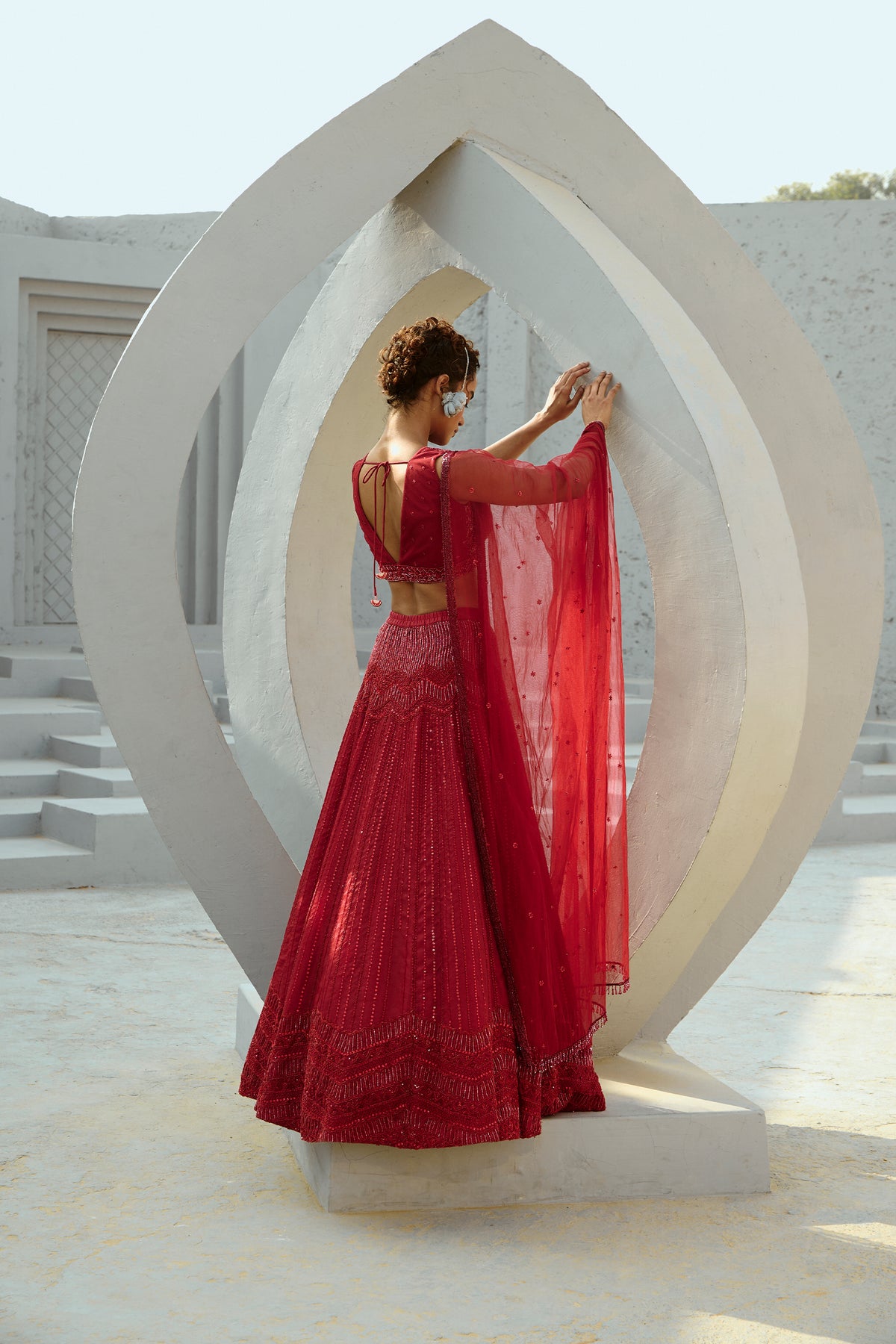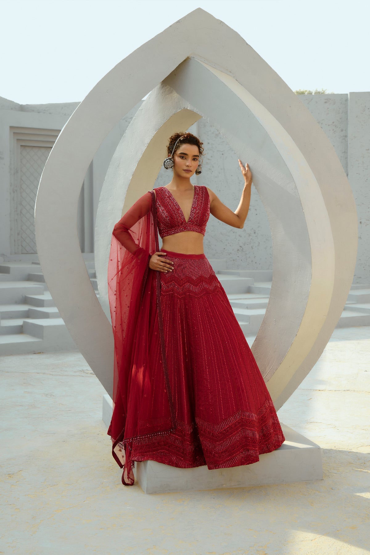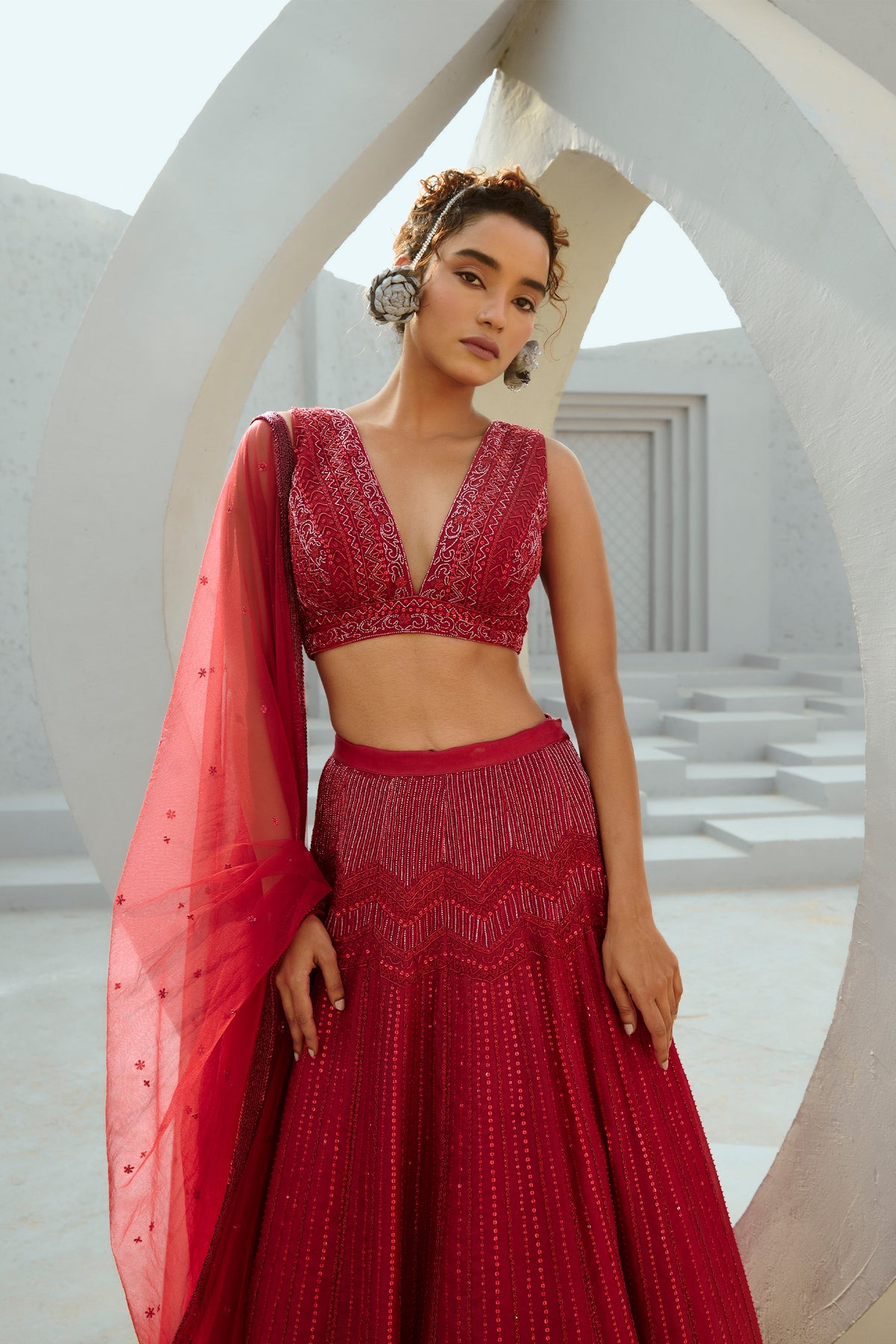 Red glassbeads and zari encrusted organza lehenga paired with intricately embellished deep v neck blouse and soft tulle dupatta