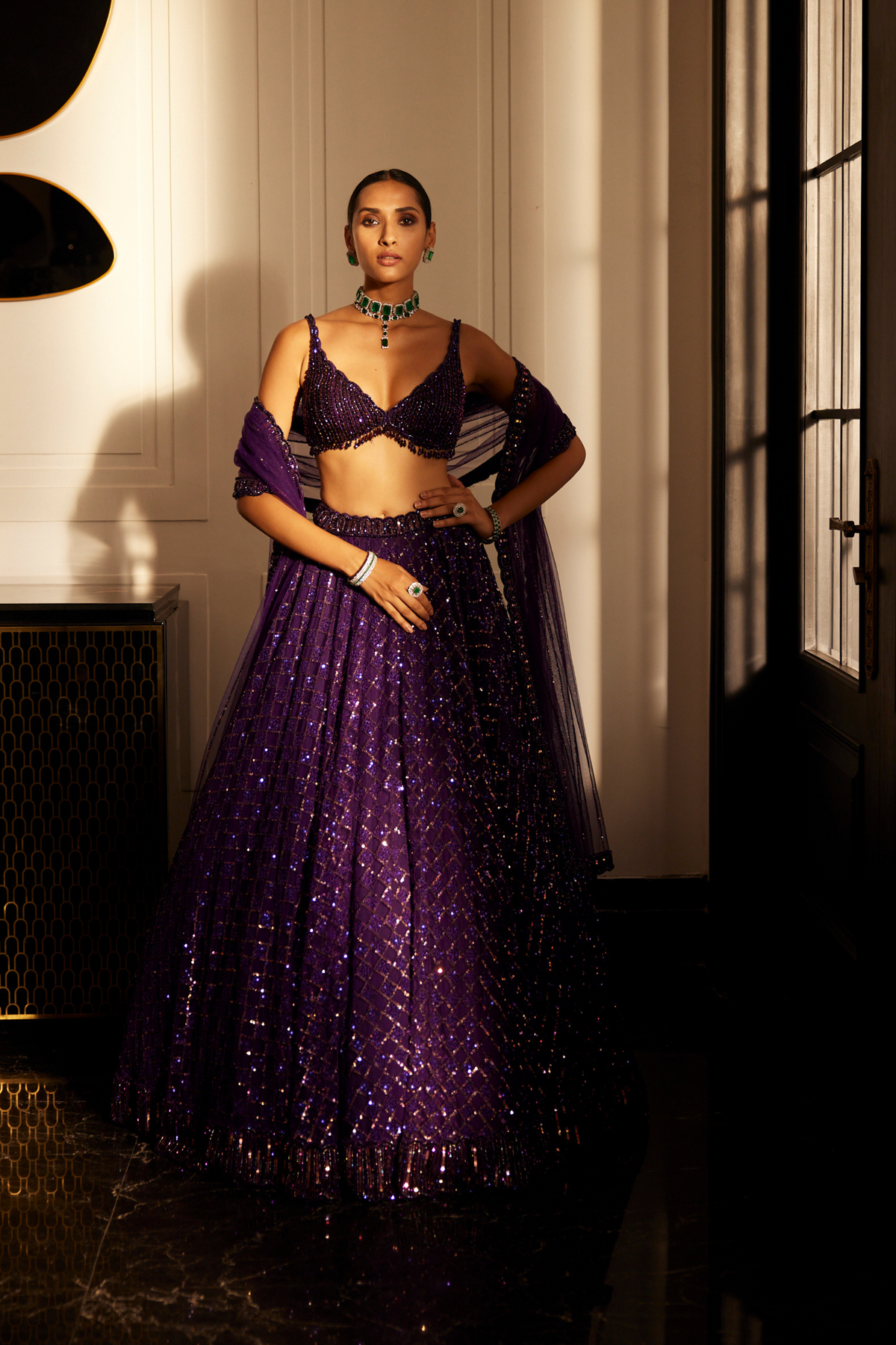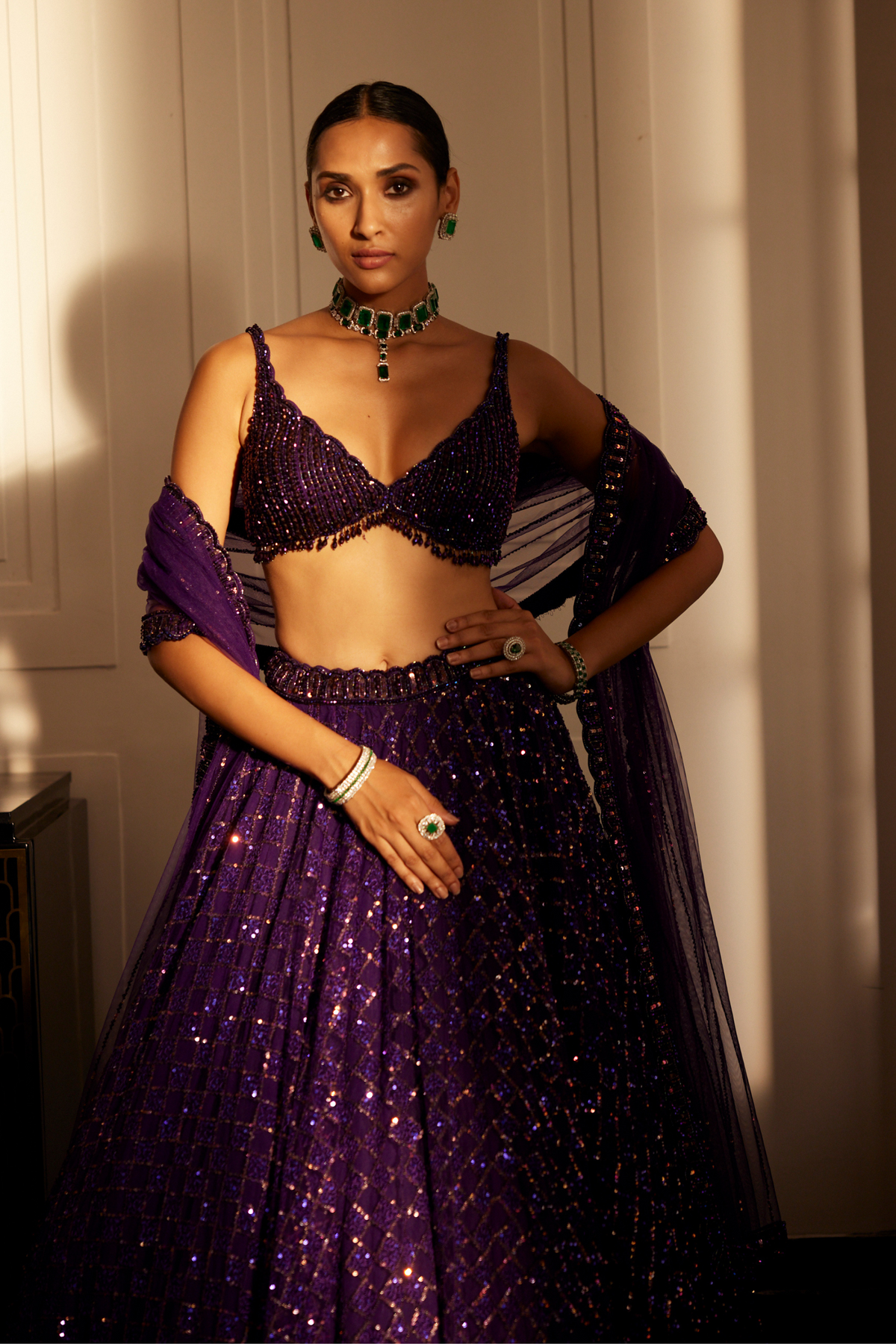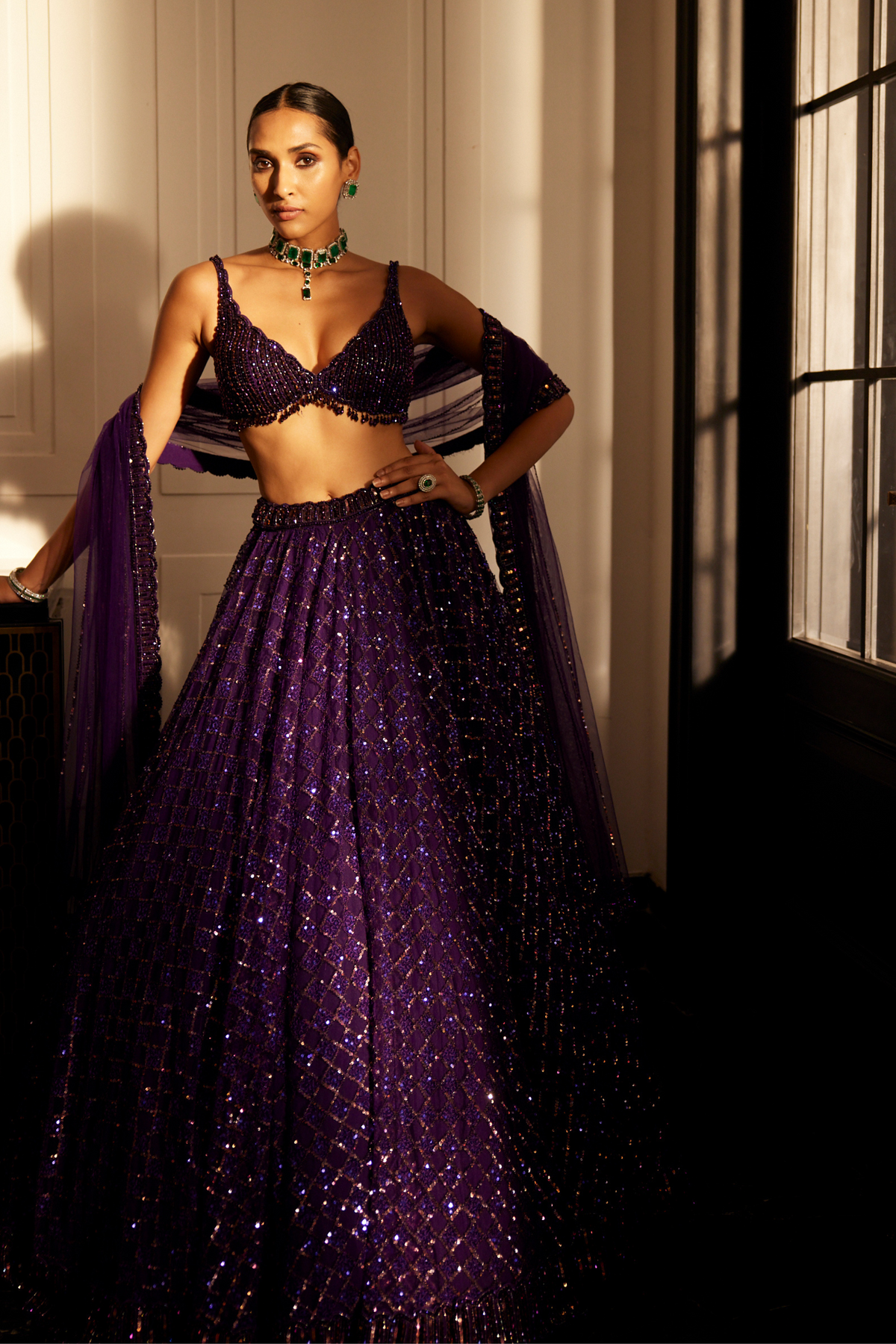 Intricately hand embroidered Lehenga And Dupatta featuring sequins and crystal embroidery clubbed With jewelled blouse with crystal embellishments.