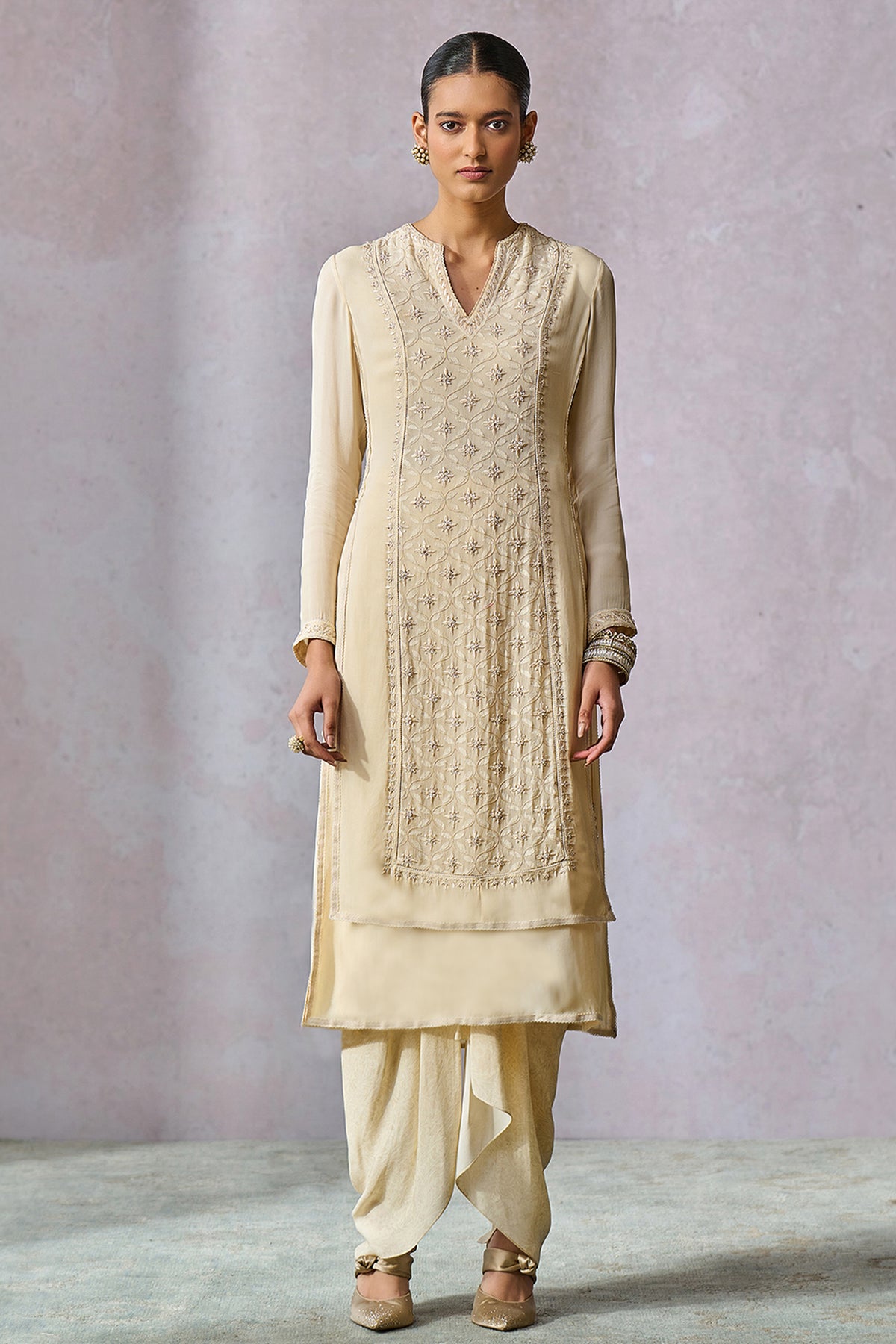 Hand embroidered chikankari double layered kurta with tie-up detail accentuated with sequins, beads and pearls is paired with fluid pants with chikankari embroidered side panels.