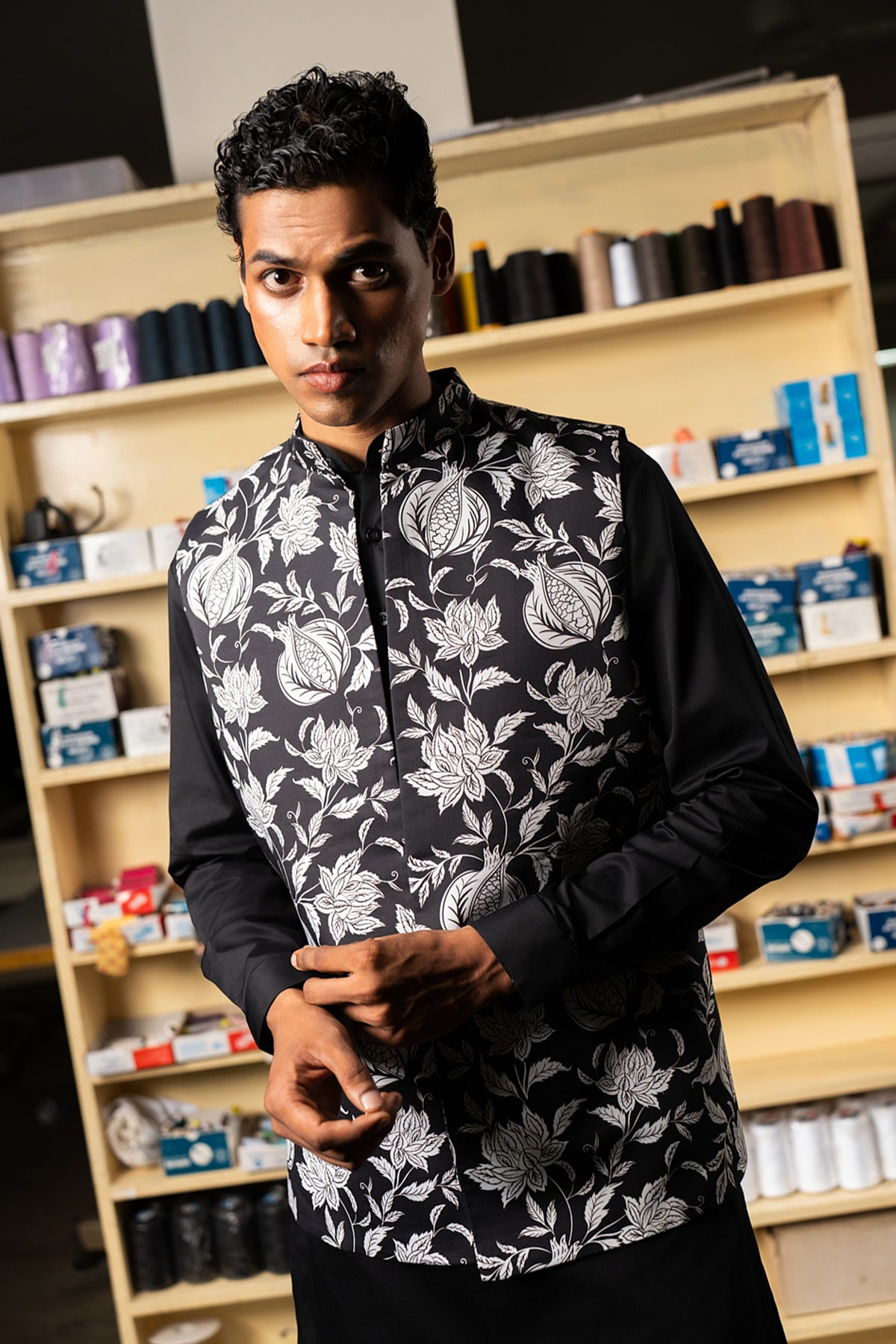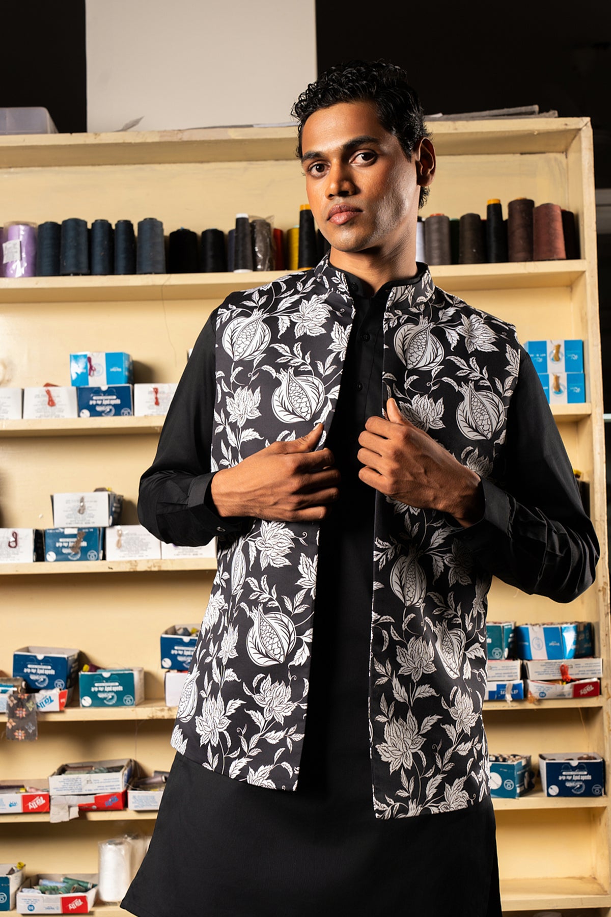 A printed open-style bandi crafted from premium cotton satin, featuring a classic mandarin collar and a sleek, buttonless design. The dual toned anar print is symbolic of the balance between its traditional and modern aesthetic. The bandi includes a concealed inner pocket for added functionality. Please note: This listing is for the bandi only.