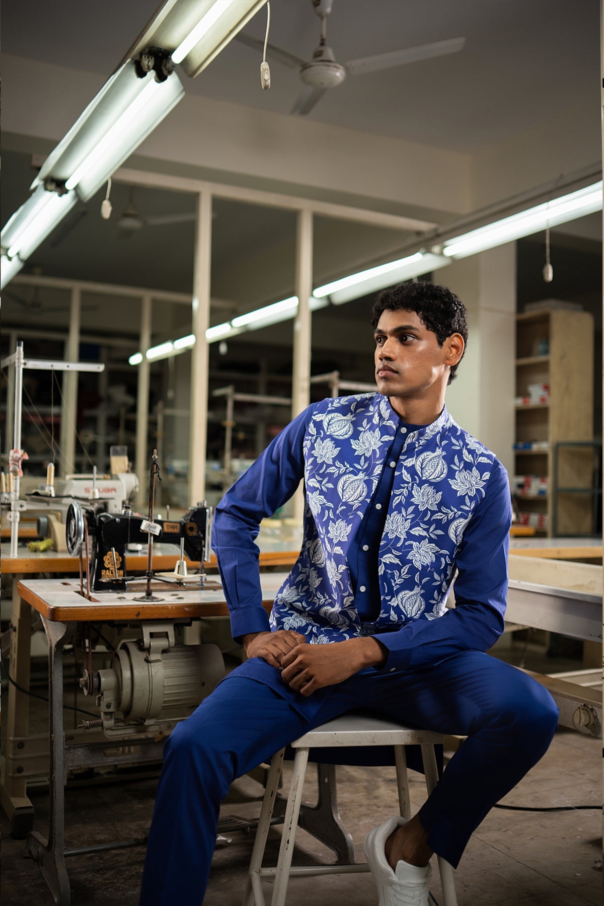 A printed open-style bandi crafted from premium cotton satin, featuring a classic mandarin collar and a sleek, buttonless design. The dual toned anar print is symbolic of the balance between its traditional and modern aesthetic. The Bandi includes a concealed inner pocket for added functionality. Please note: This listing is for the bandi only.