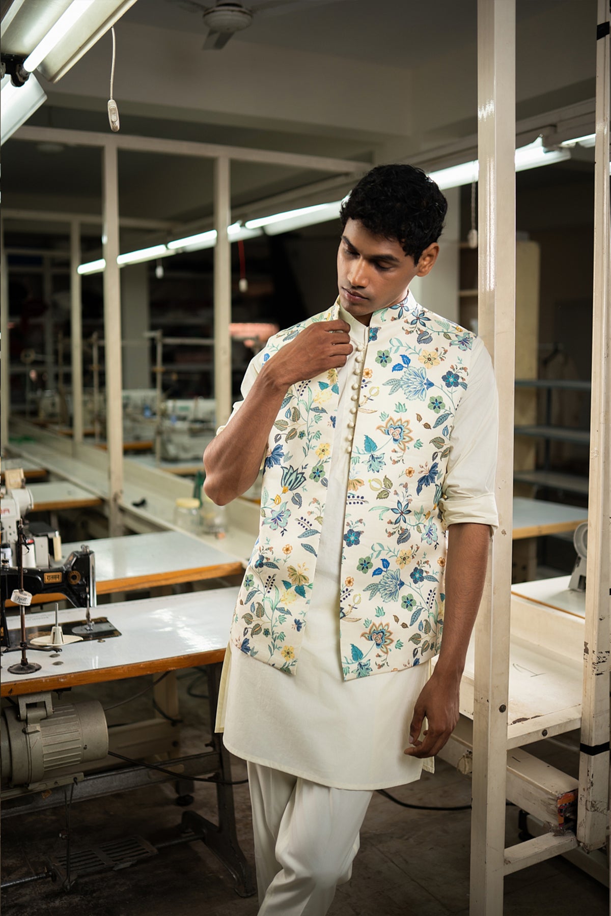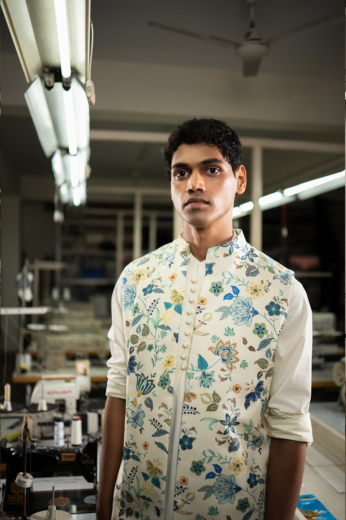 A printed open-style bandi made from premium cotton satin, featuring a timeless mandarin collar and buttonless design. The exclusive print, inspired by classic chintz, showcases multicolored floral motifs and includes a concealed inner pocket for added functionality. Please note: this listing is for the bandi only.