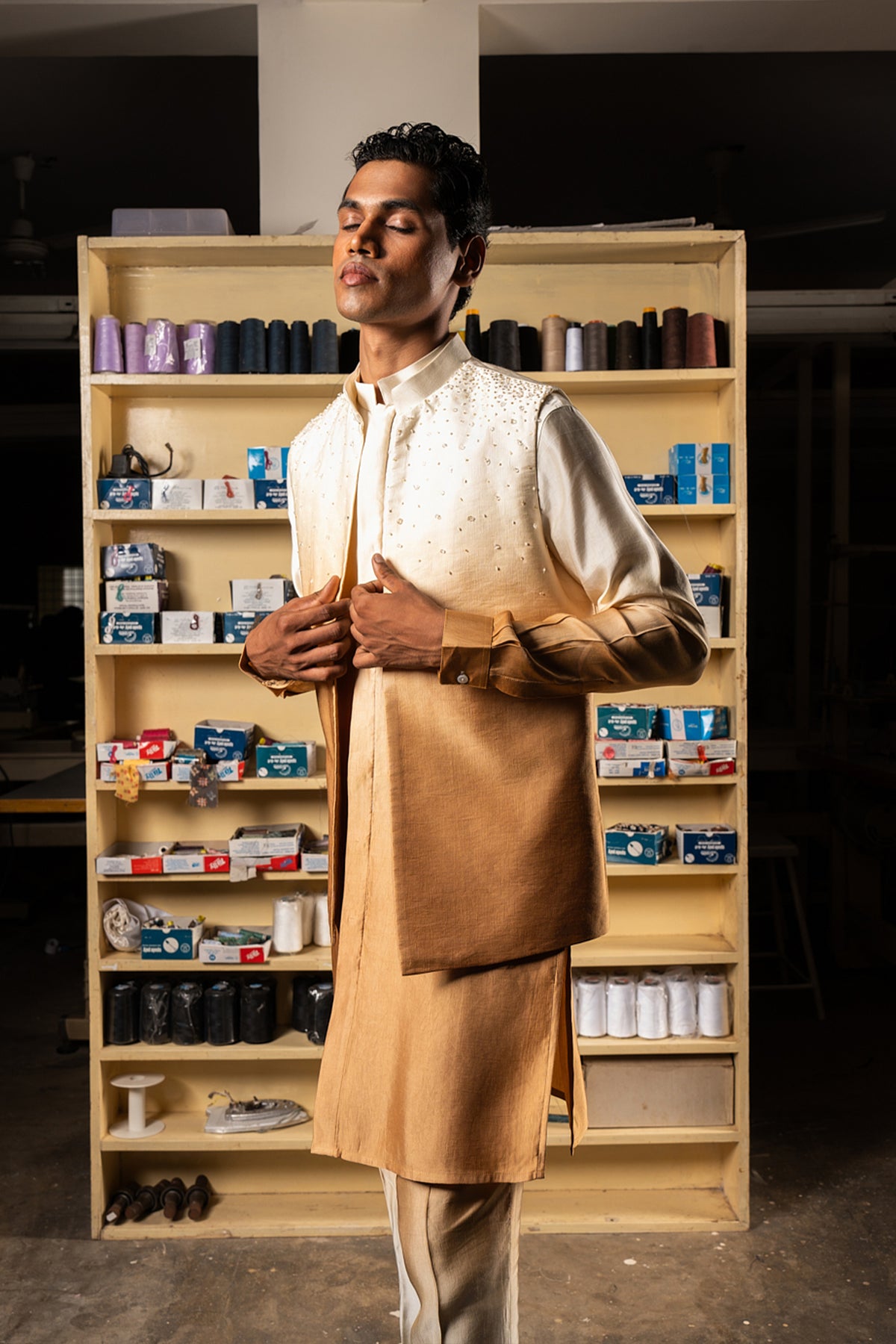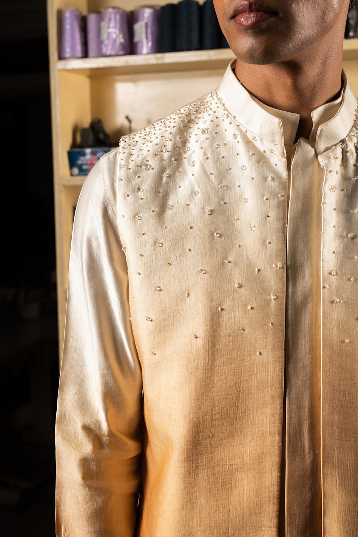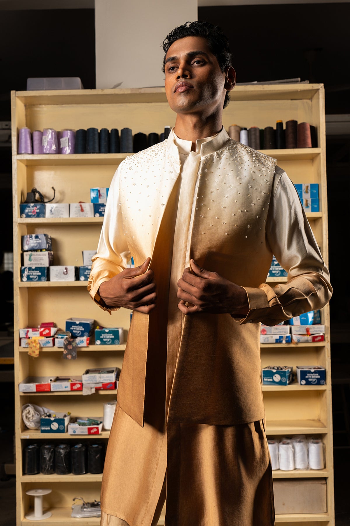 The open-style bandi, crafted with luxurious linen satin dyed with a rich gradient ombre, adding depth and dimension to this monochromatic look. It features a classic mandarin collar and a sleek, buttonless design that includes a concealed inner pocket for added functionality. 'Dripped in ice' with hand embroidered cut beads, seed beads and clear irregular crystal chips that catch the light like diamonds, giving it a understated modern elegance. Please note: This listing is for the bandi only.