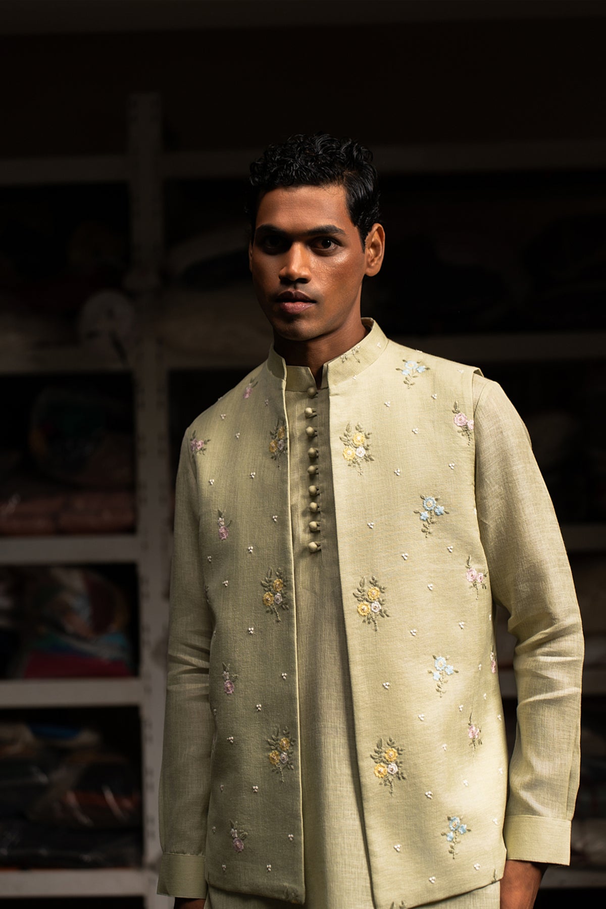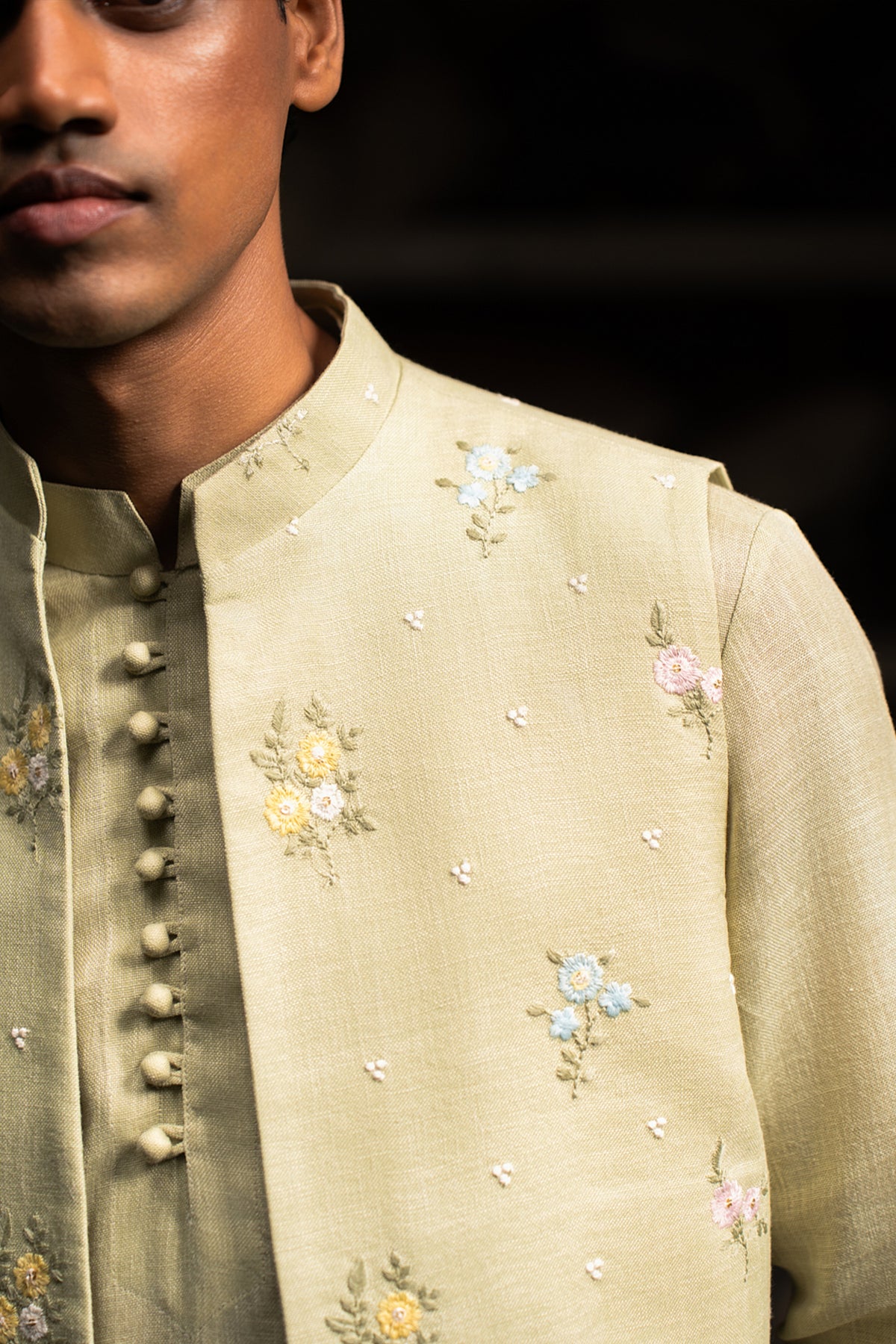 Crafted in a classic sage-colored cotton linen blend, this open bandi features a timeless mandarin collar and a discreet inside pocket for added functionality. Delicate thread-embroidered floral motifs add subtle texture, elevating the minimalist design with a touch of elegance. This versatile bandi is perfect for layering, offering a refined yet understated look that is an essential wardrobe addition for the classic man. Please note: This listing is for the bandi only.