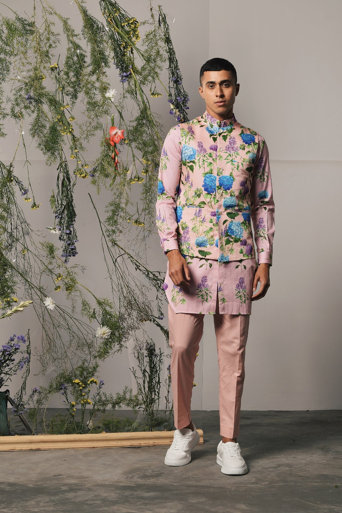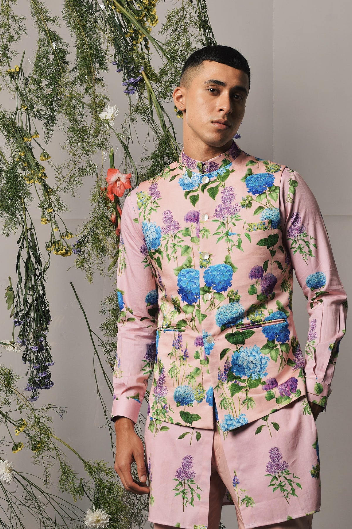 Floral print bandi constructed with a rich linen satin fabric. This bandi features laser cut mother of pearl shell buttons, a mandarin collar, one chest pocket and two hip pockets.