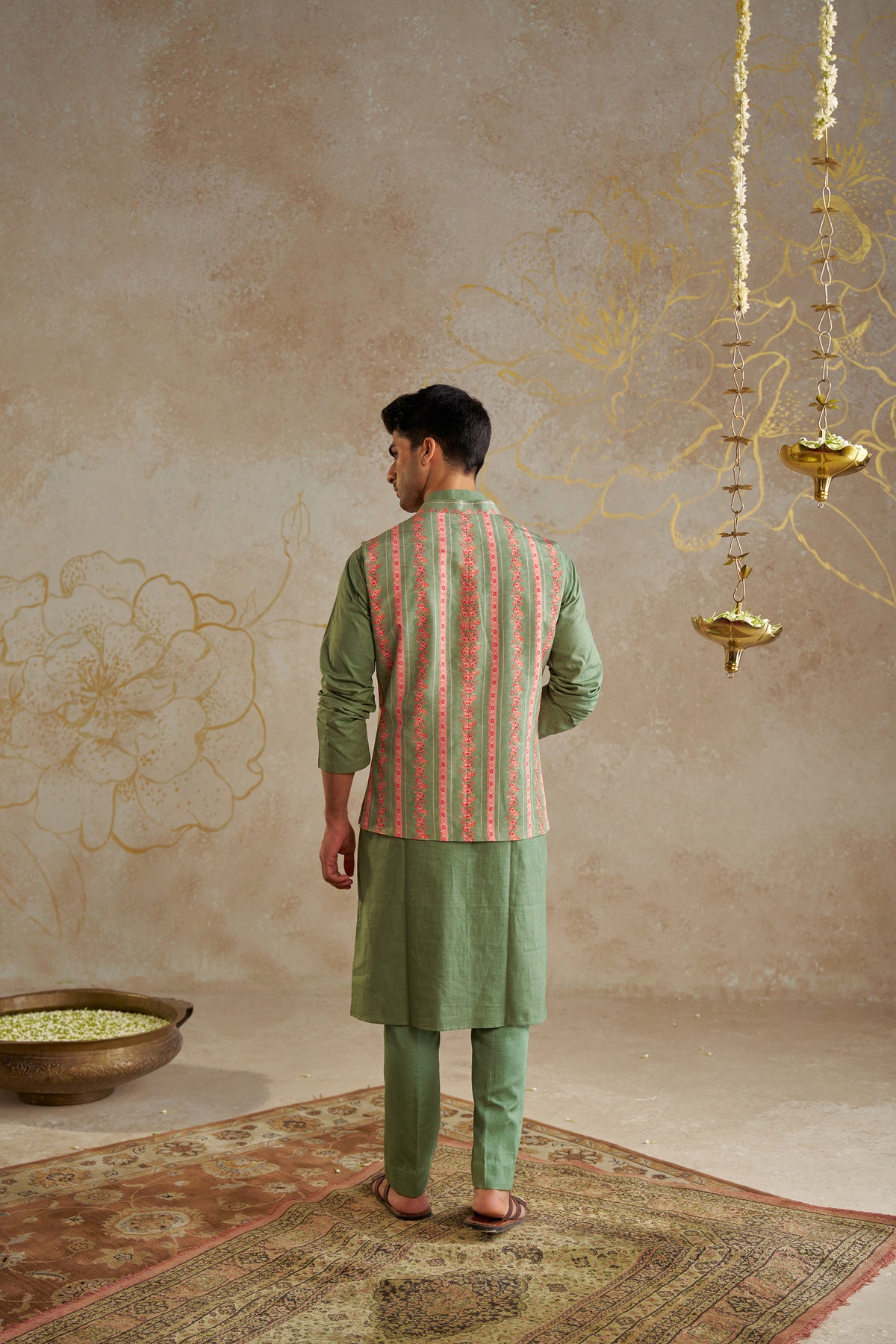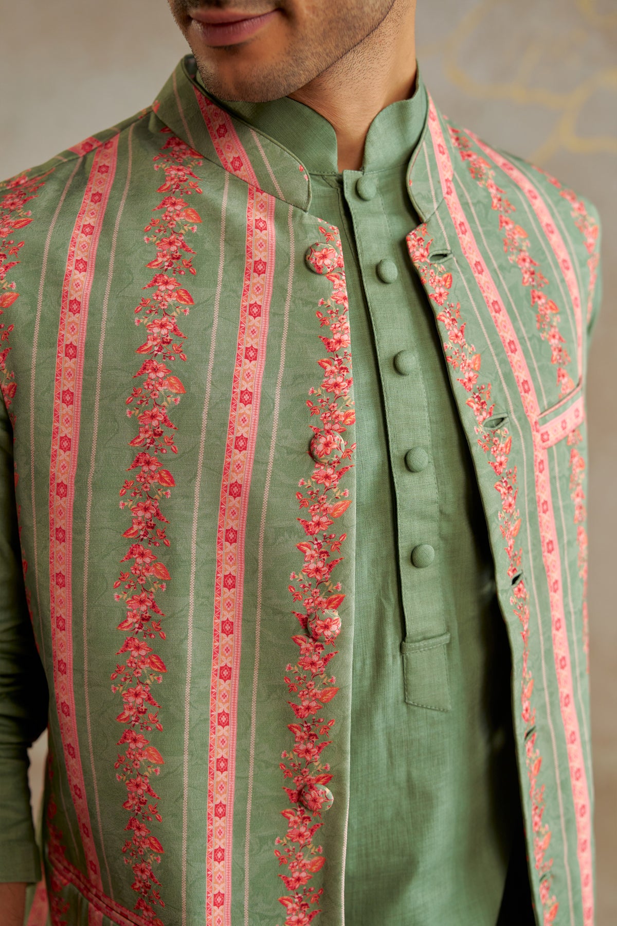 Featuring a sage green chinese collar kurta with pants. This set comes with a sage green printed bundi jacket