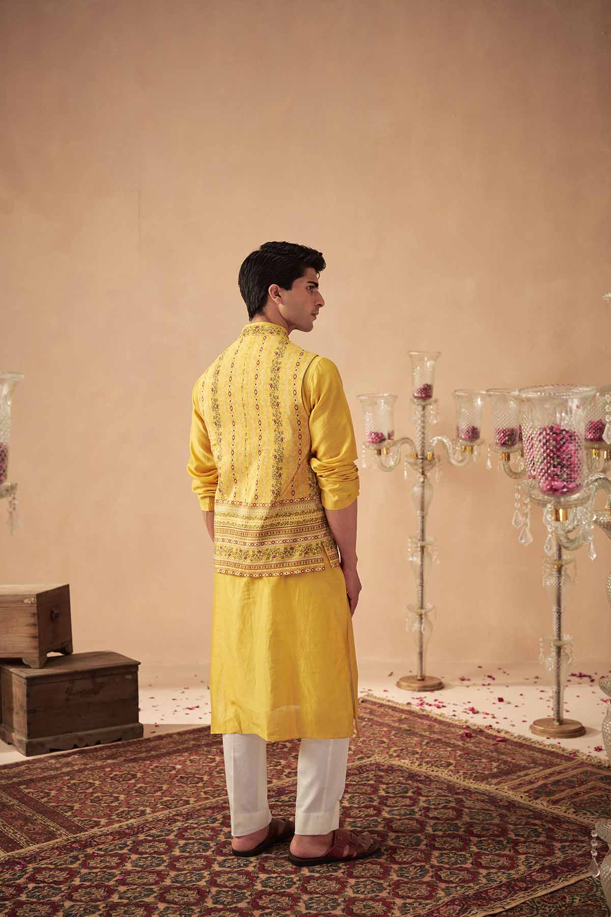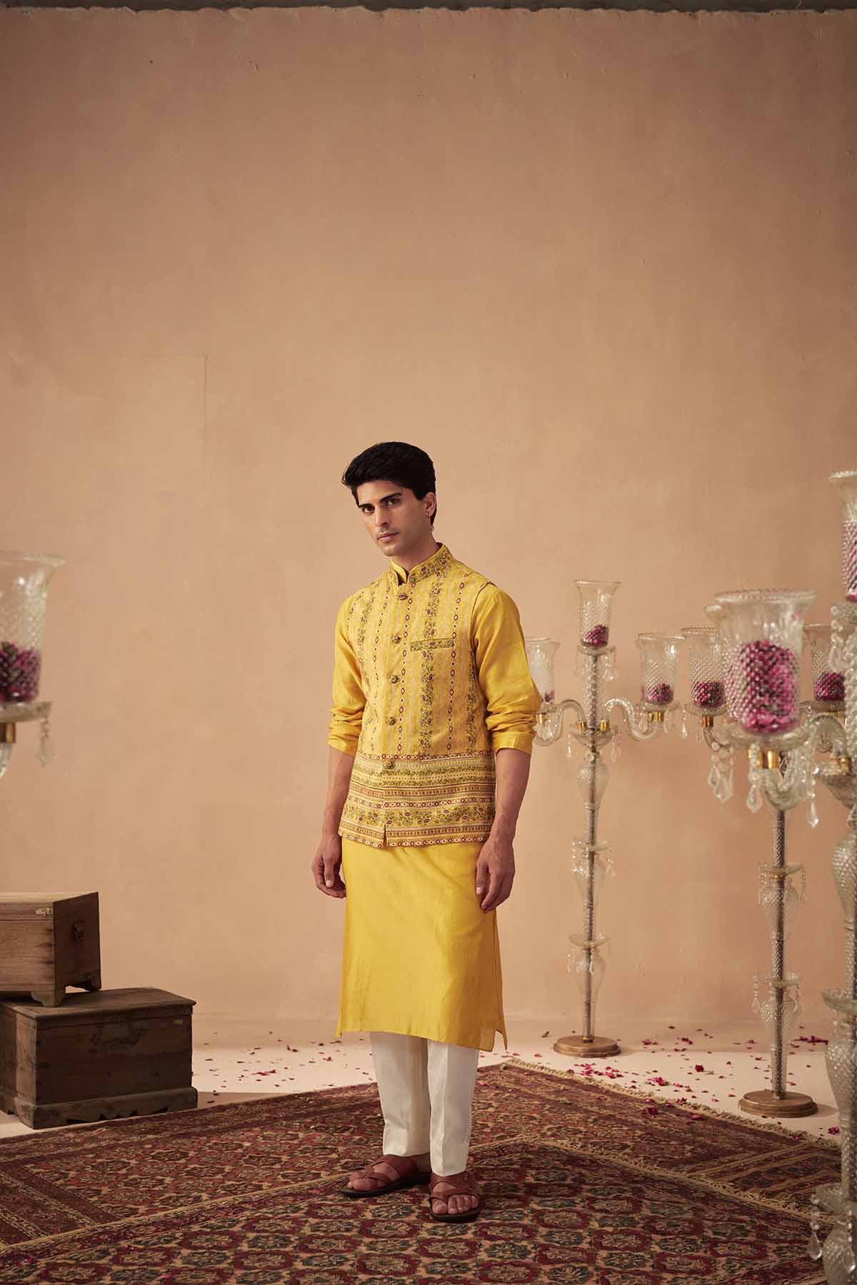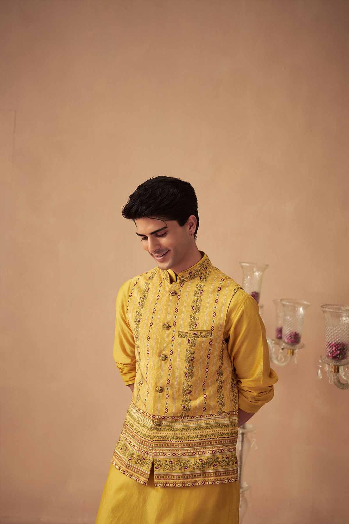 Featuring a yellow printed bundi paired with a solid yellow kurta and white pants.