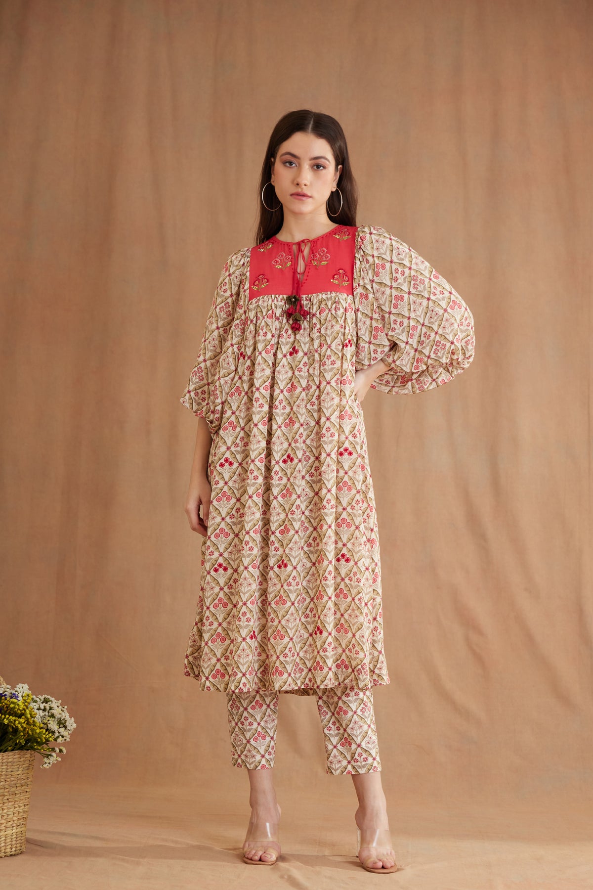 Featuring Bespoke mughal print tunic in 100% Viscose crepe with floral sequins and bead embroidery and stitch detailing on the yoke and hand made organdy flower tassels. It is paired with a matching tailored pants.