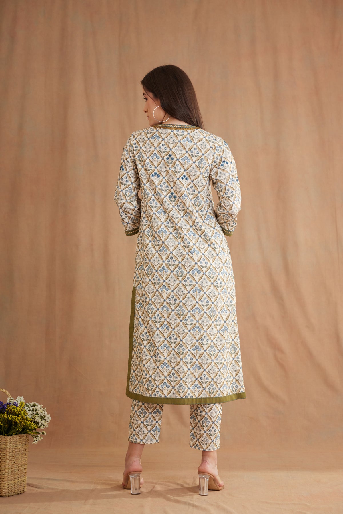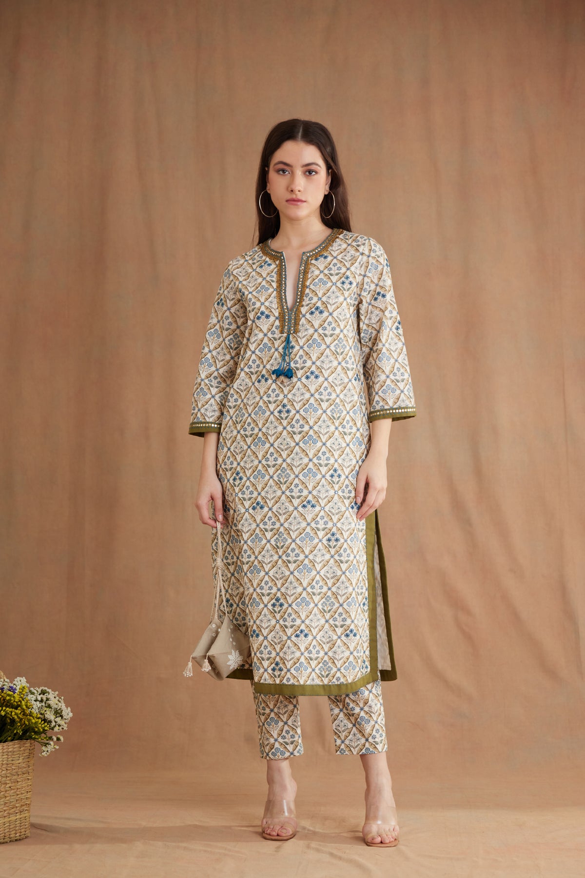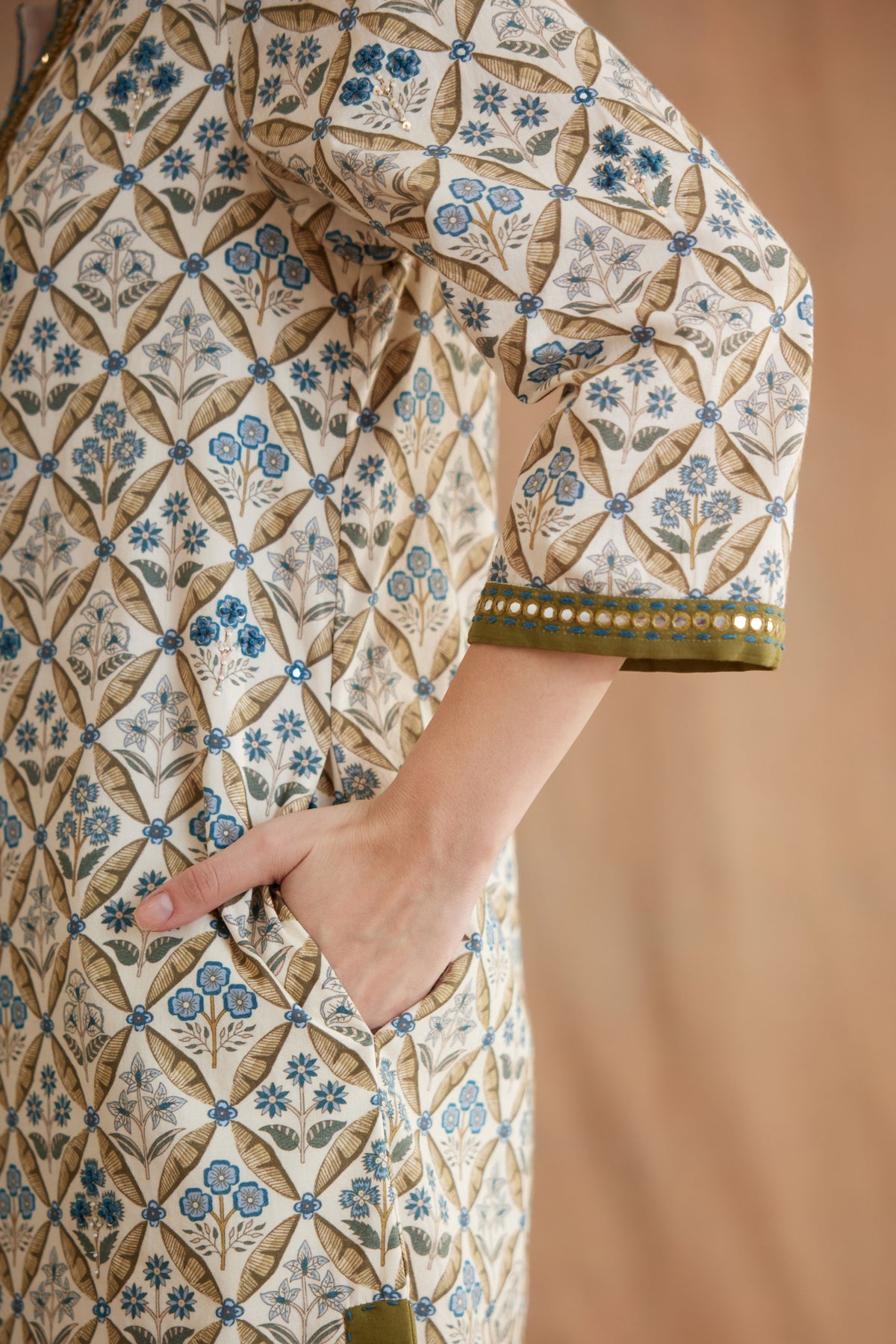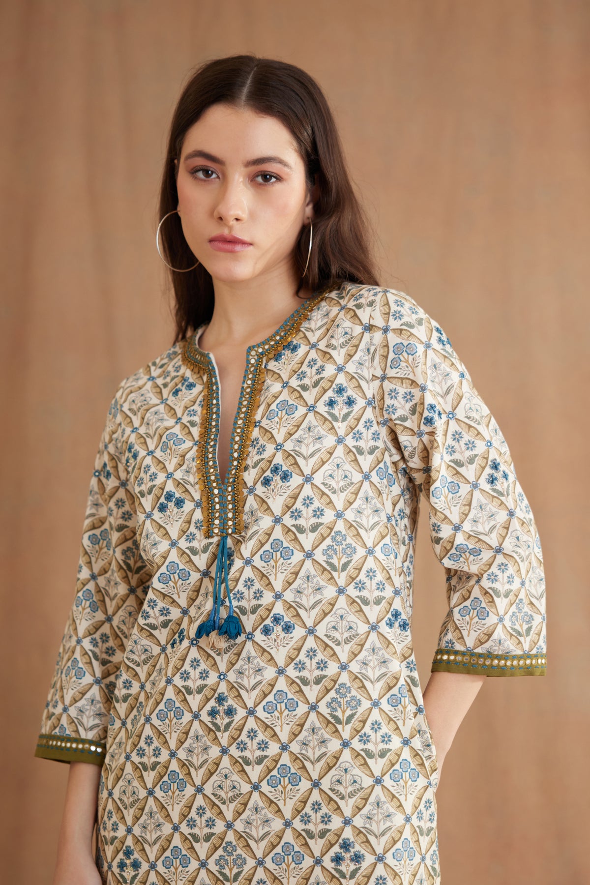 Featuring Bespoke mughal print tunic in 100% Cotton poplin with antique brass sequins and mirror embroideries details on the neckline, sleeves and stitch details at the bottom. It is paired with a matching tailored pants.