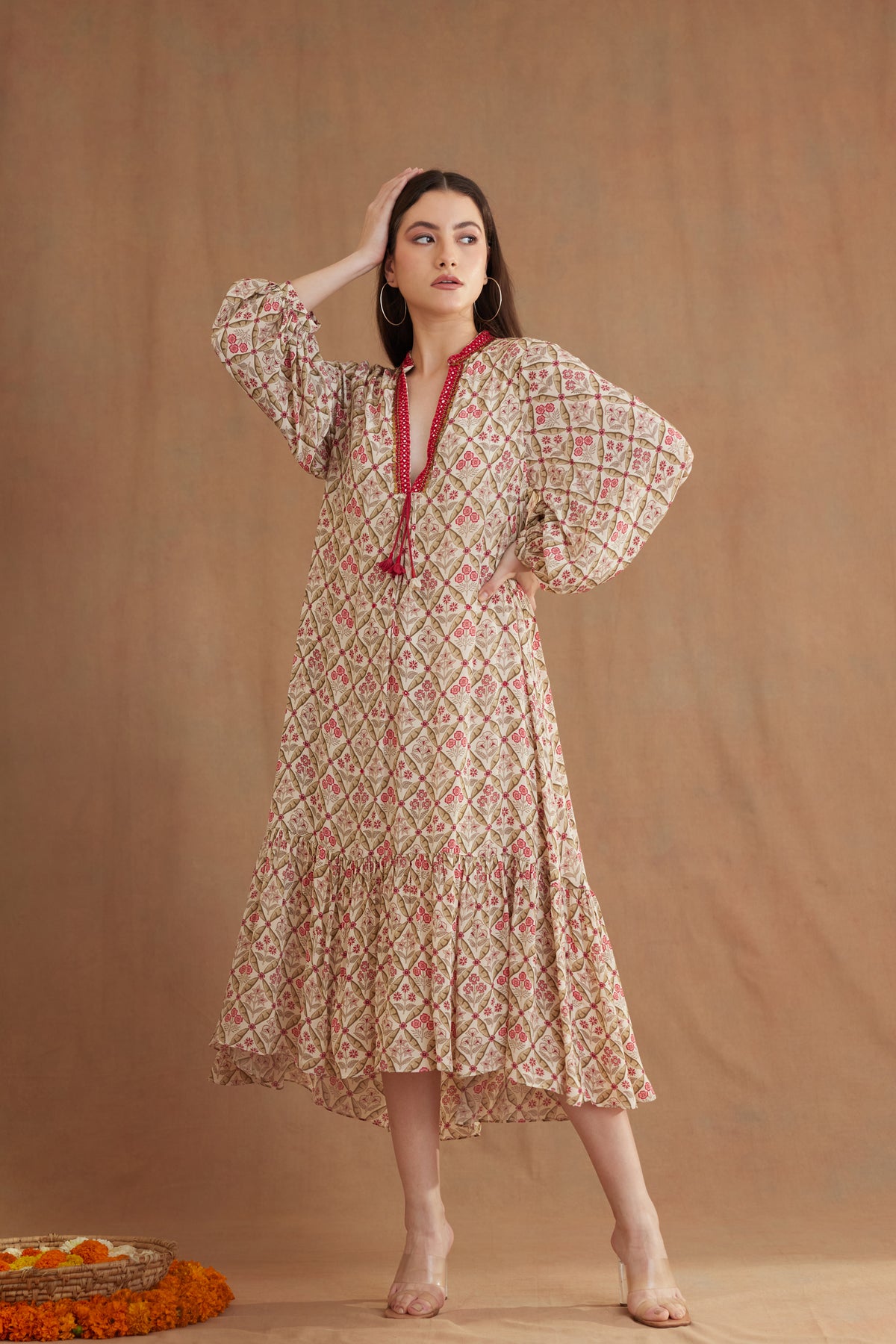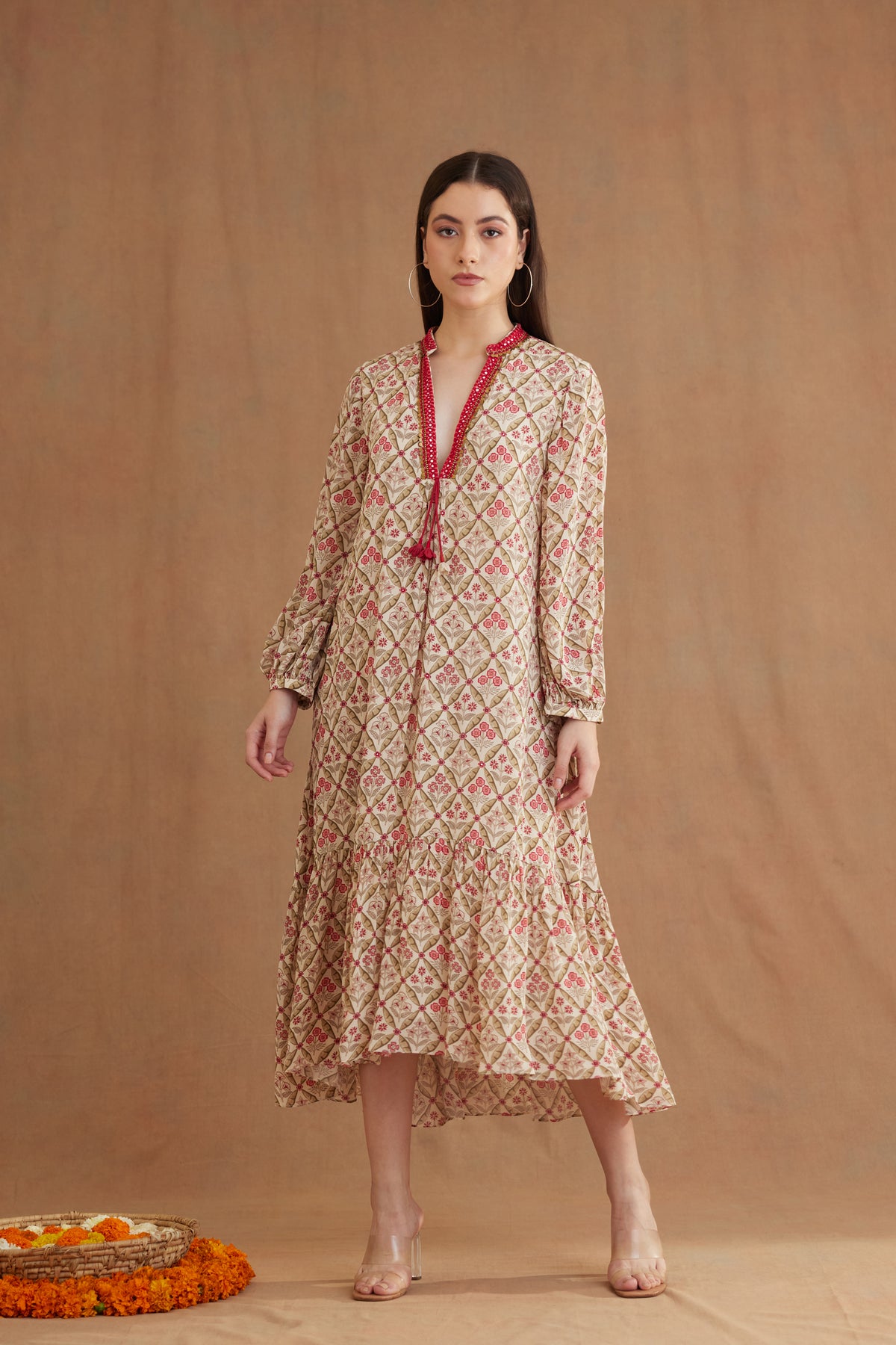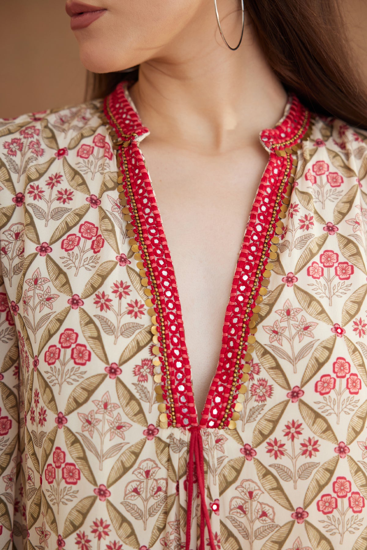 Featuring Bespoke mughal print tunic in 100% Viscose georgette with antique brass sequins and mirror embroidery details on the neckline and handmade organdy flower tassels.