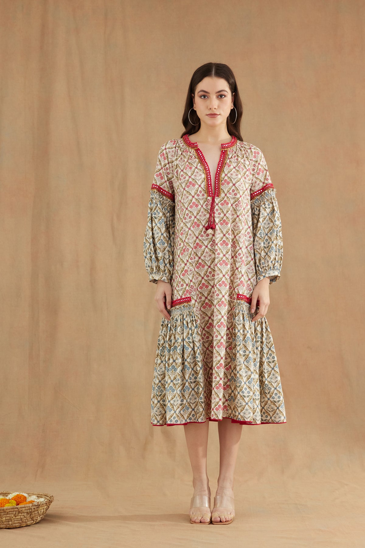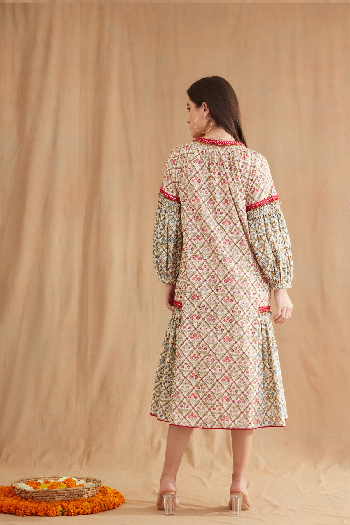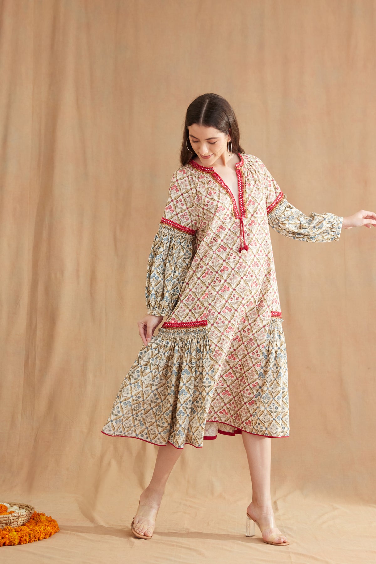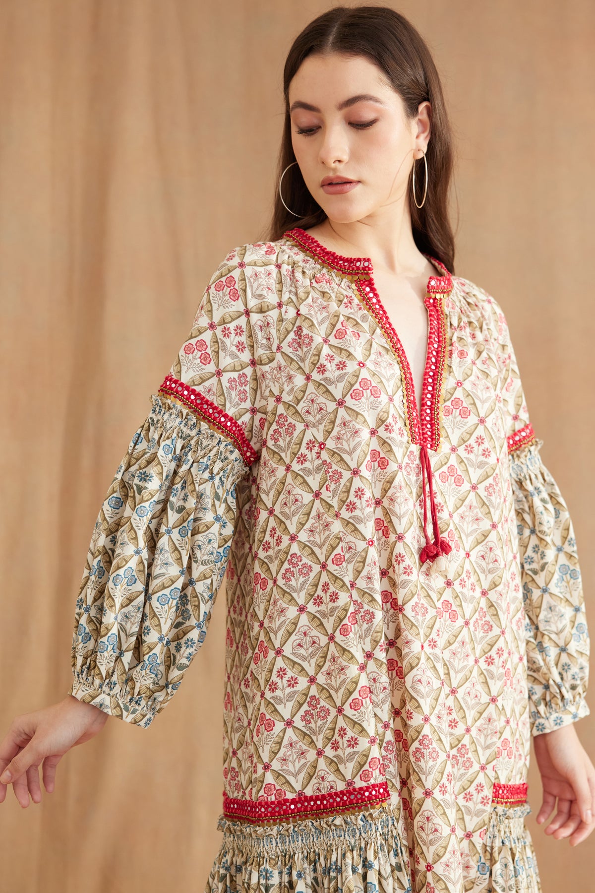 Featuring Bespoke mughal print tunic in 100% Cotton poplin with antique brass sequins and mirror embroidery on the neckline, side gathers and sleeves.