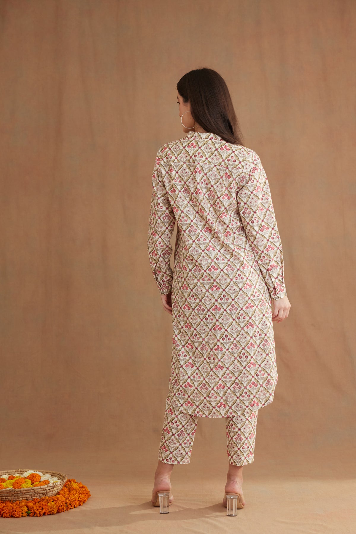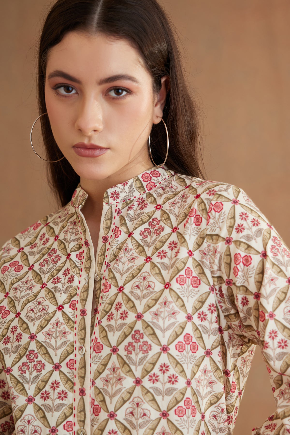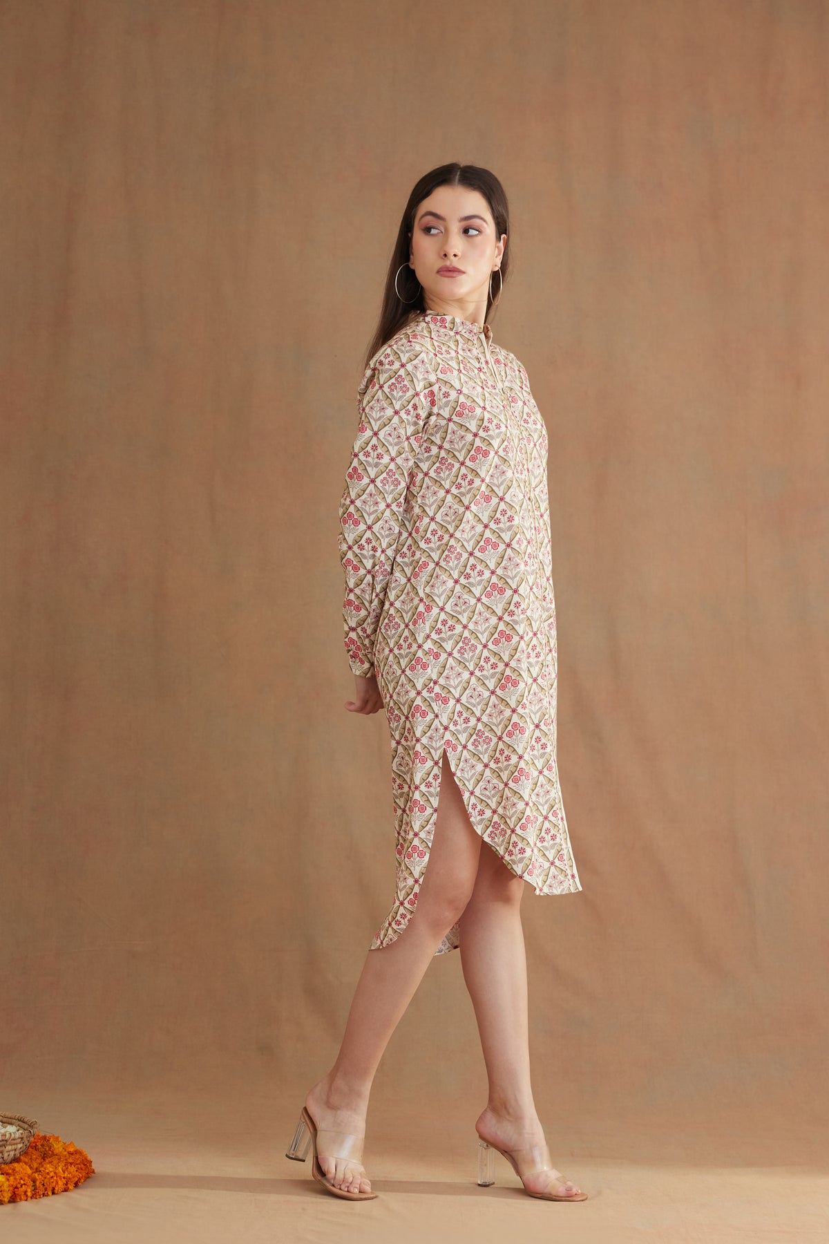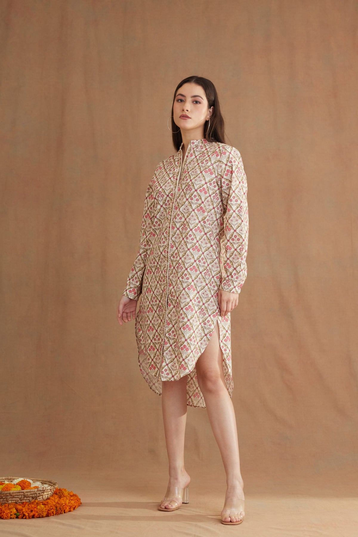 Featuring Bespoke mughal print hi-low shirt dress in 100% Cotton poplin with french knots and sequins embroidery on the shoulder and hand stitch detailing on the placket and cuffs.