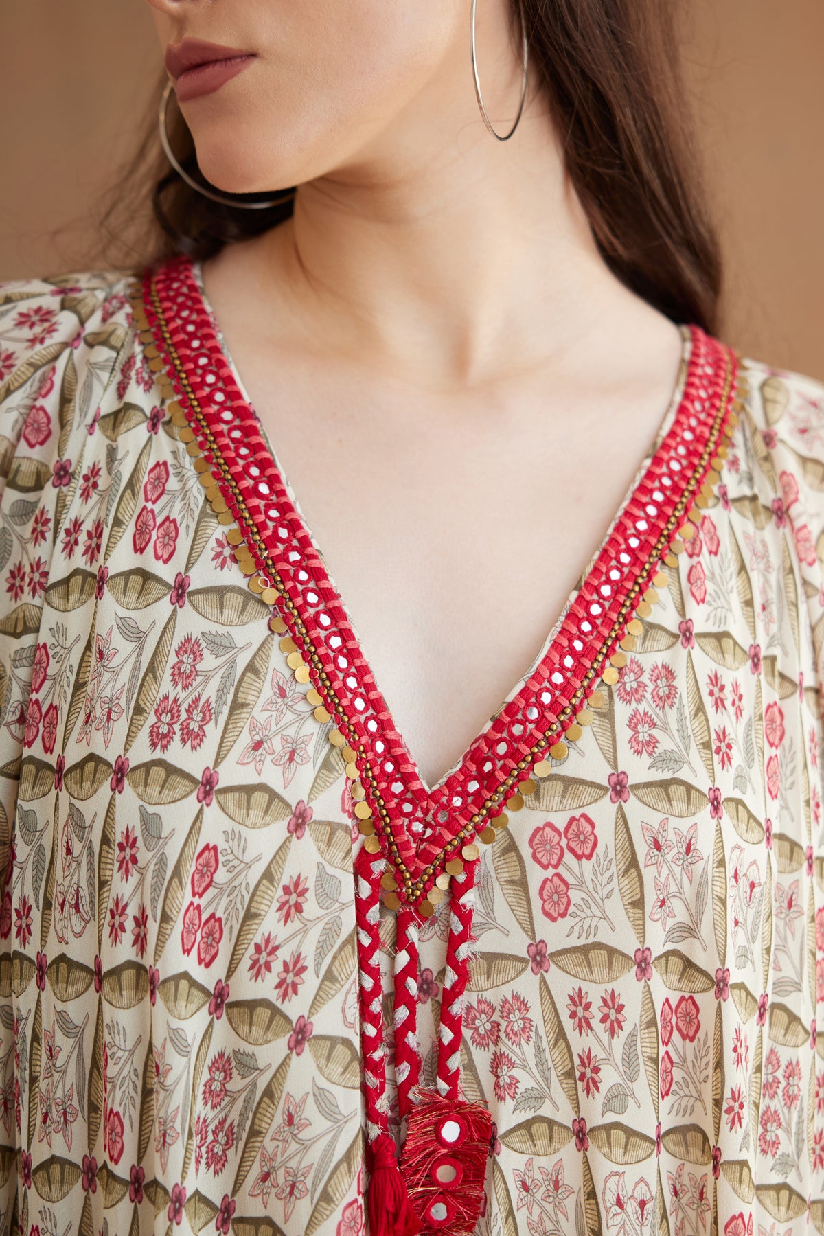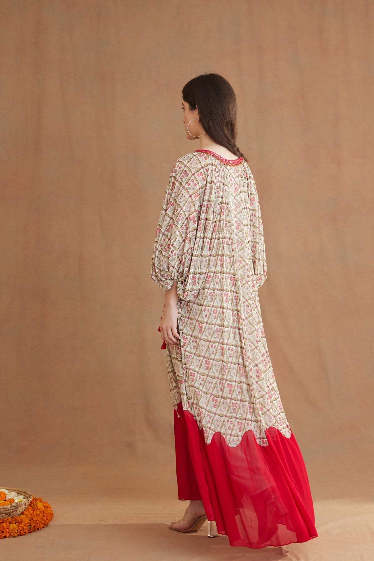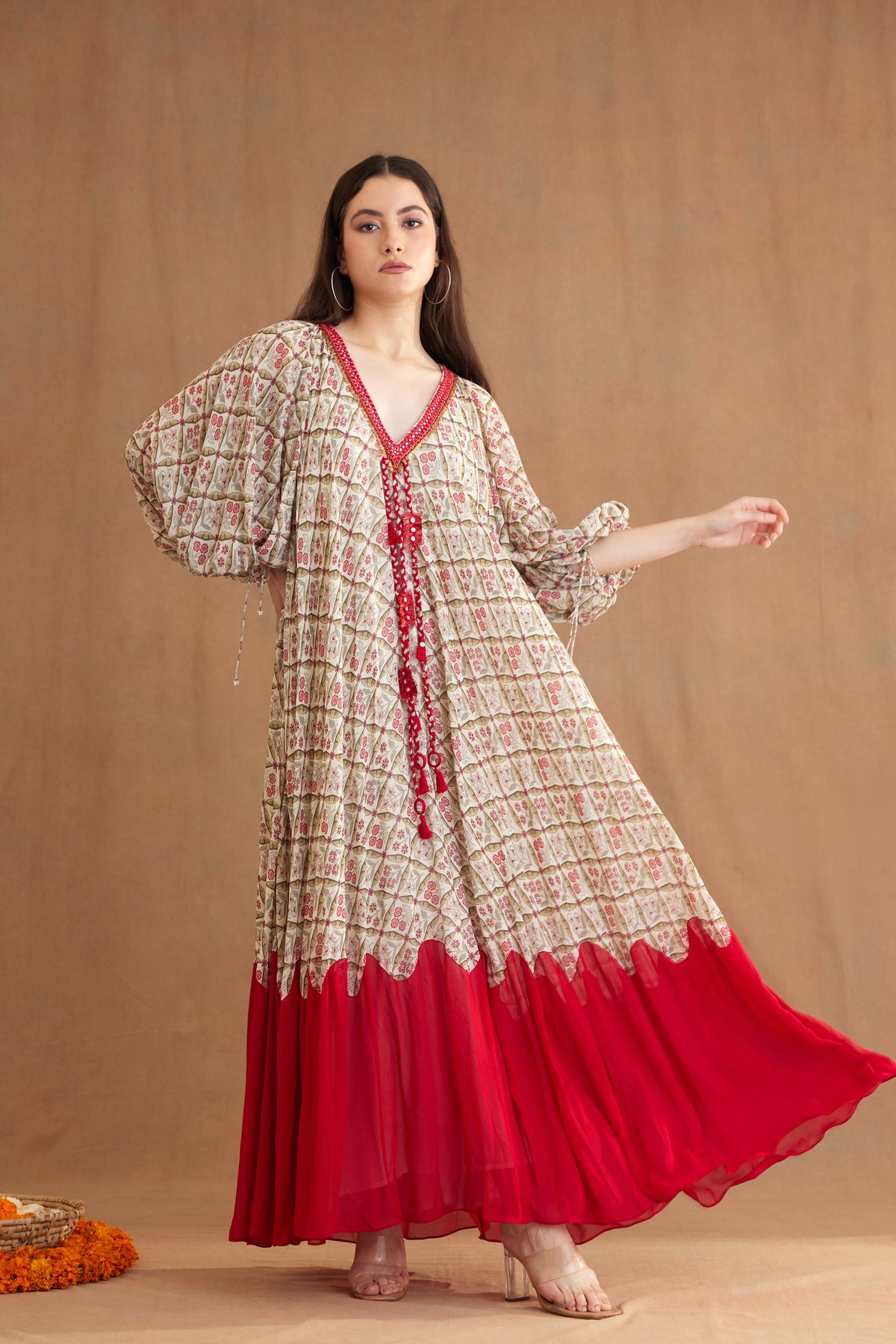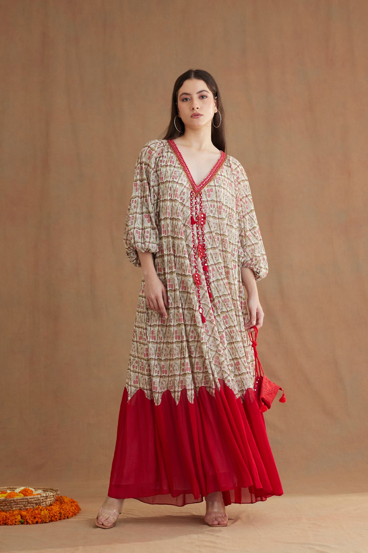 Featuring Bespoke mughal print maxi dress in 100% Viscose georgette with antique brass sequins and mirror embroidery details on the neckline and hand braided tassel detailing.