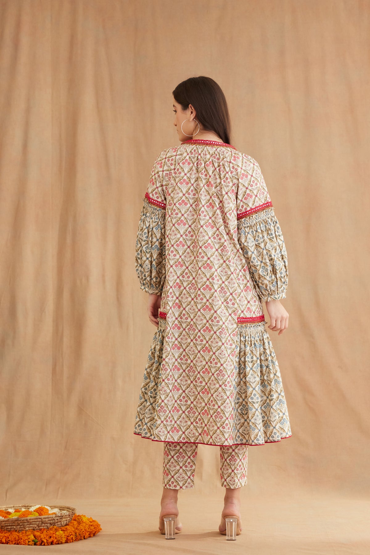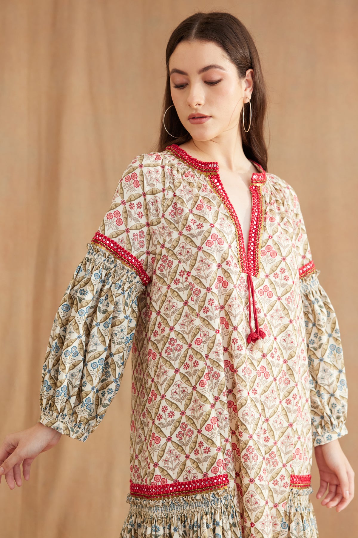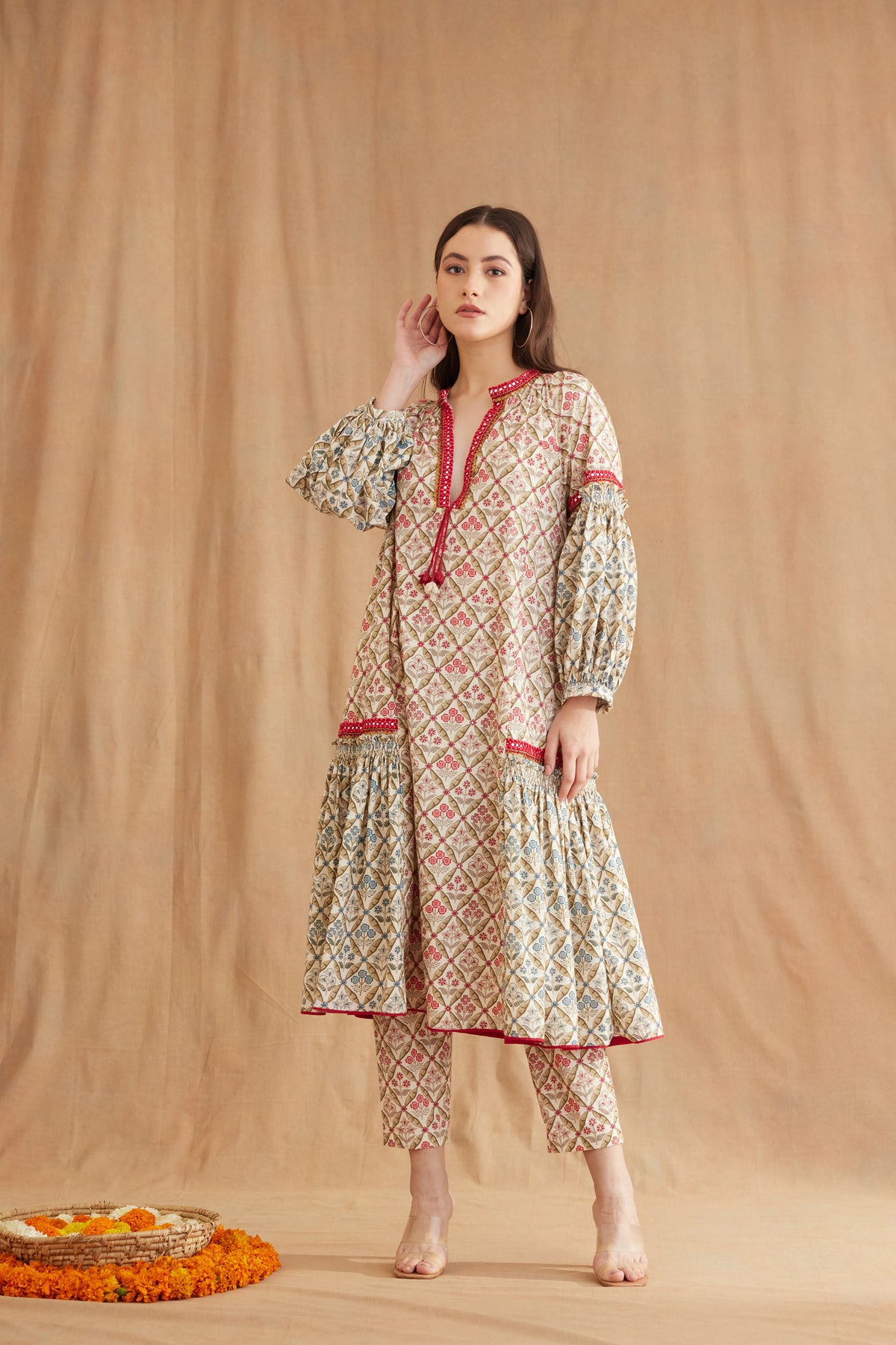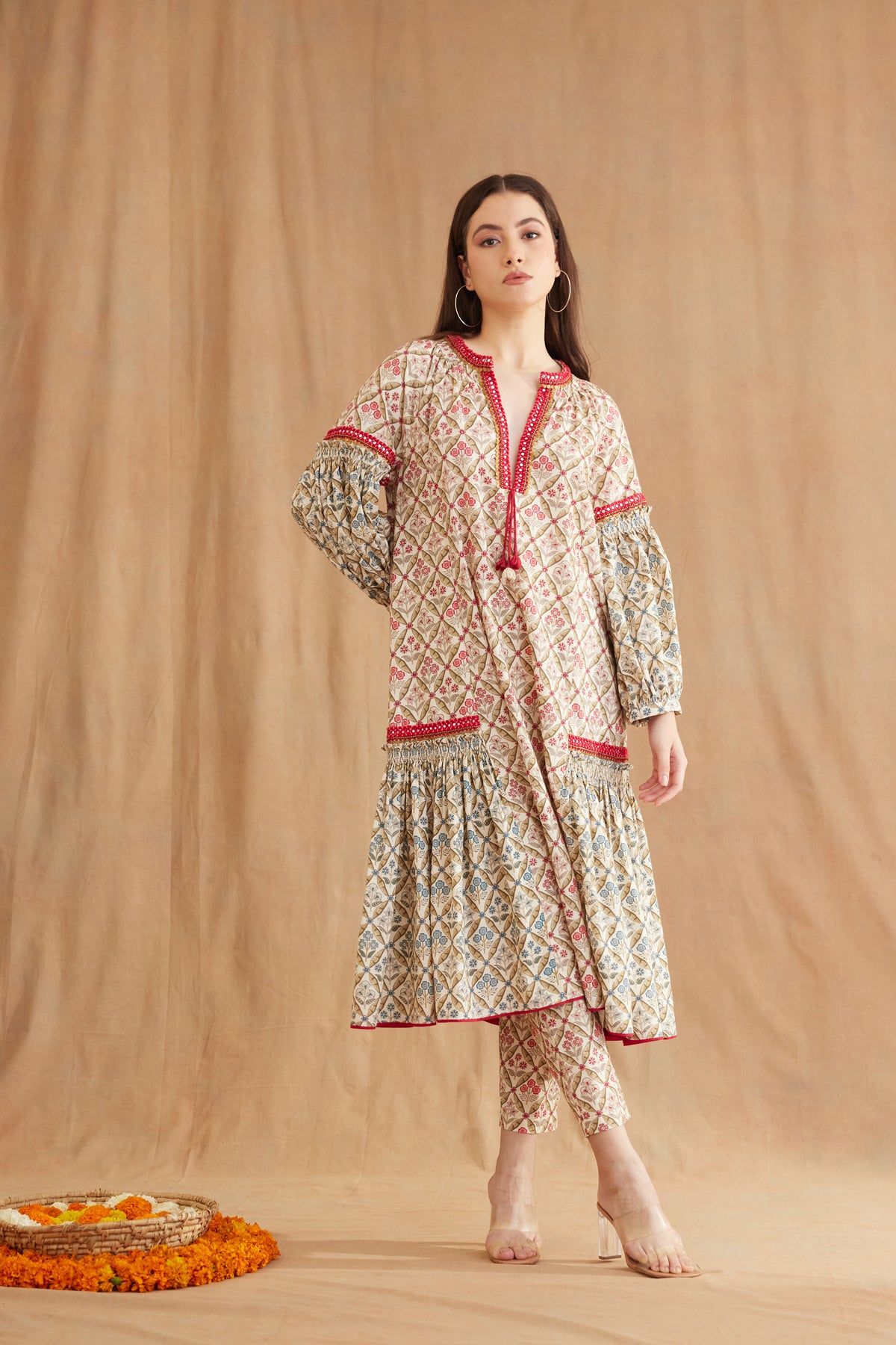 Featuring Bespoke mughal print tunic in 100% Cotton poplin with antique brass sequins and mirror embroidery on the neckline, side gathers and sleeves. It is paired with a matching tailored pants.