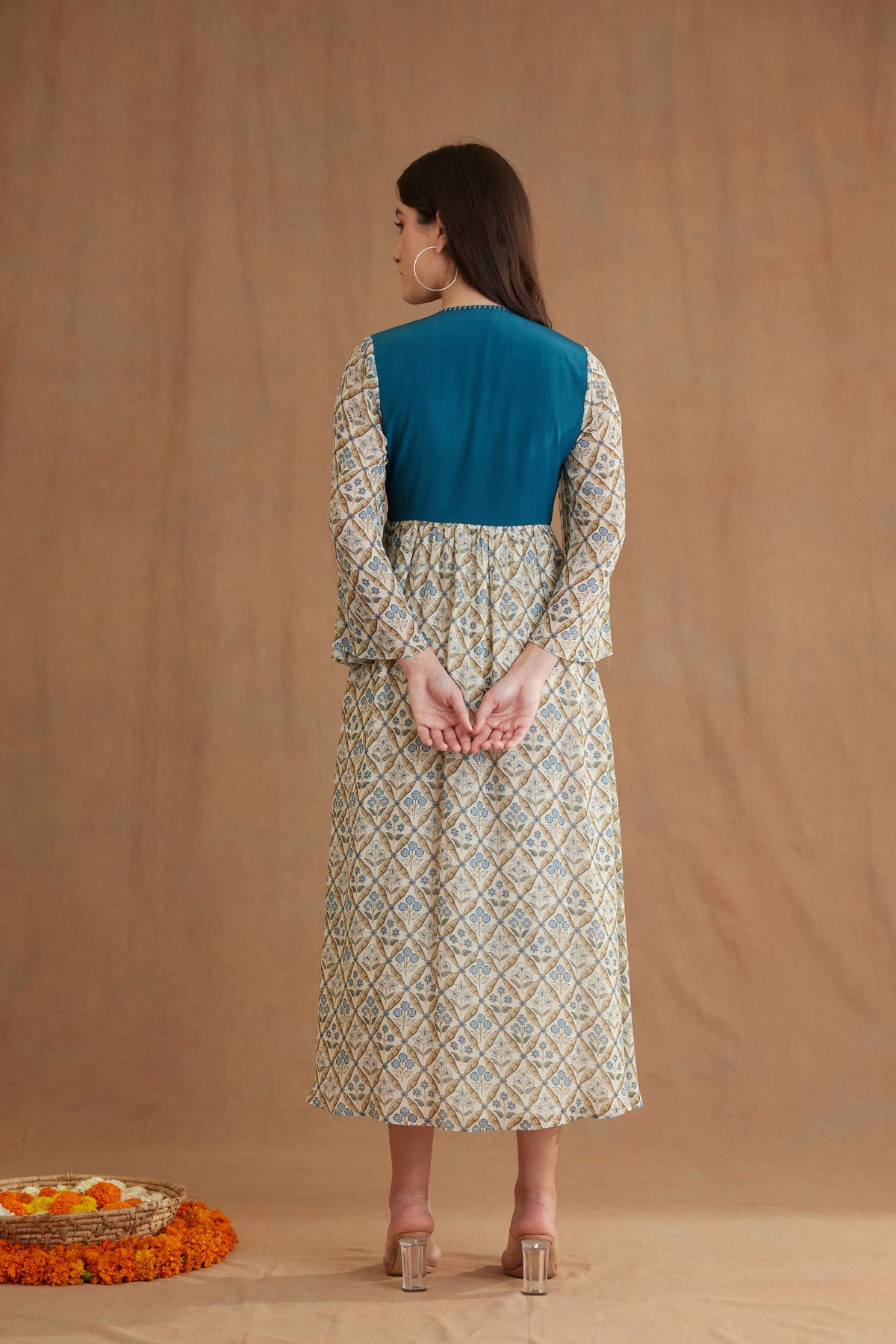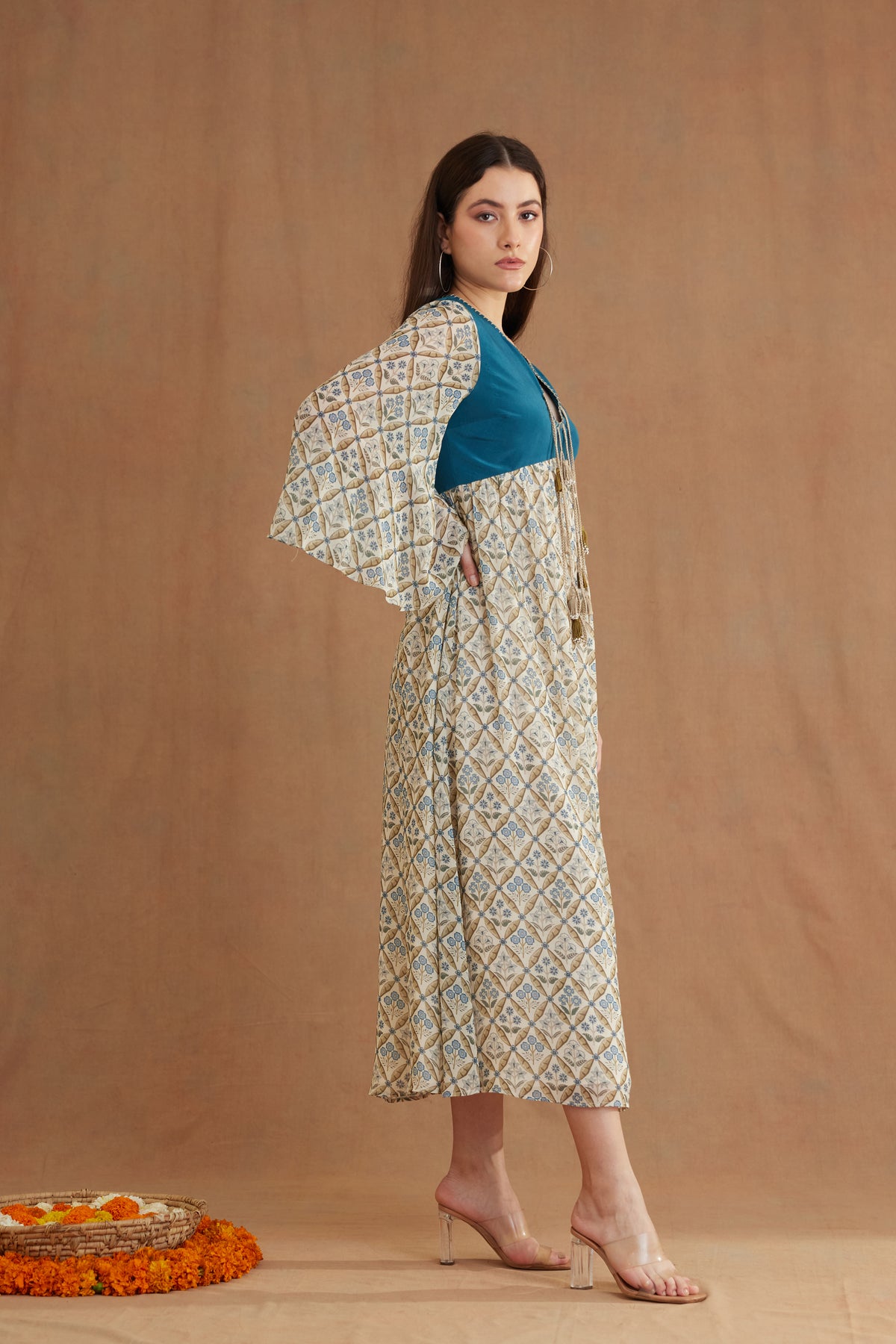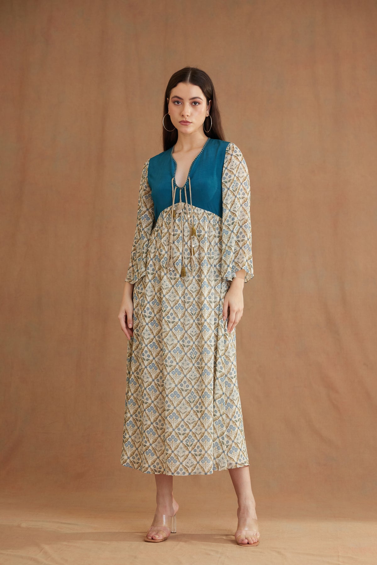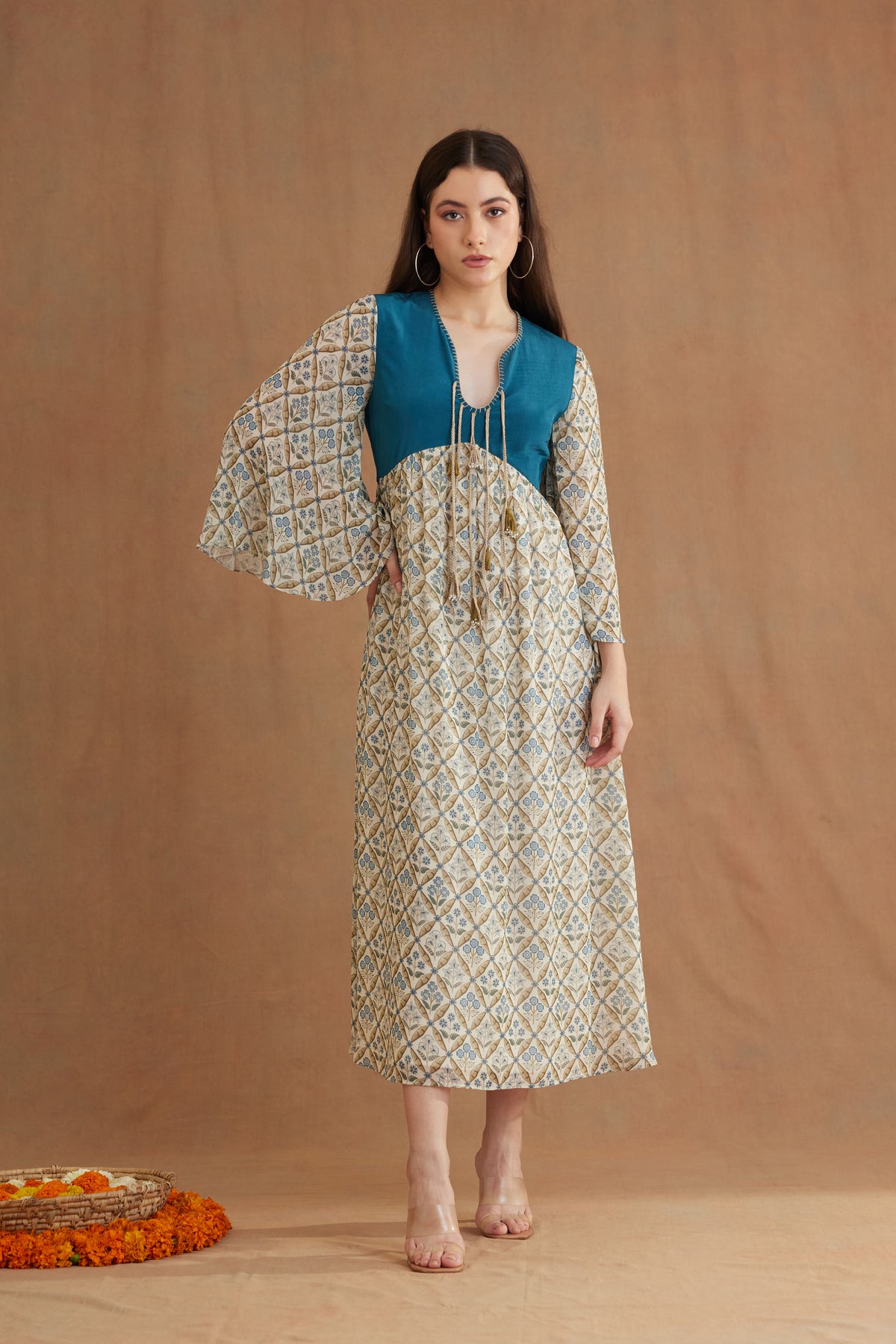 Featuring Bespoke mughal print dress in 100% Viscose crepe with hand-braided tassel detail on the neckline.