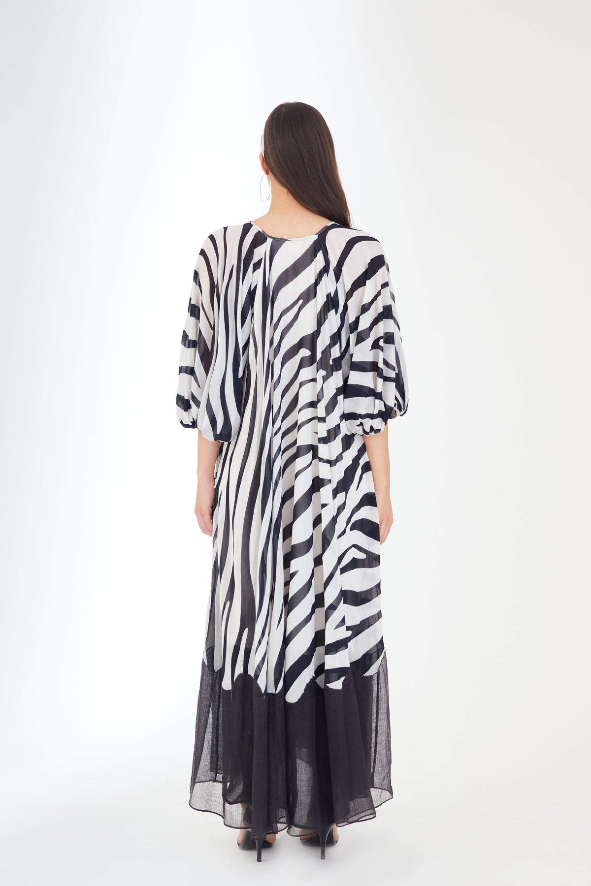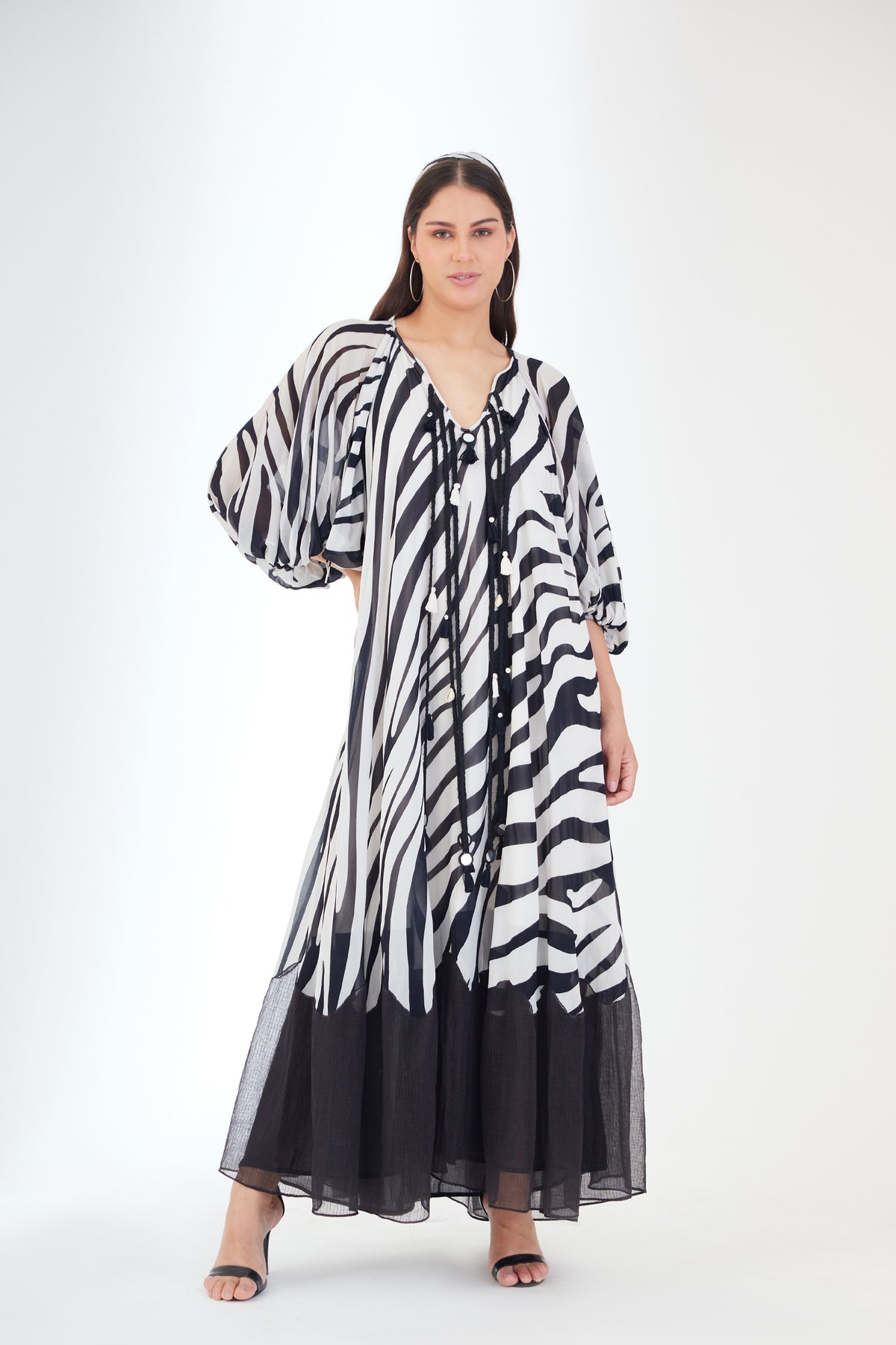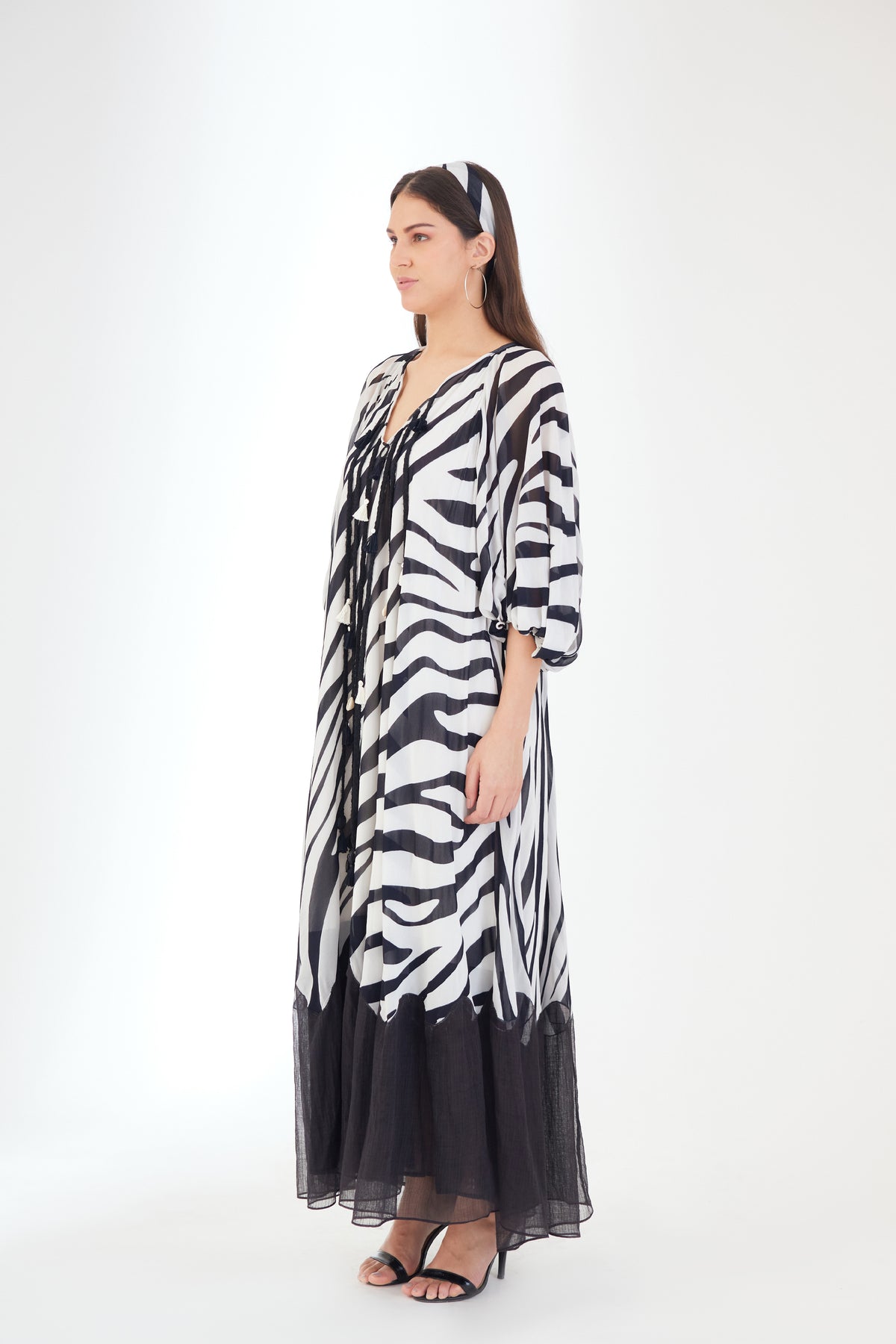 Featuring Black n whitel animal print maxi dress in 100% Viscose georgette with hand braided tassel details around the neckline and kota doriya tier at the bottom.