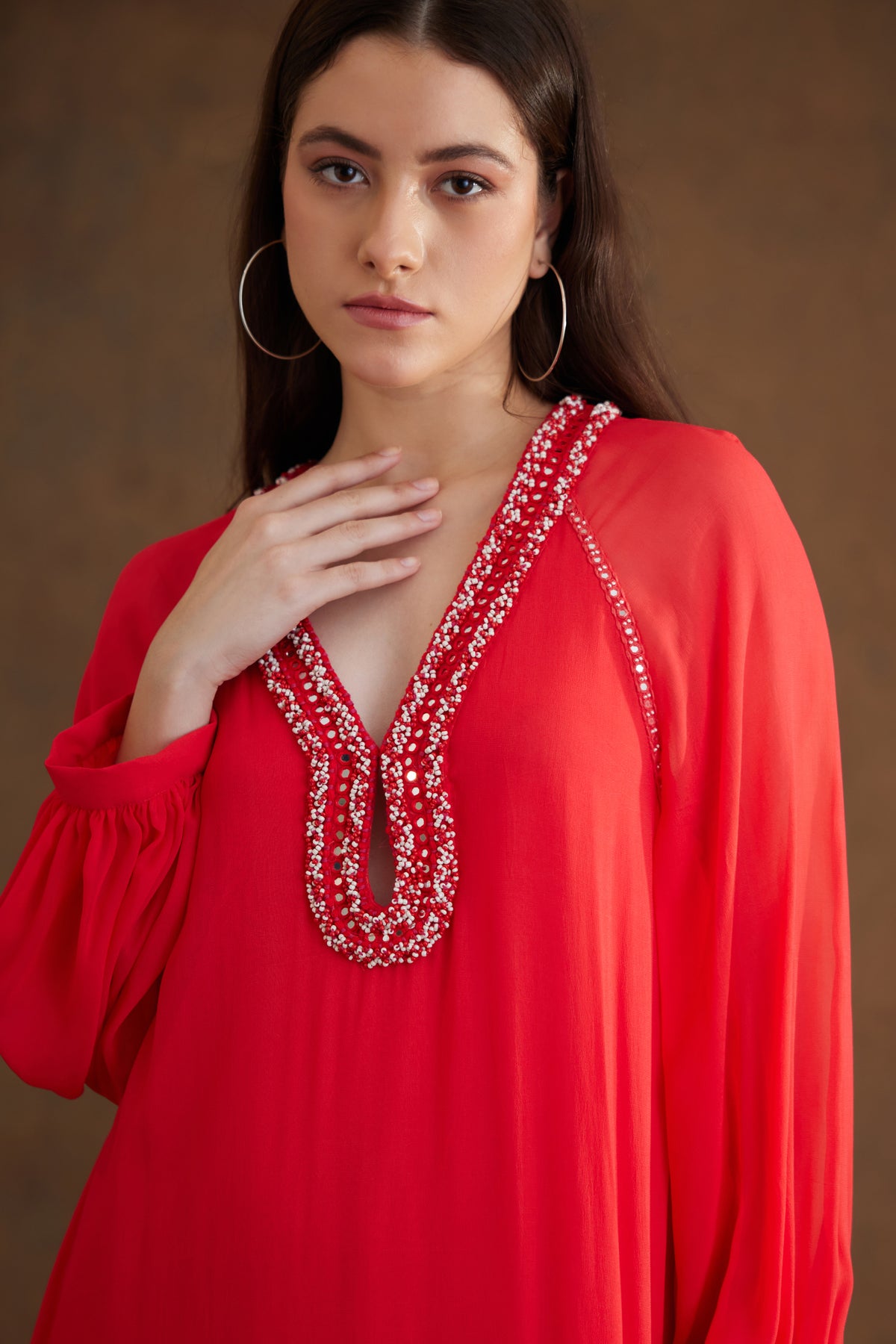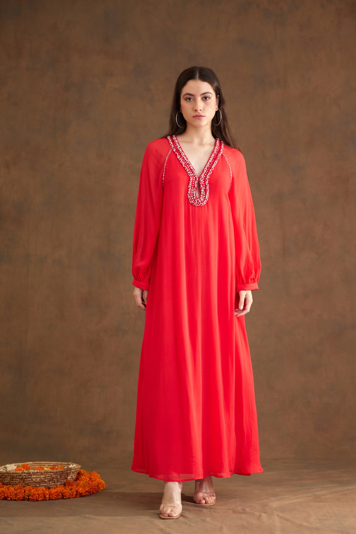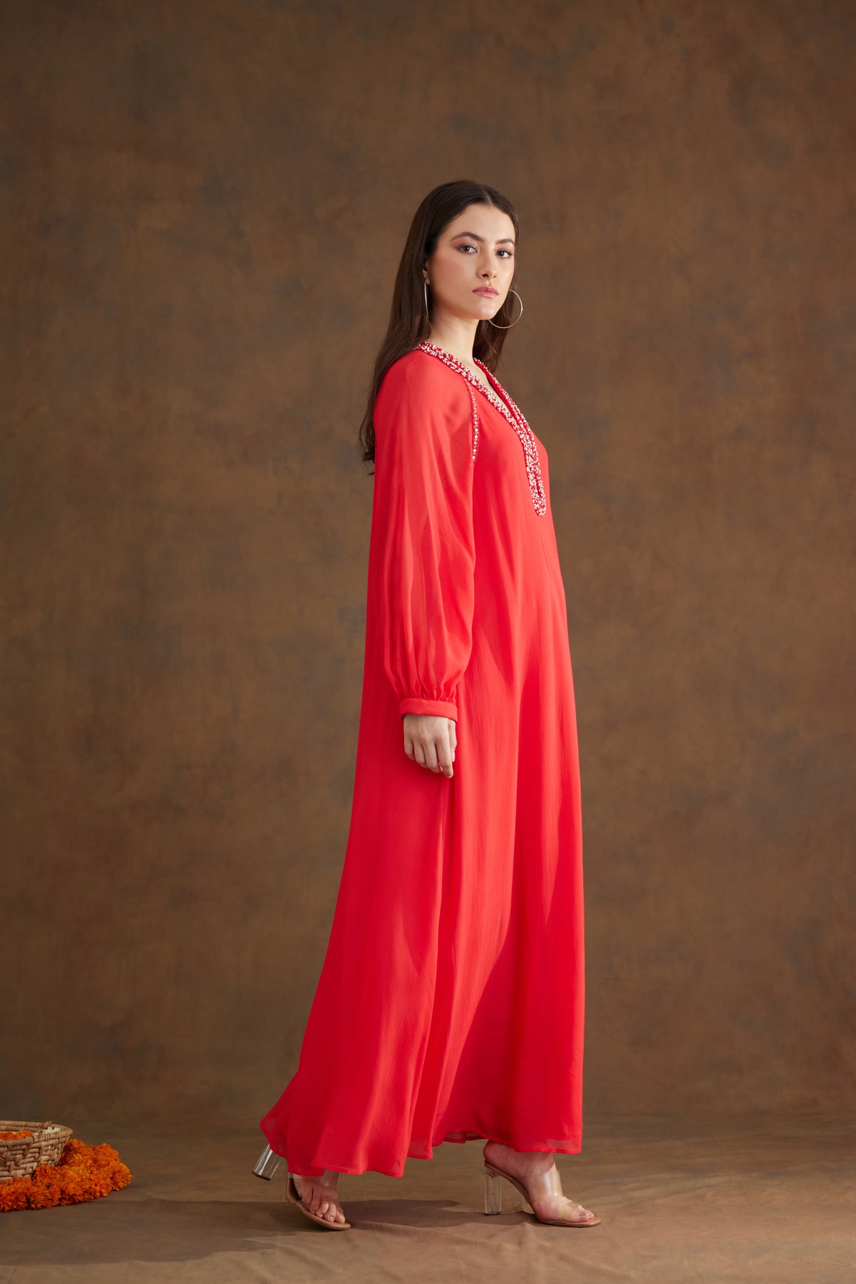 Featuring Coral maxi dress in 100% Viscose georgette with bead and crouching details on the neckline and handmade tassels detailing.