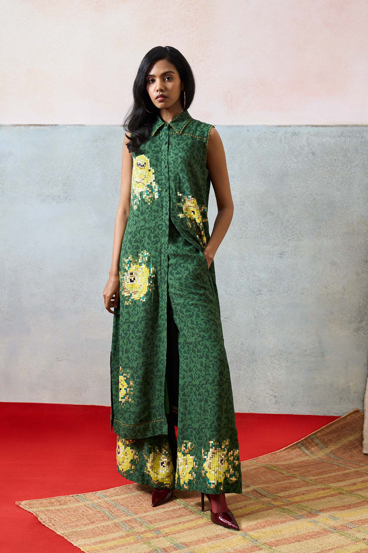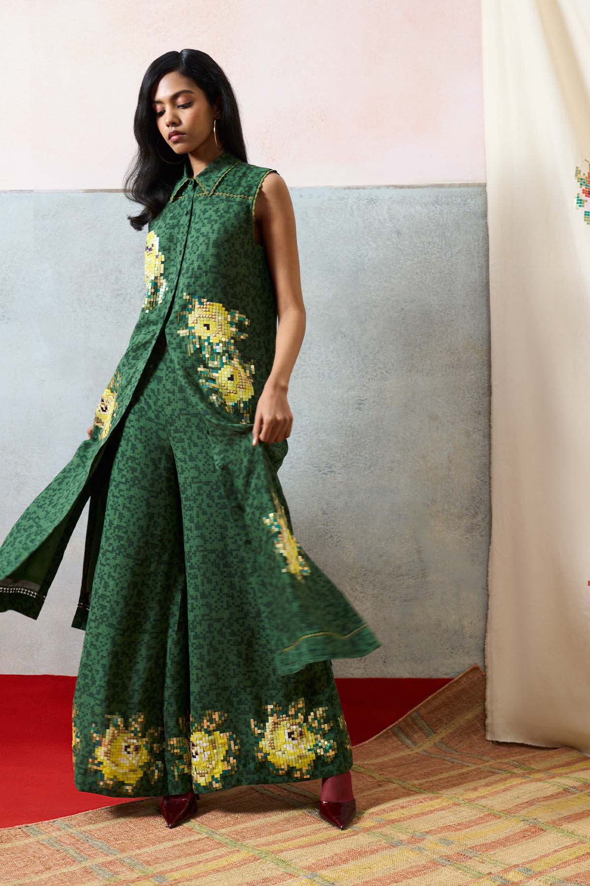 Crafted in double georgette, the corsica pants in green feature a full-length, flared silhouette designed for a clean, elongated fit. The hem is adorned with delicate french rose motifs, intricately finished with our signature sequin detailing.