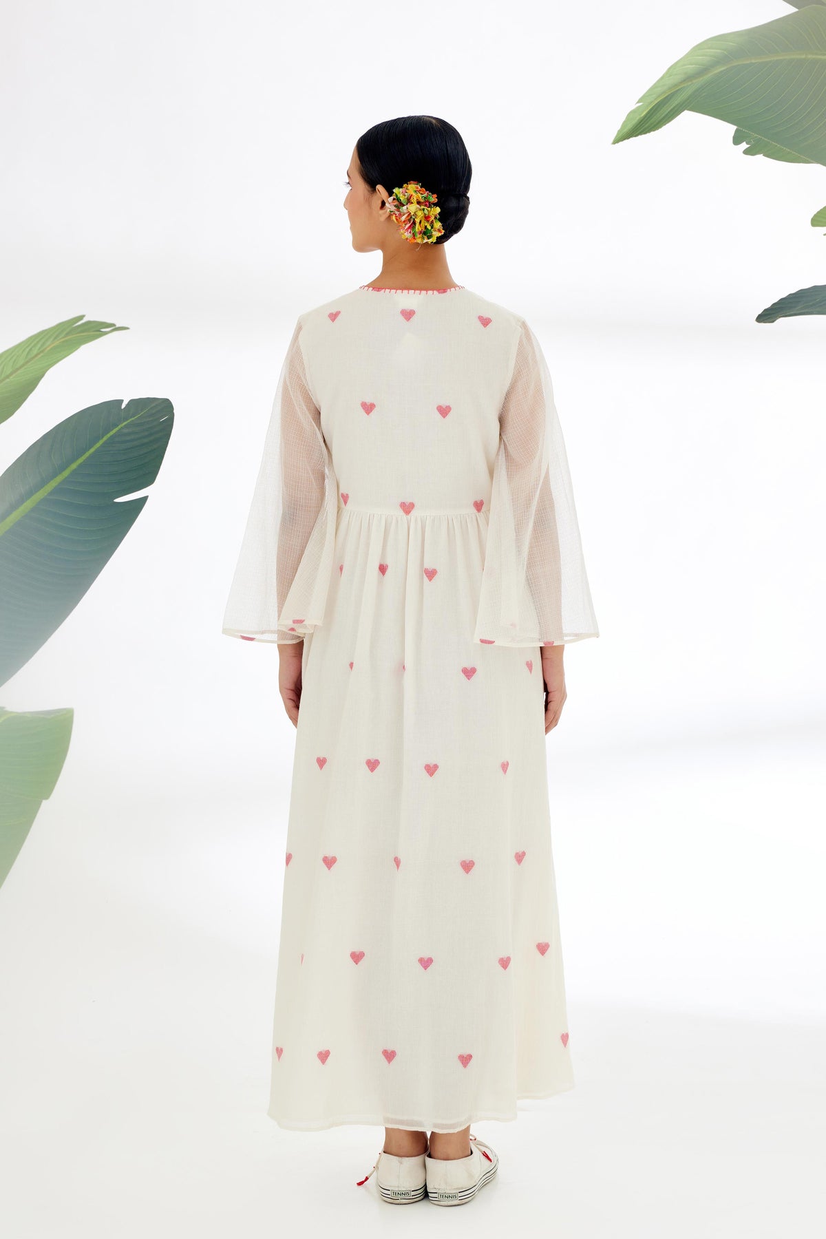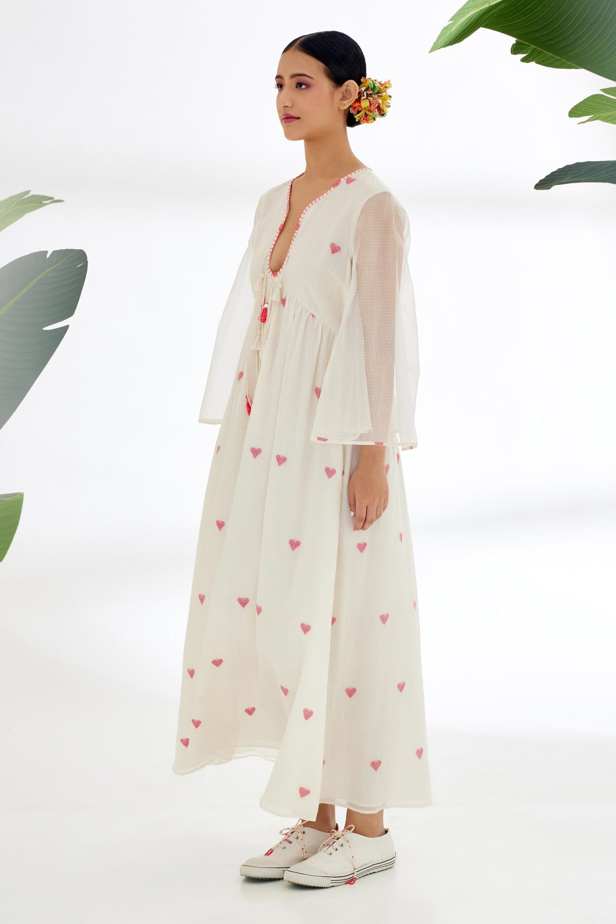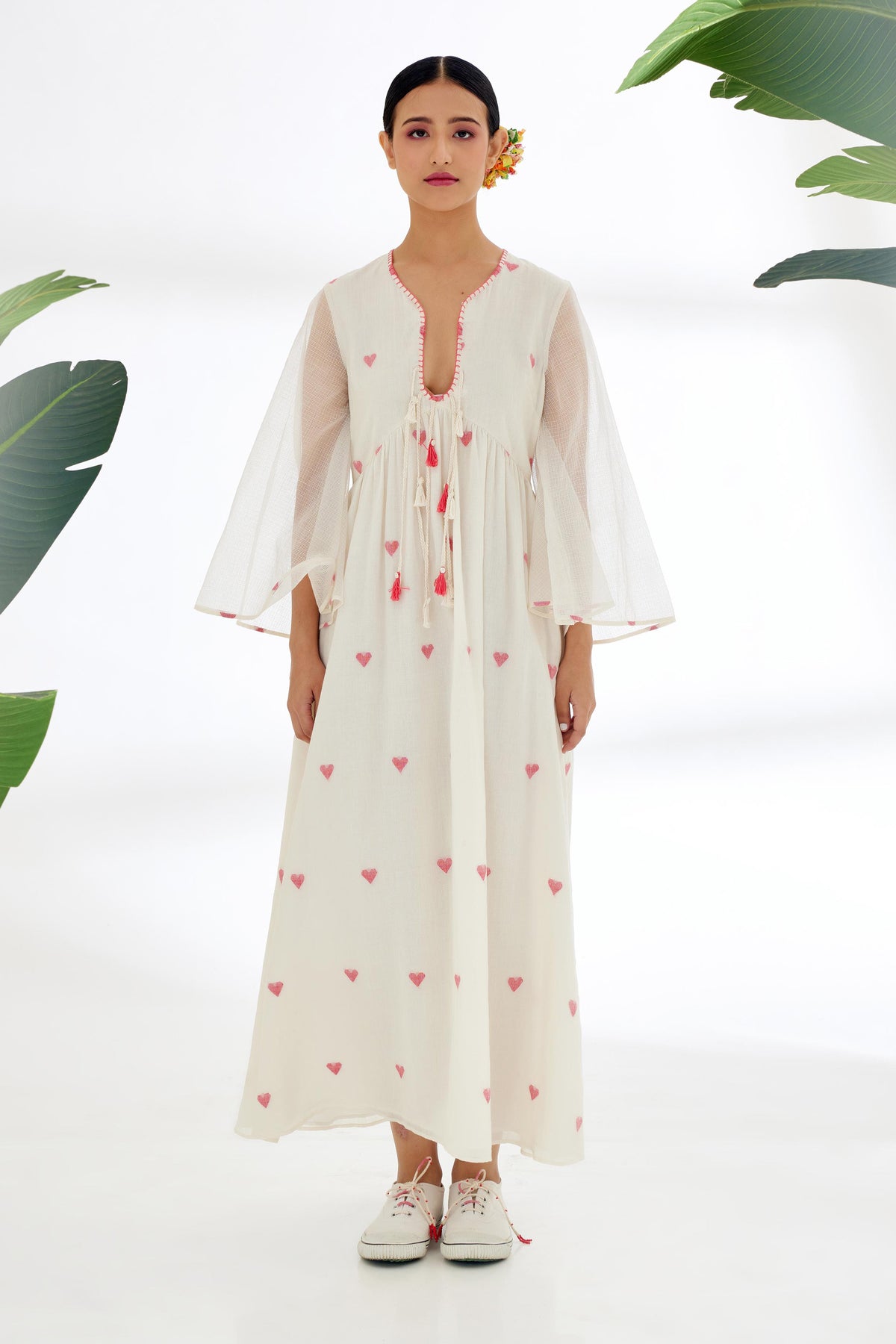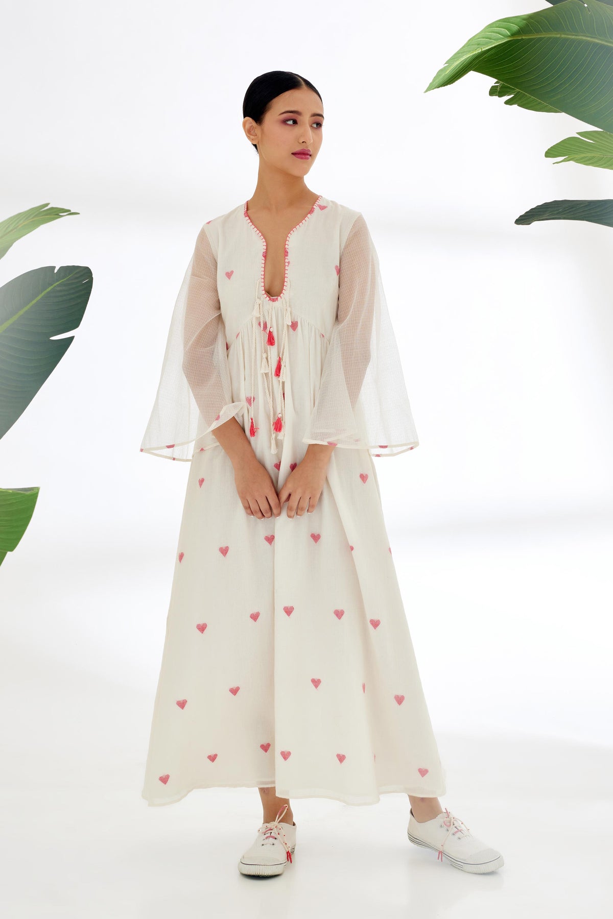 Cream hand braided tassel detail on the neckline dress in hand woven heart jamdani.